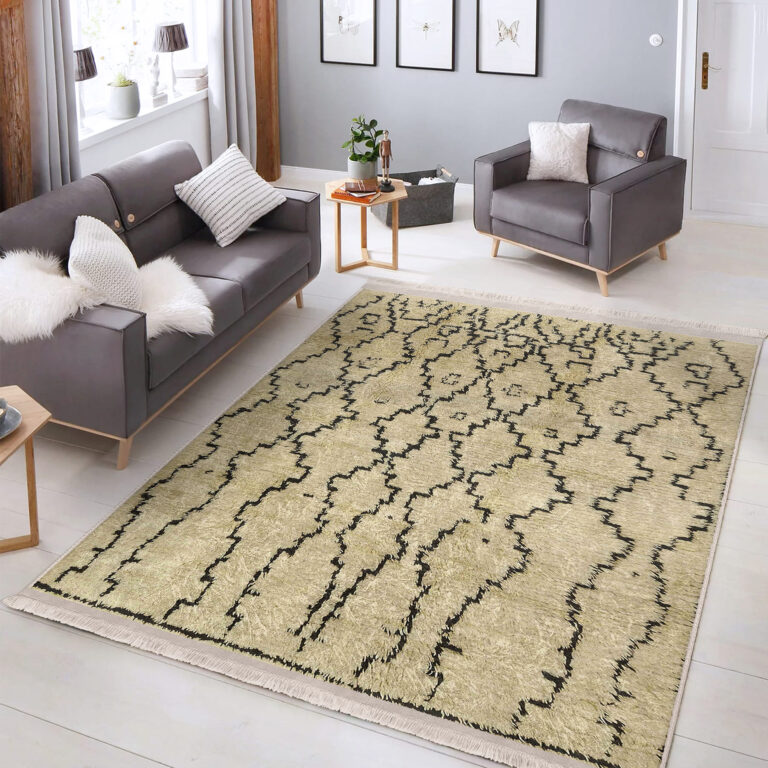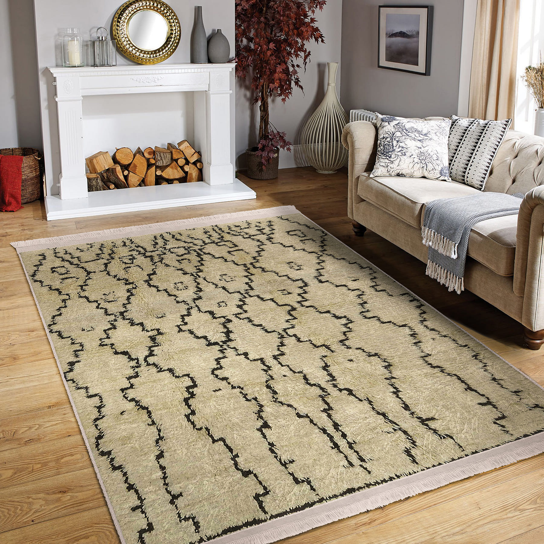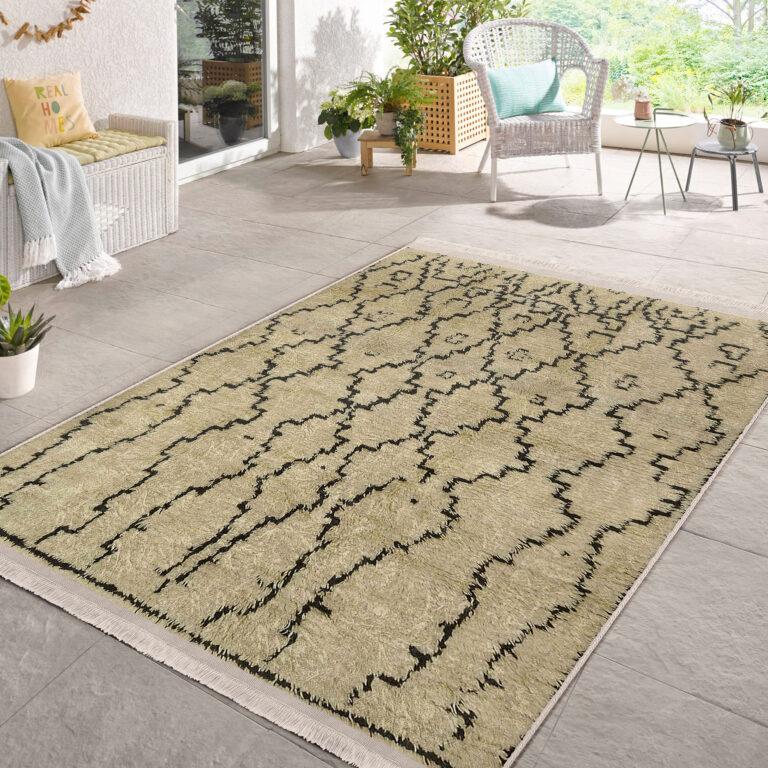 Krem – Siyah Zeminde Kilim Motifli El Dokuma Desenli Etnik Motifler Eskitme Motifli Dış Mekan & Outdoor Salon & Oturma Odası Dijital Baskılı Makinede Yıkanabilir Kaymaz Taban Saçaklı Halı