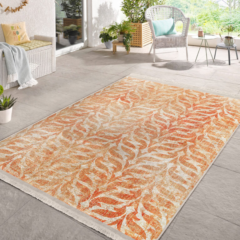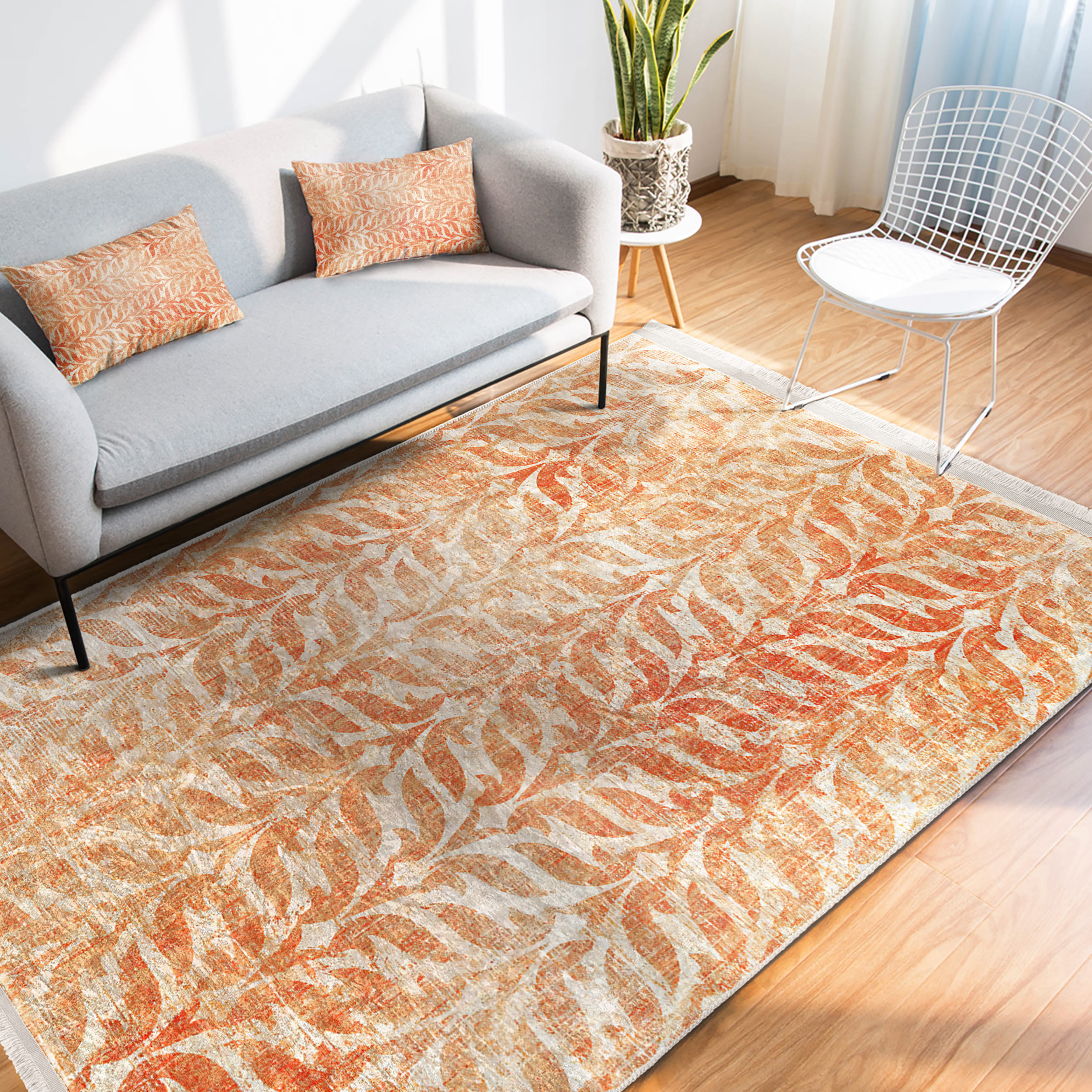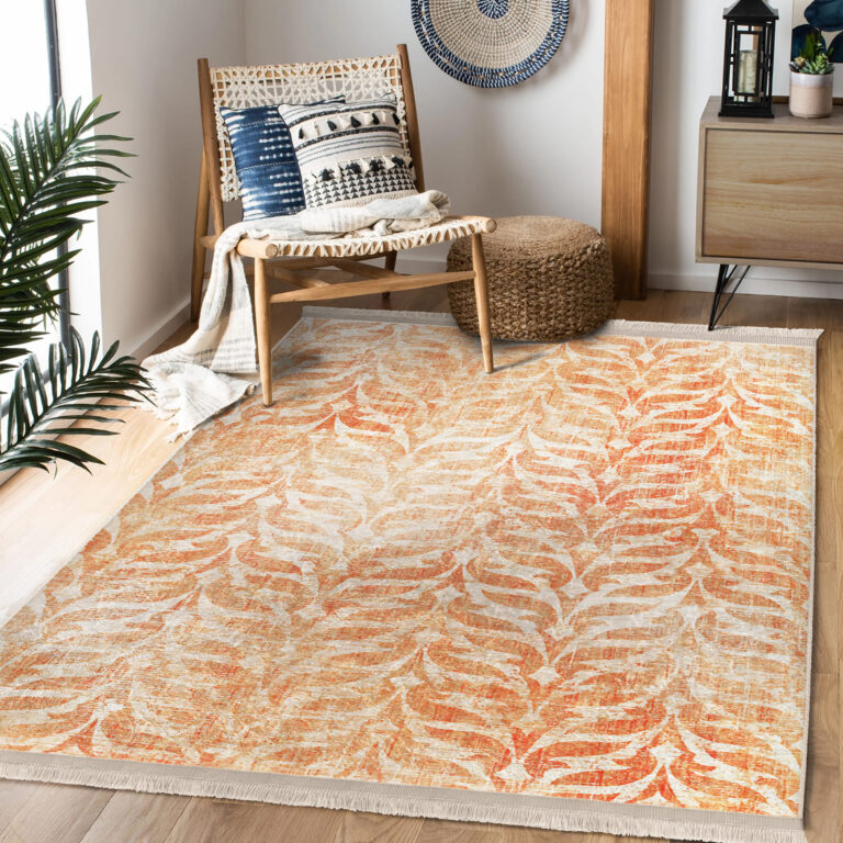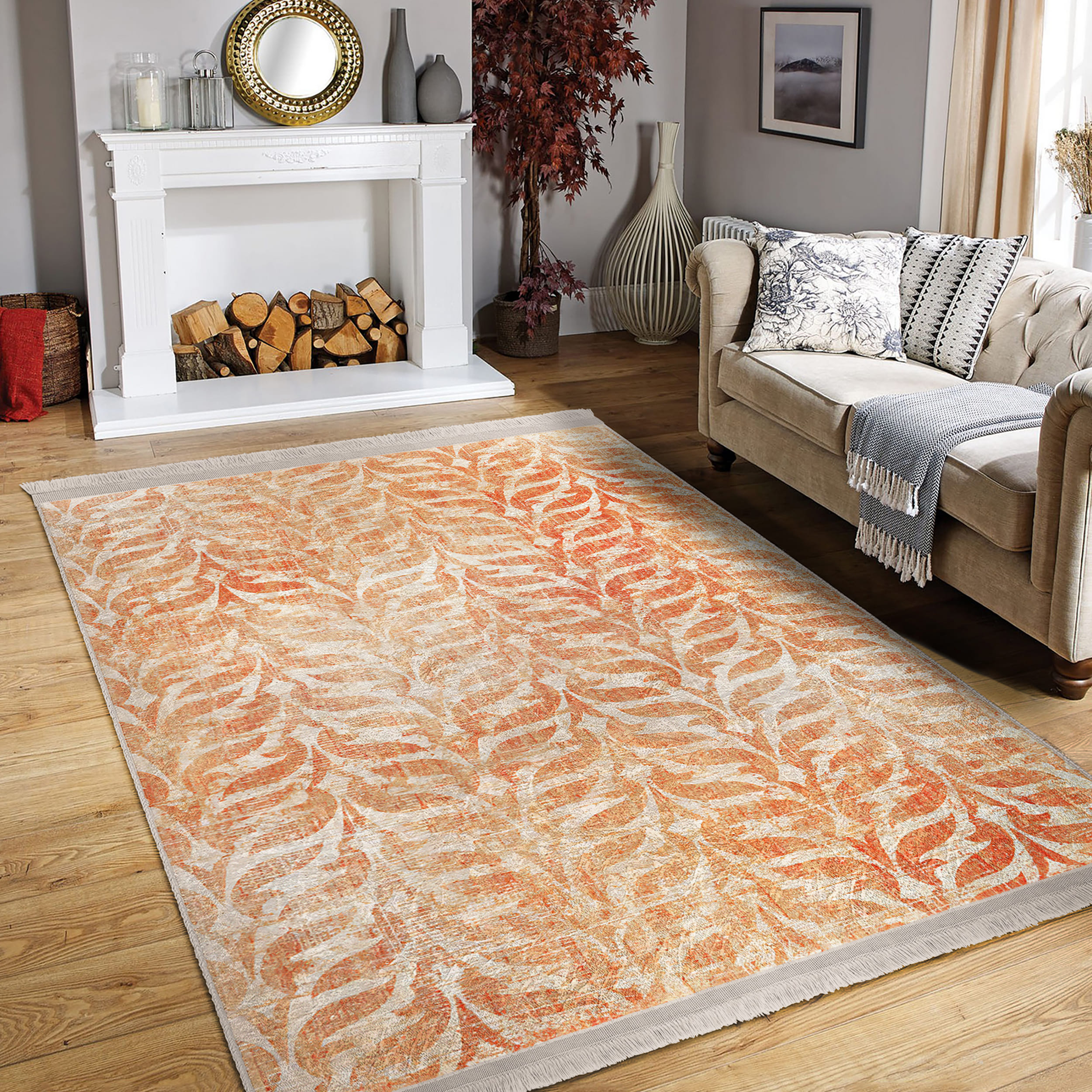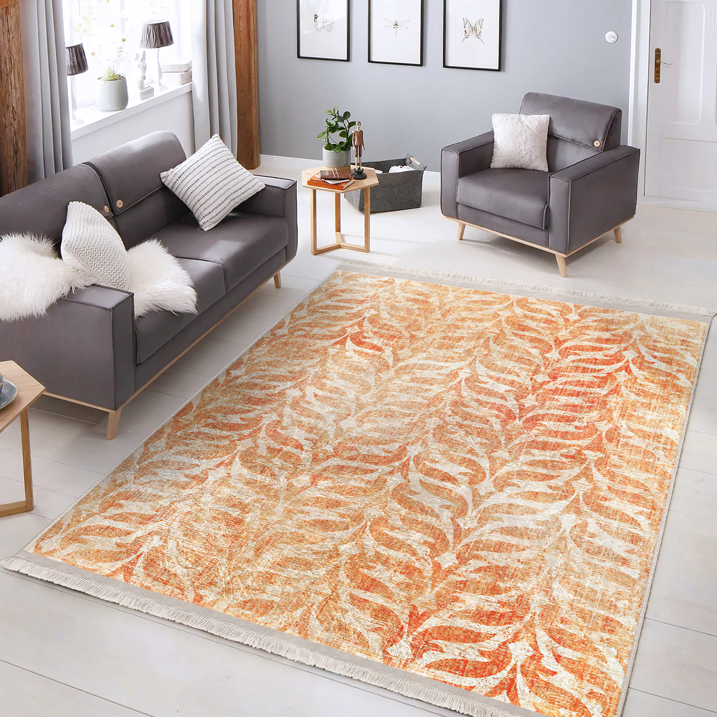 Krem Zemin Üzerinde Turuncu Dal Motifli Şık Salon Halısı – Makinede Yıkanabilir Kaymaz Tabanlı Dikdörtgen Halı