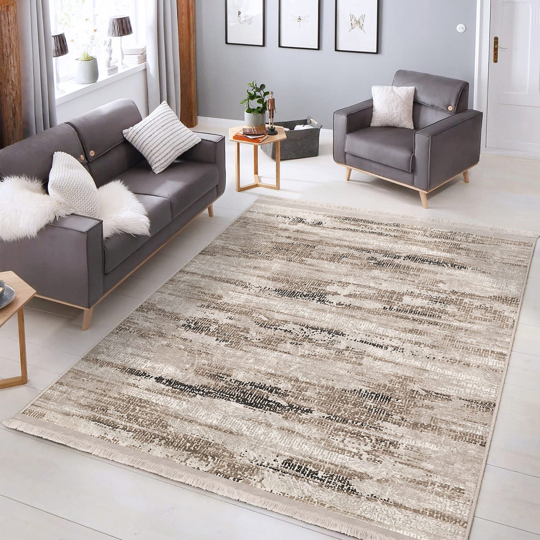 Krem Zeminde Kilim Motifli Örgü Desenli Eskitme Motifli Vintage Salon & Oturma Odası Dış Mekan & Outdoor Dijital Baskılı Makinede Yıkanabilir Kaymaz Taban Saçaklı Halı