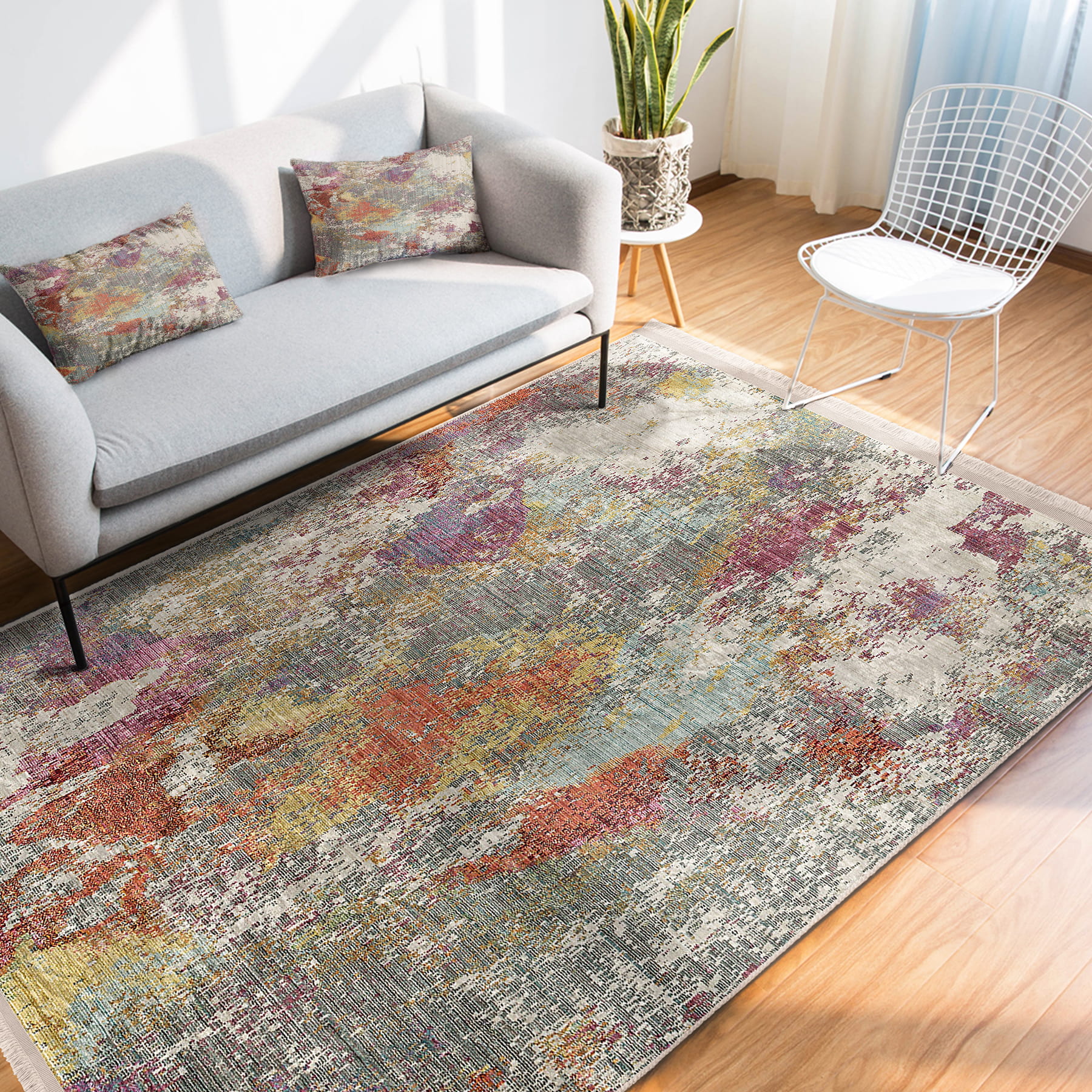 Krem Zeminde Örgü Motifli Kilim Desenli Eskitme Motifli Modern Salon & Oturma Odası Yatak Odası Dijital Baskılı Makinede Yıkanabilir Kaymaz Taban Saçaklı Halı