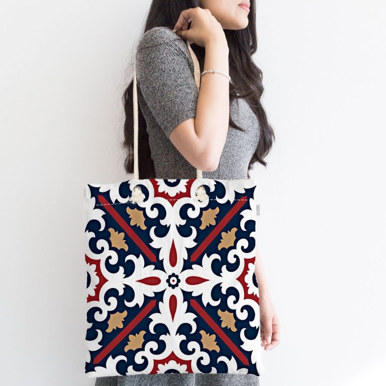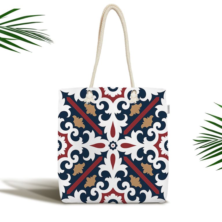 Lacivert Bordo Damask Motifli Modern Fermuarlı Kumaş Plaj Çantası