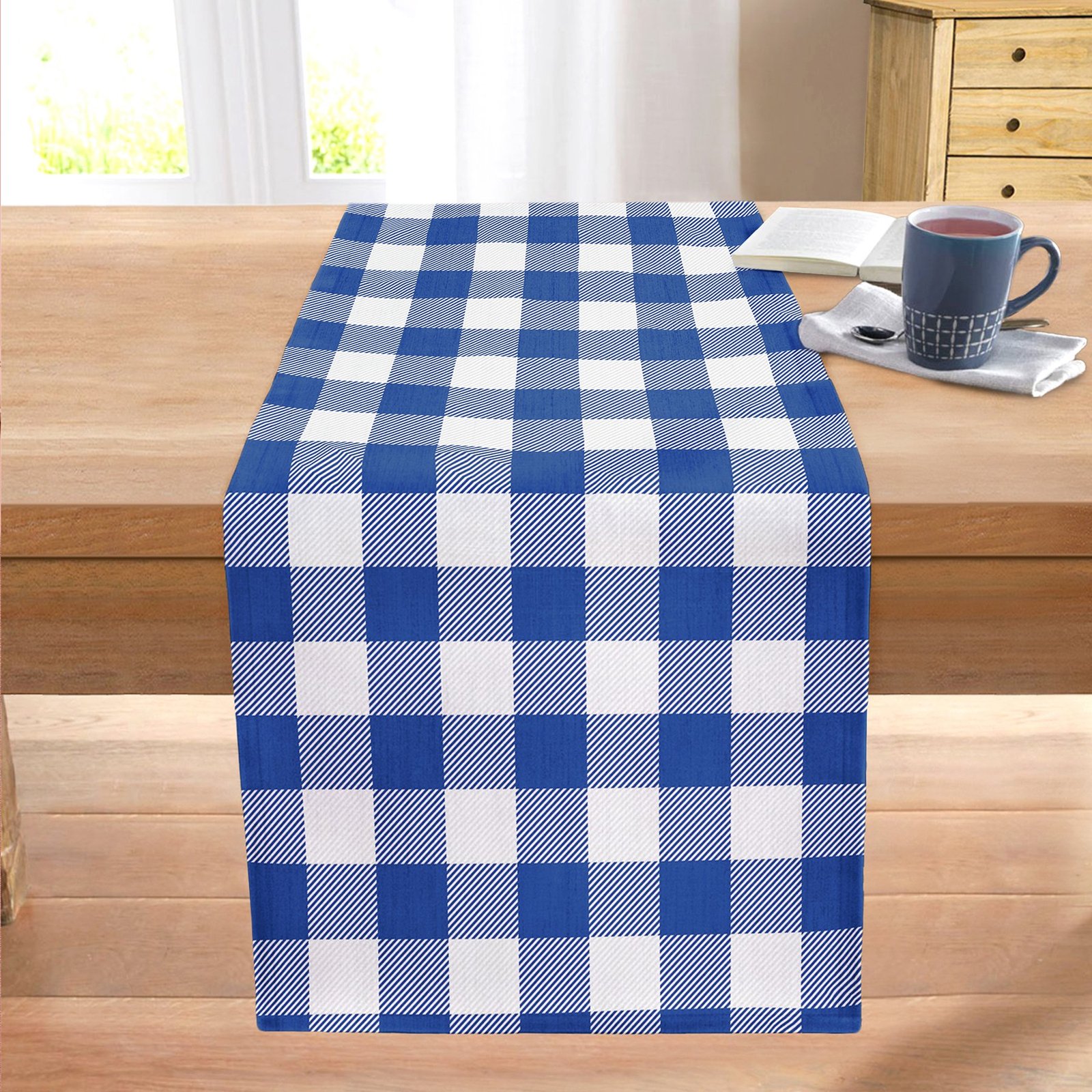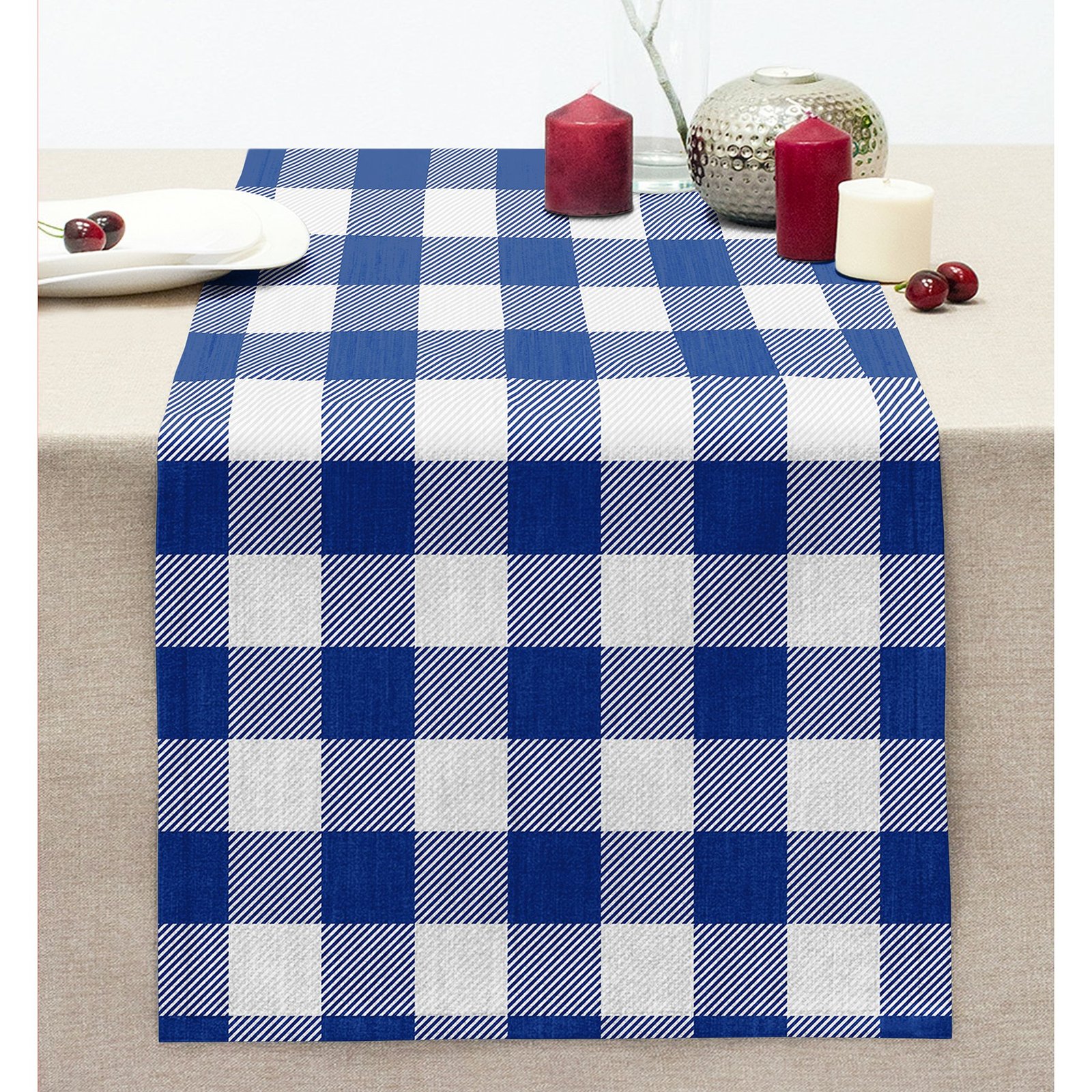 Lacivert Ekose Tasarımlı Dijital Baskılı Modern Dikişli Şönil Runner