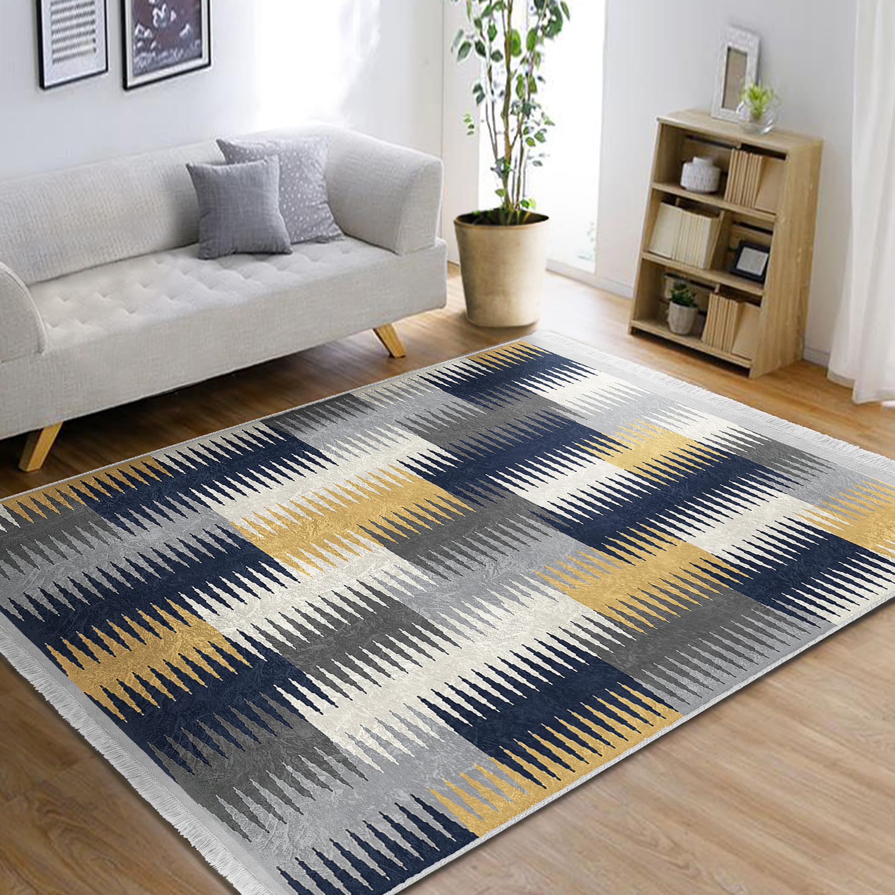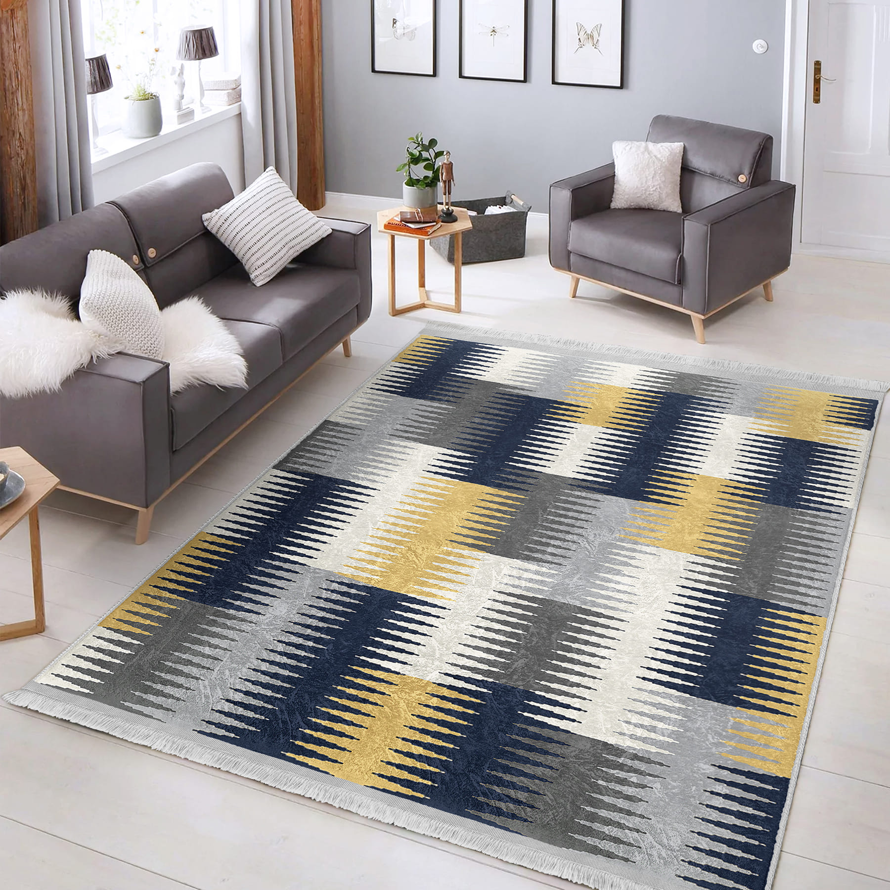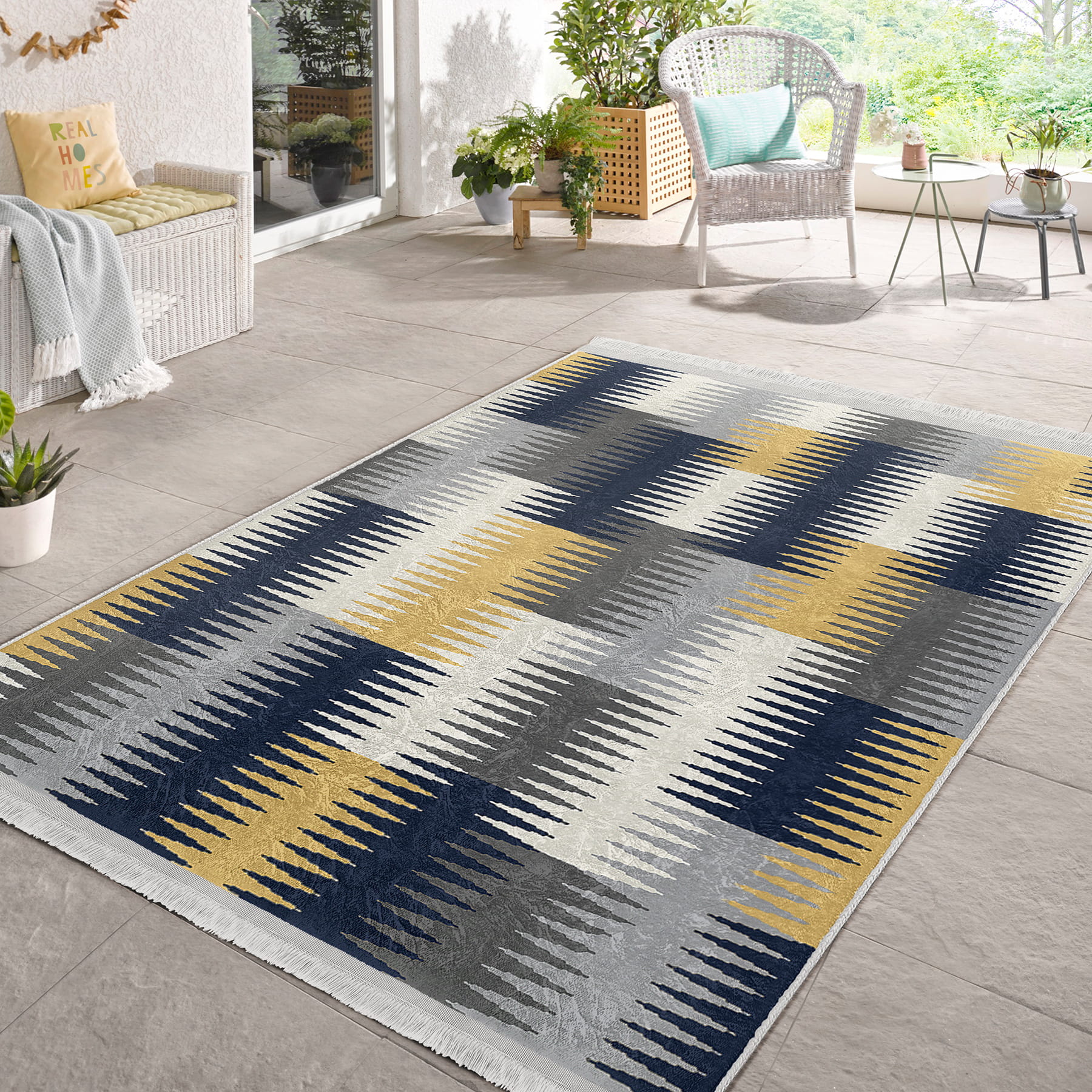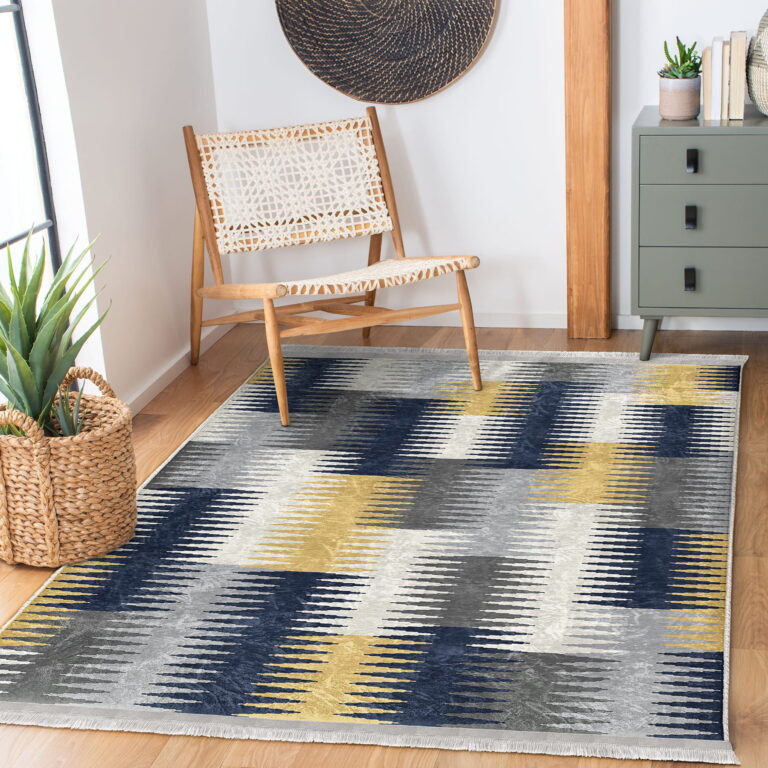 Lacivert – Sarı Zeminde Geometrik Motifli Klasik Desenli Geometrik Sade & Şık Koridor & Antre Salon & Oturma Odası Dijital Baskılı Makinede Yıkanabilir Kaymaz Taban Saçaklı Halı