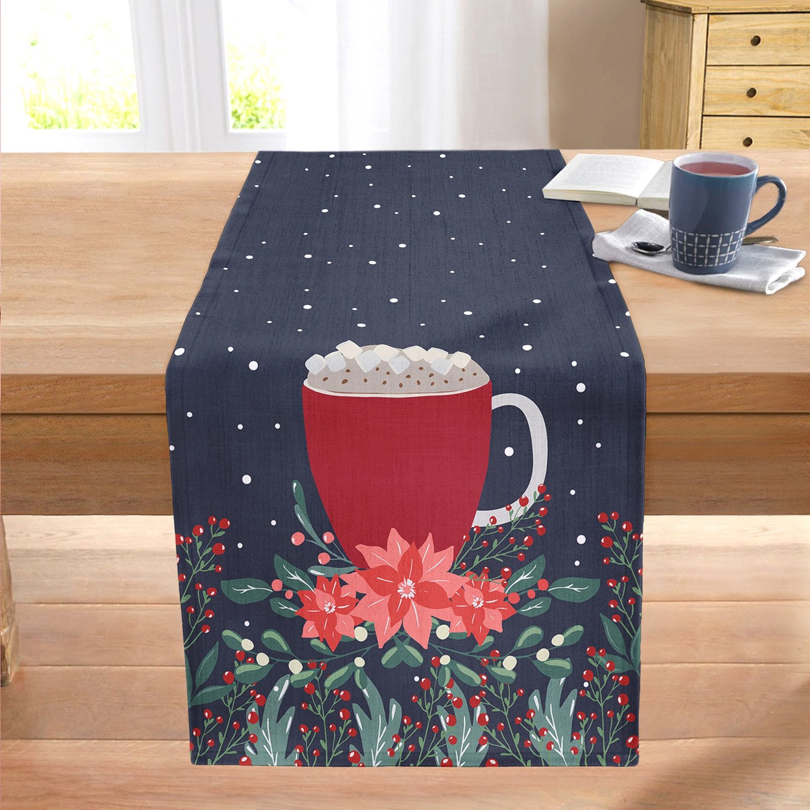 Lacivert Zemin Kırmızı Bardak Desenli Dijital Baskılı Modern Dikişli Şönil Runner