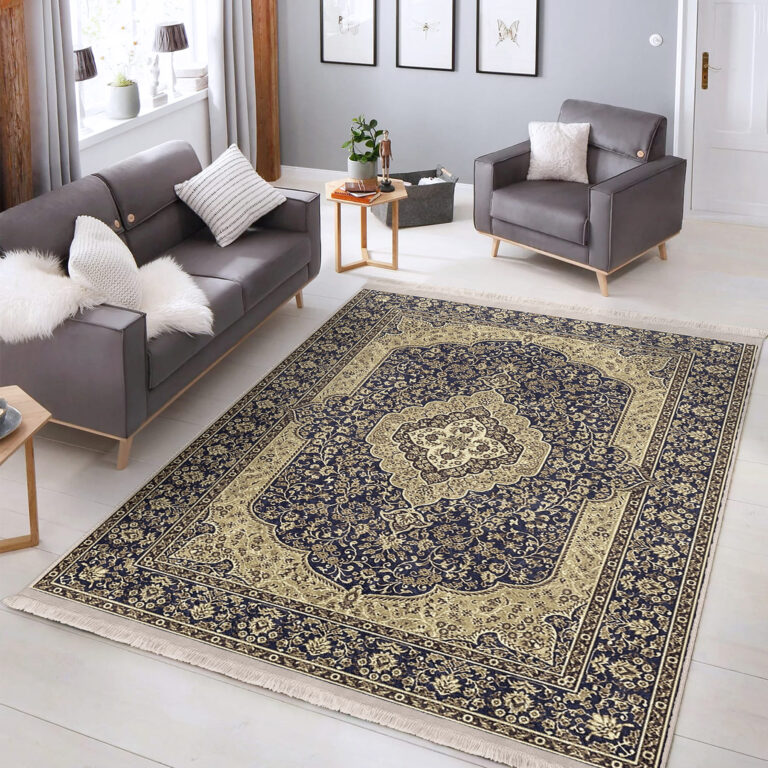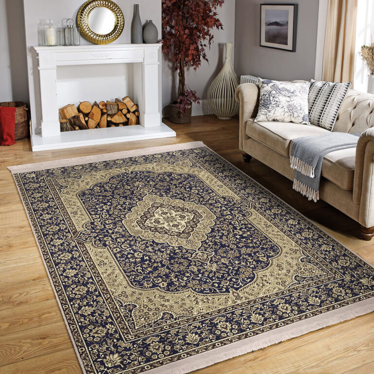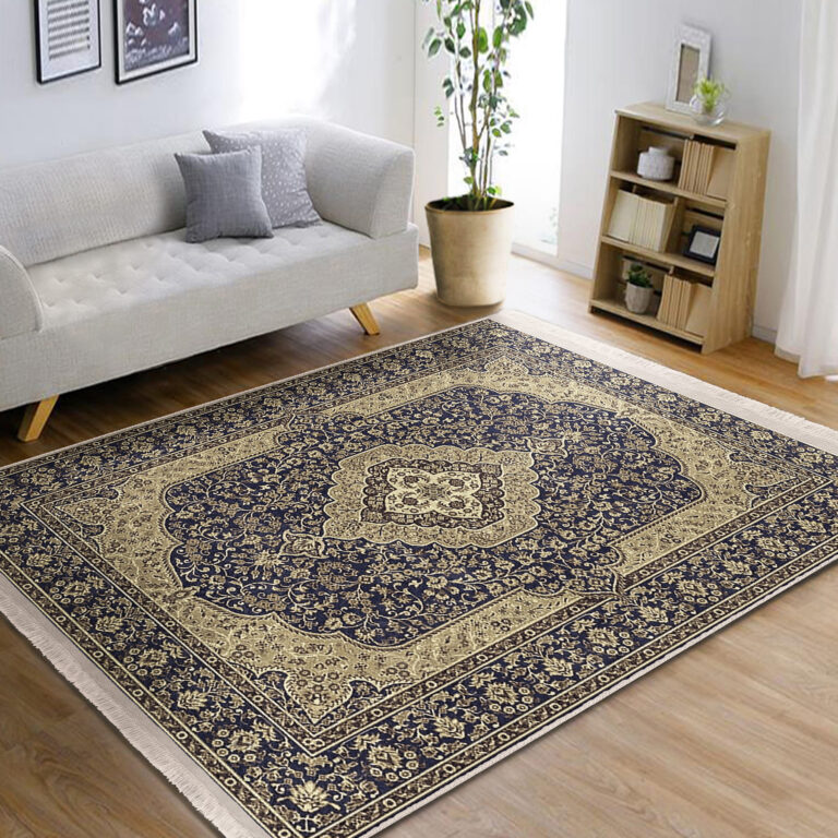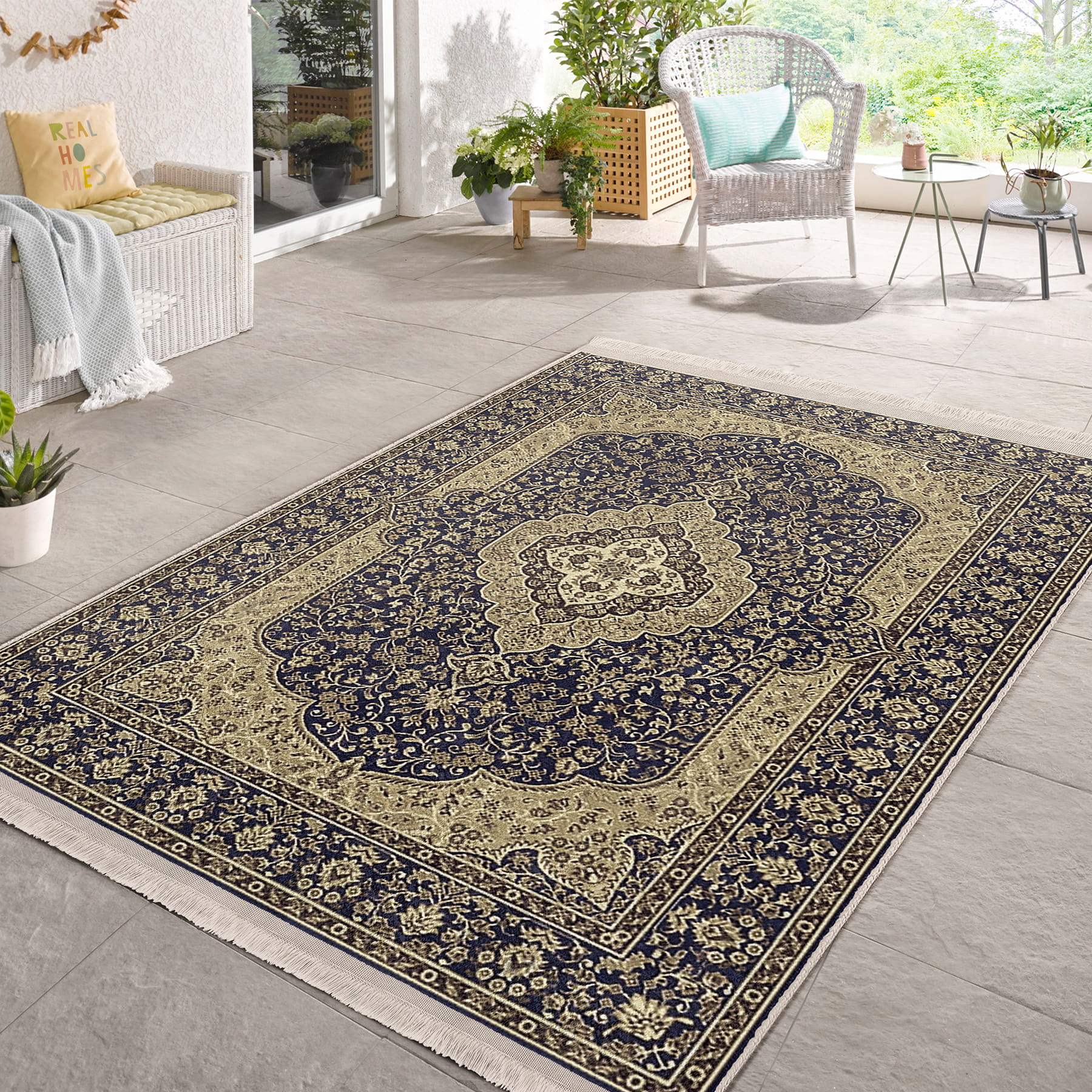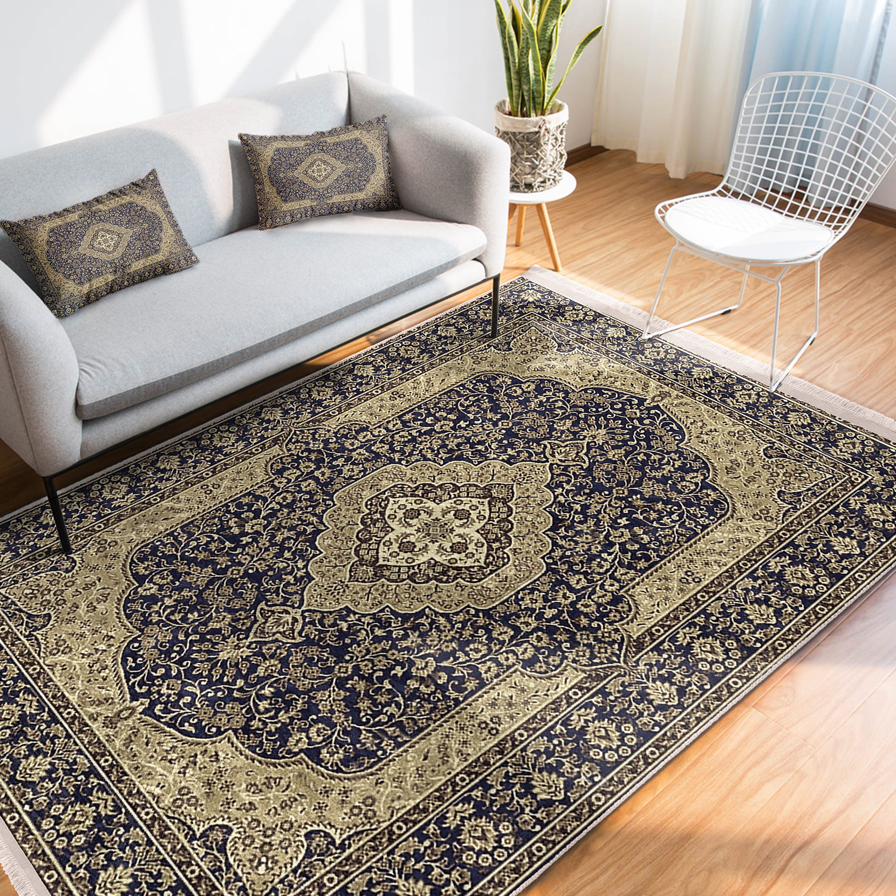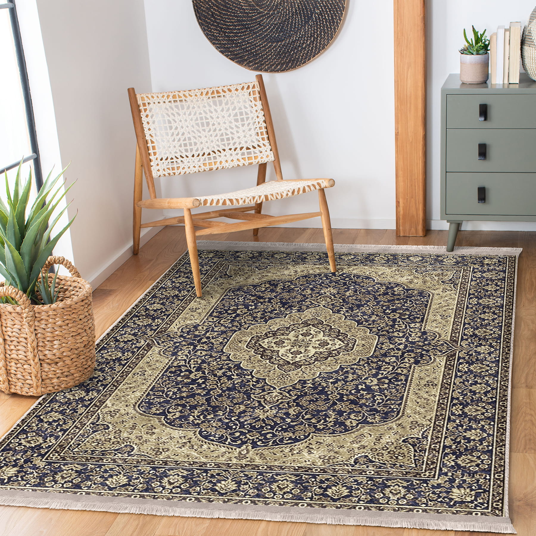 Lacivert Zeminde Uşak Motifli Geleneksel Desenli Avangarde Etnik Motifler Yatak Odası Salon & Oturma Odası Dijital Baskılı Makinede Yıkanabilir Kaymaz Taban Saçaklı Halı