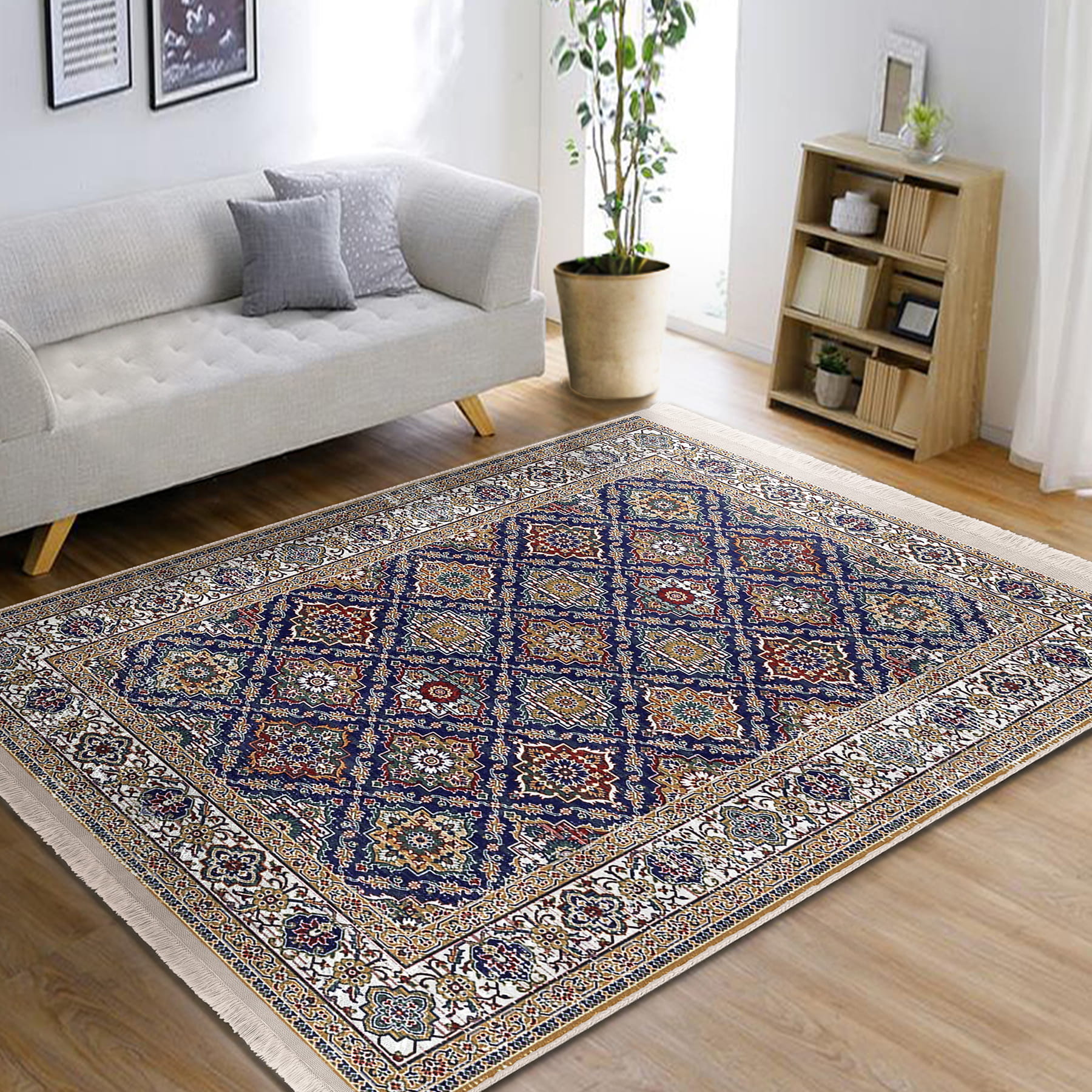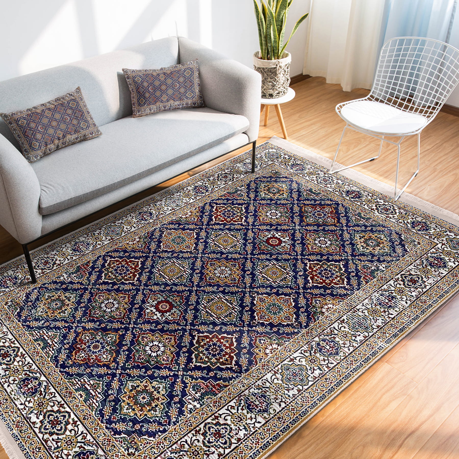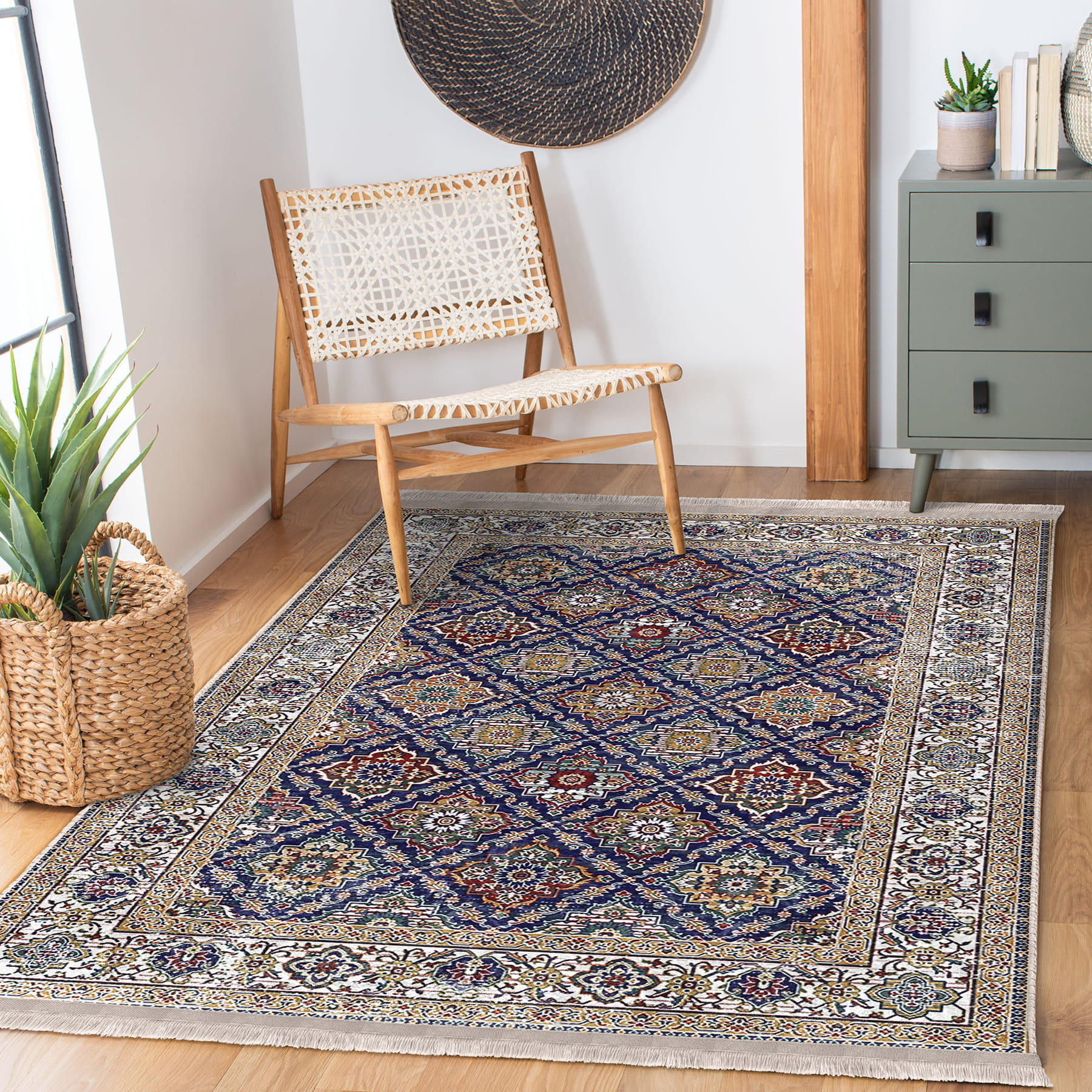 Lacivert Zeminde Uşak Motifli Geleneksel Desenli Vintage Avangarde Salon & Oturma Odası Yatak Odası Dijital Baskılı Makinede Yıkanabilir Kaymaz Taban Saçaklı Halı