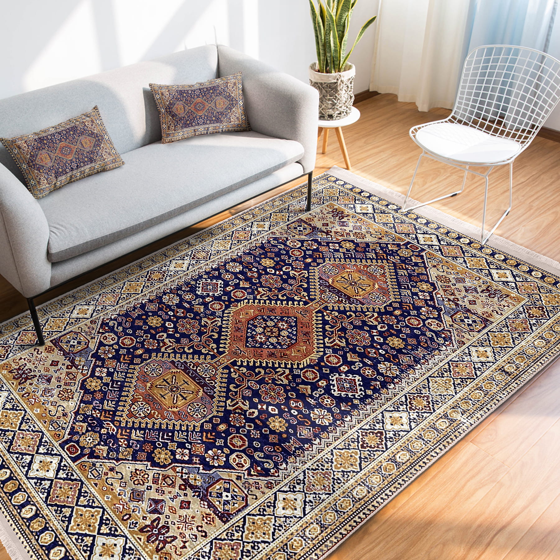 Lacivert Zeminde Uşak Motifli Kilim Desenli Avangarde Vintage Salon & Oturma Odası Yatak Odası Dijital Baskılı Makinede Yıkanabilir Kaymaz Taban Saçaklı Halı