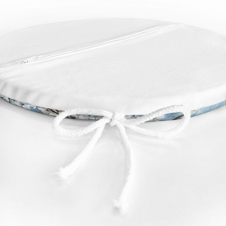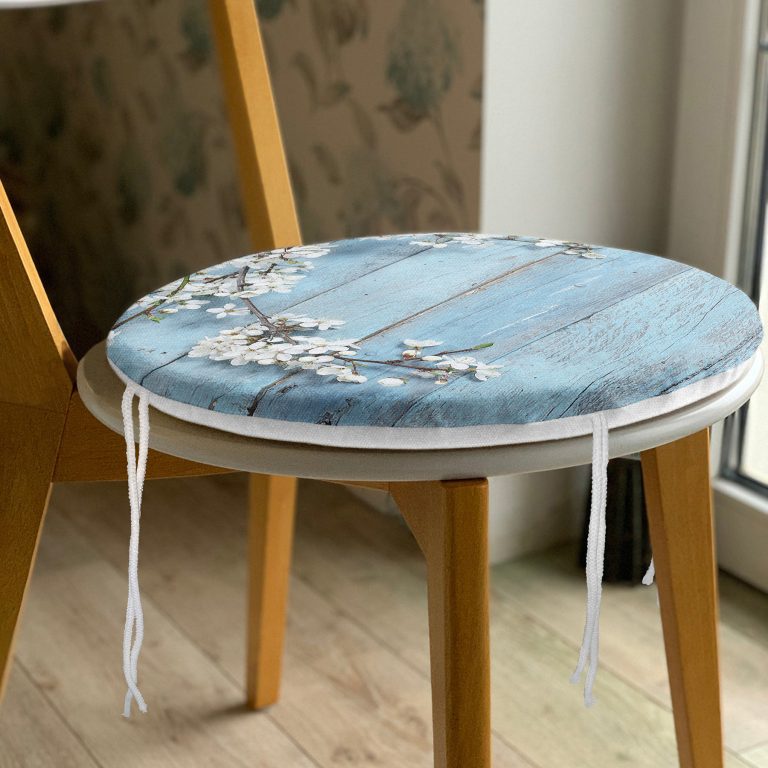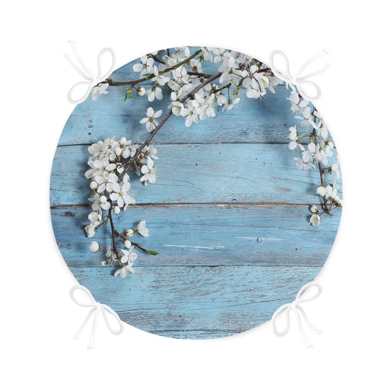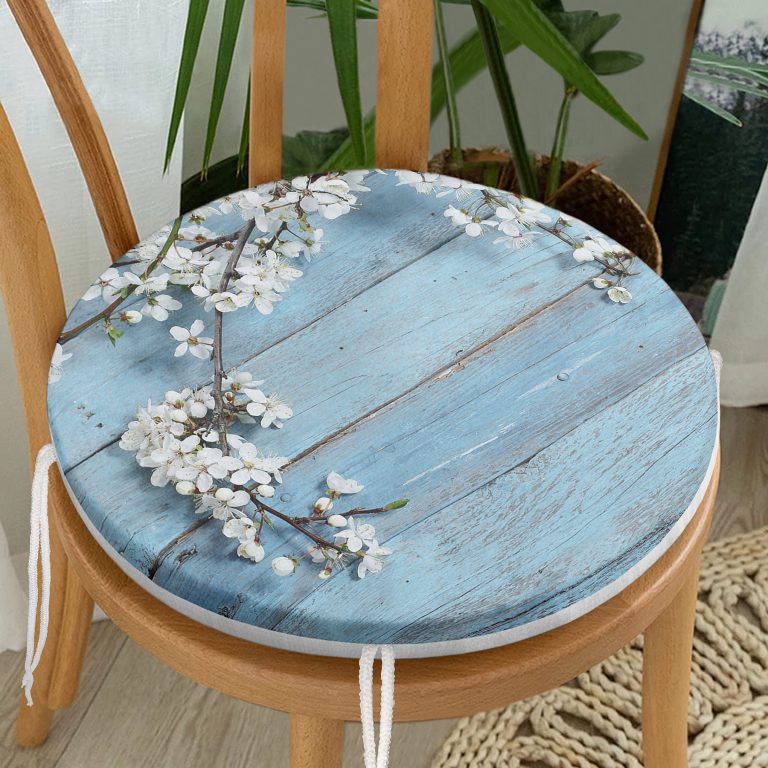 Mavi Ahşap Zeminli Bahar Motifli Yuvarlak Fermuarlı Sandalye Minderi