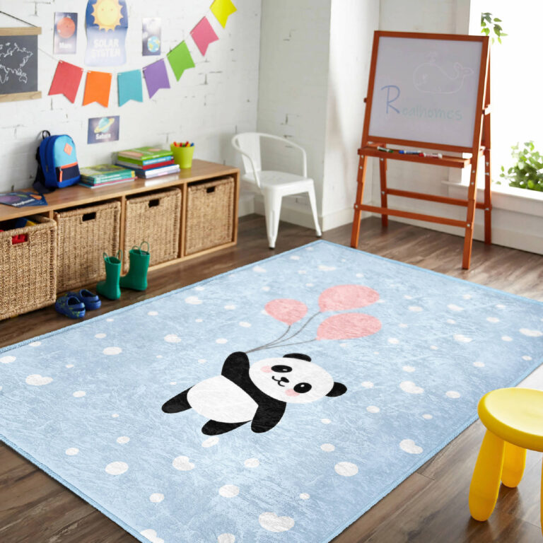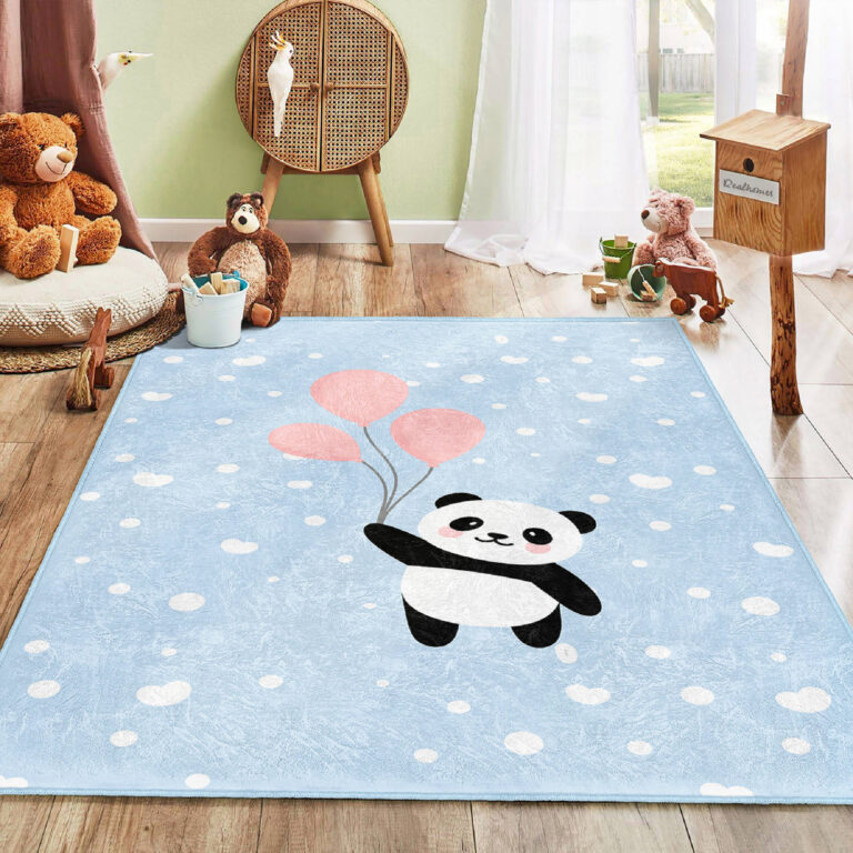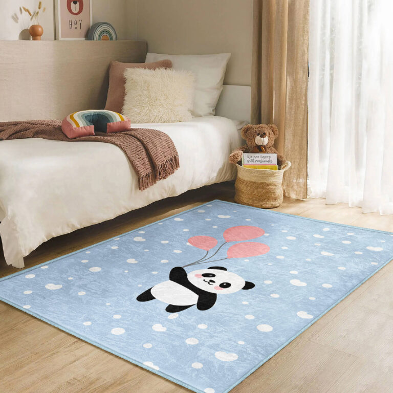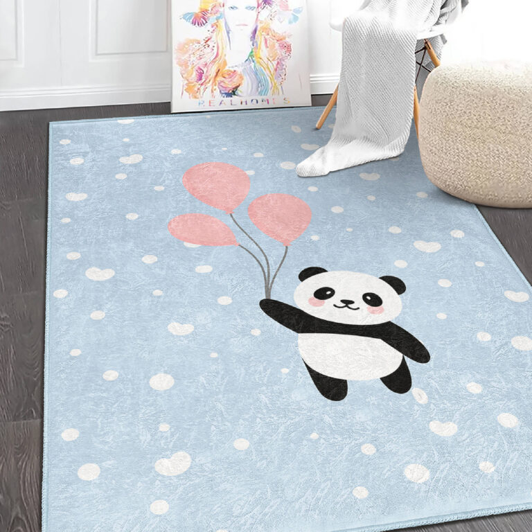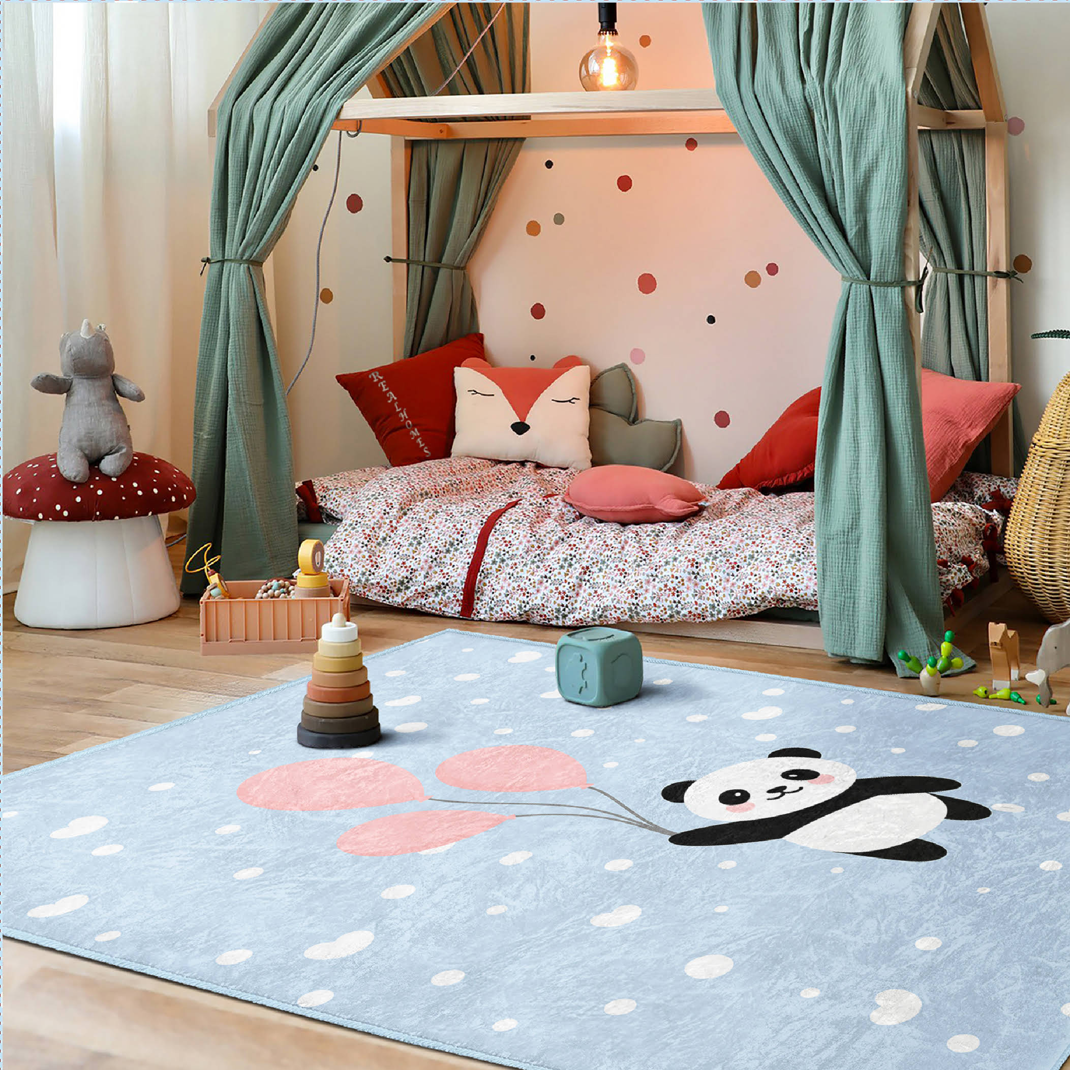 Mavi Arka Planda Sevimli Panda Desenli Yıkanabilir Kaymaz Taban Çocuk Halısı