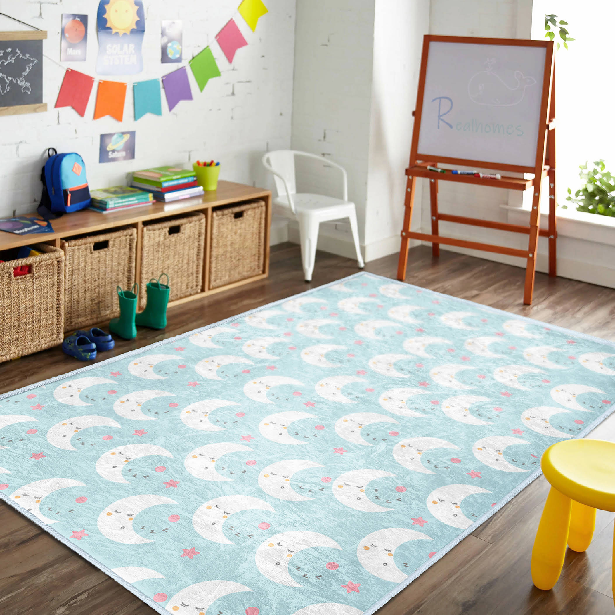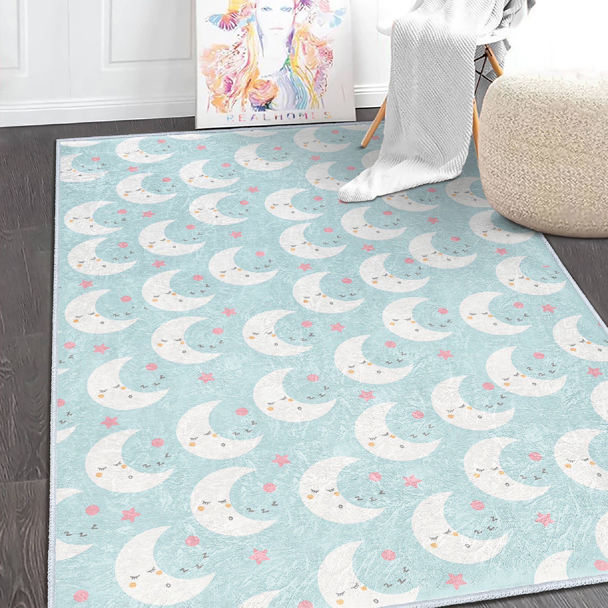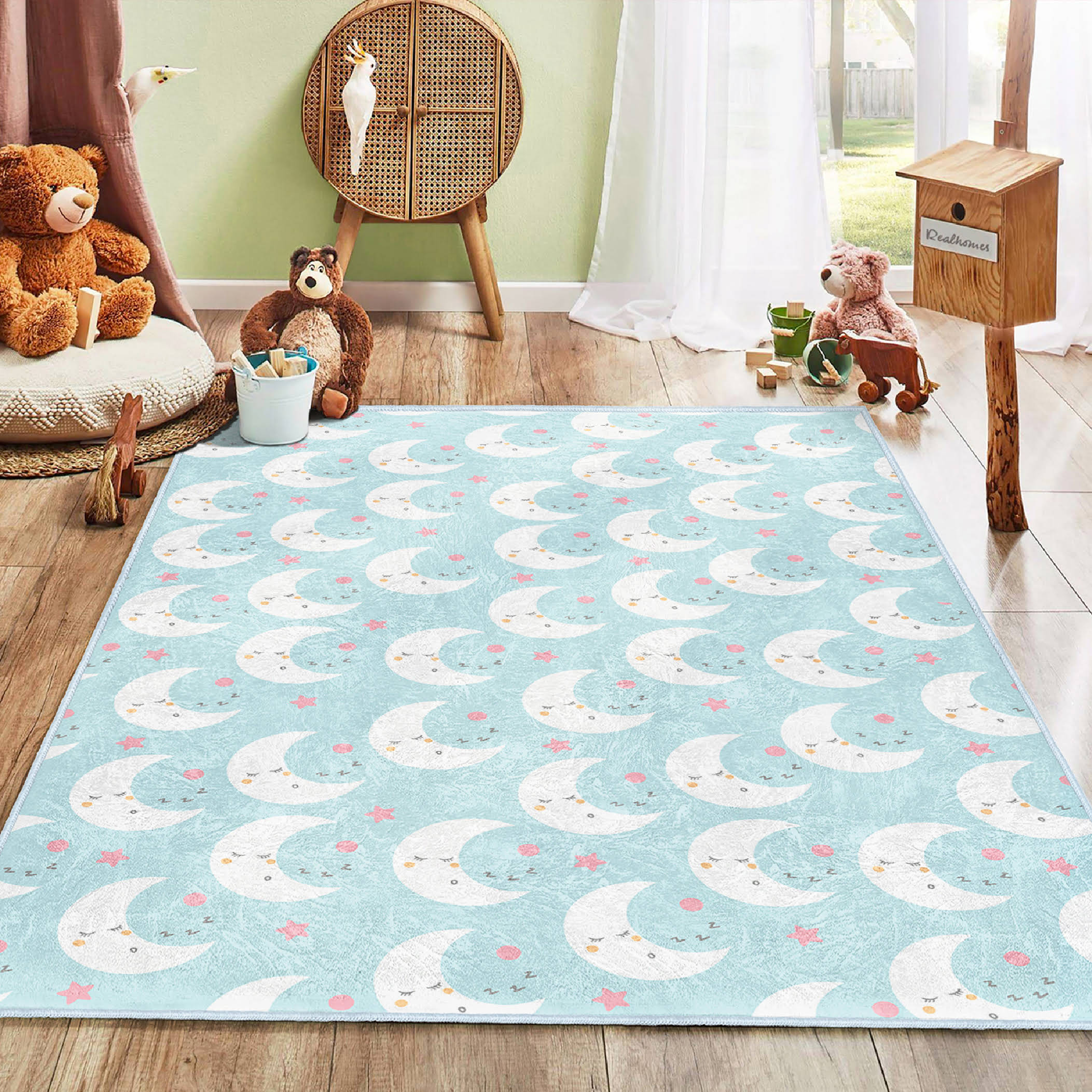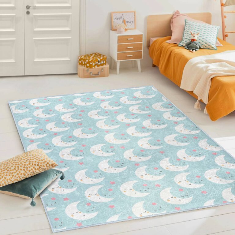 Mavi Arka Planda Uyuyan Ay ve Yıldız Desenli Dikdörtgen Çocuk Halısı – Yıkanabilir Kaymaz Taban