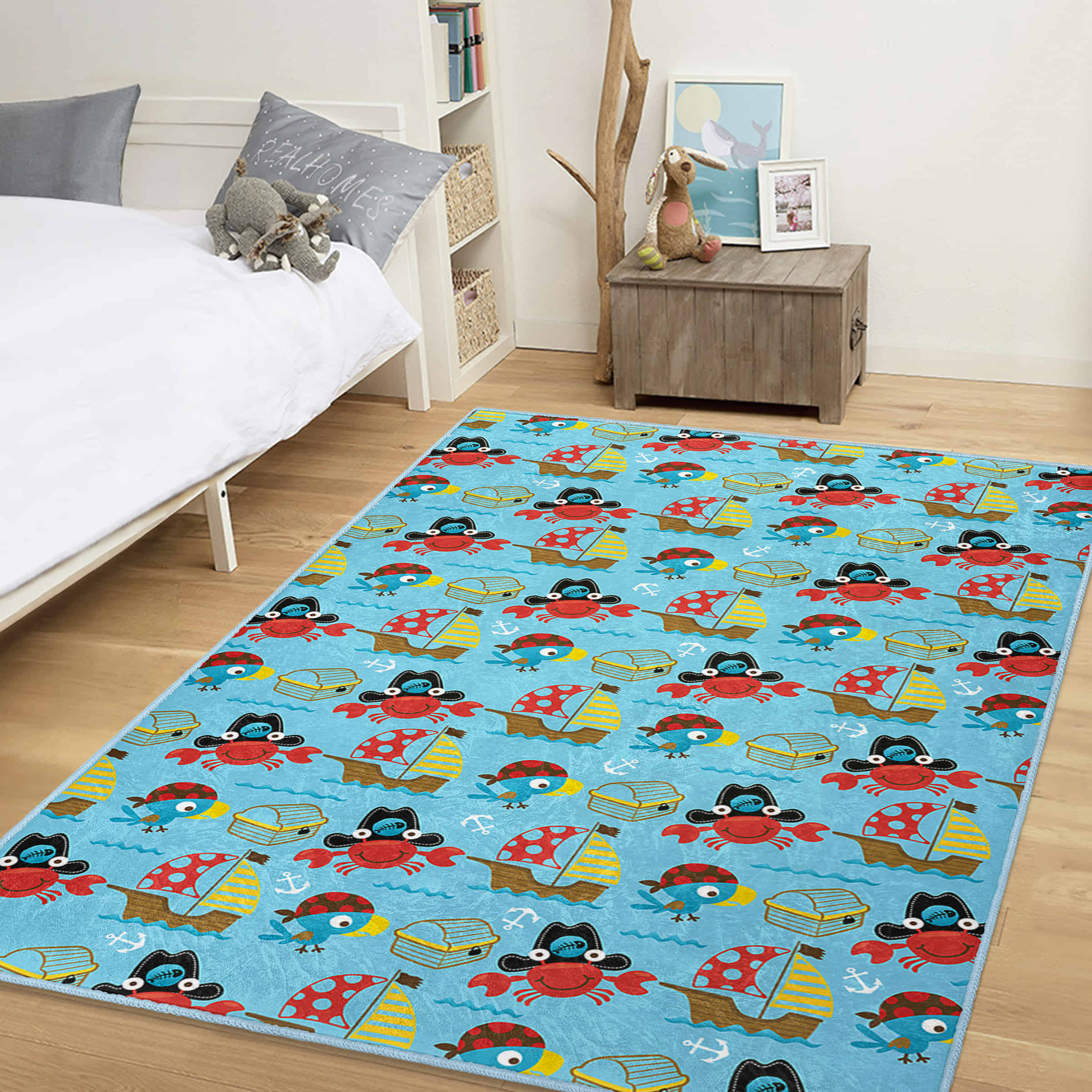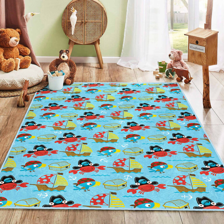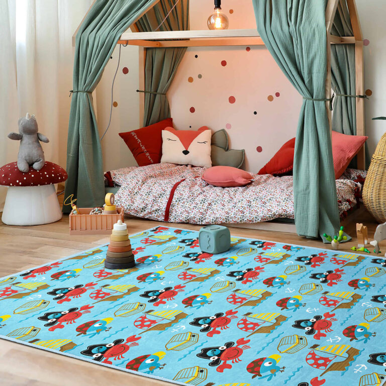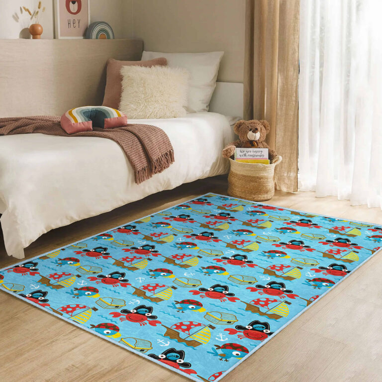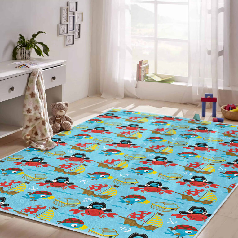 Mavi Arka Planda Yüzme Temalı Çocuk Halısı – Kaymaz Tabanlı ve Yıkanabilir Dikdörtgen Tasarım