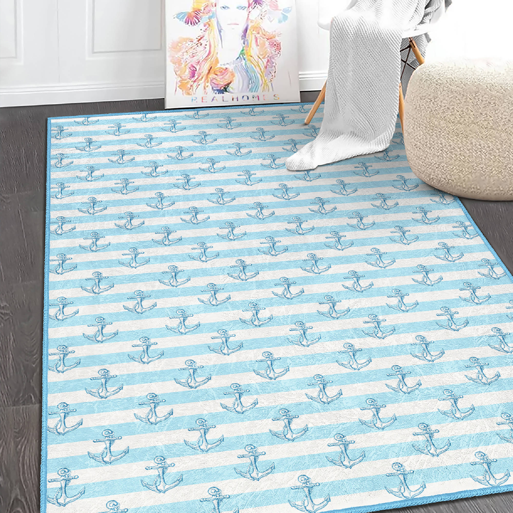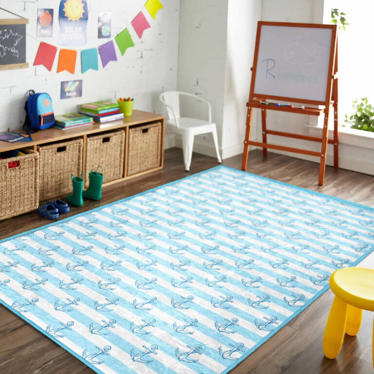 Mavi-Beyaz Çizgili Deniz Temalı Çocuk Halısı – Makinede Yıkanabilir Kaymaz Tabanlı Dikdörtgen Halı