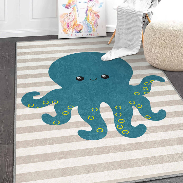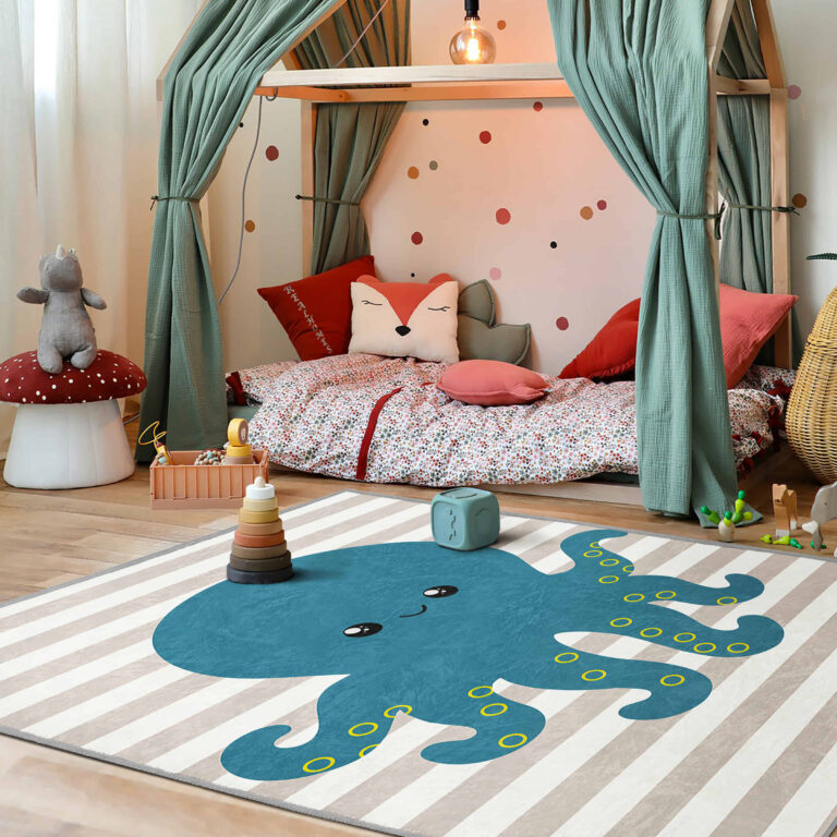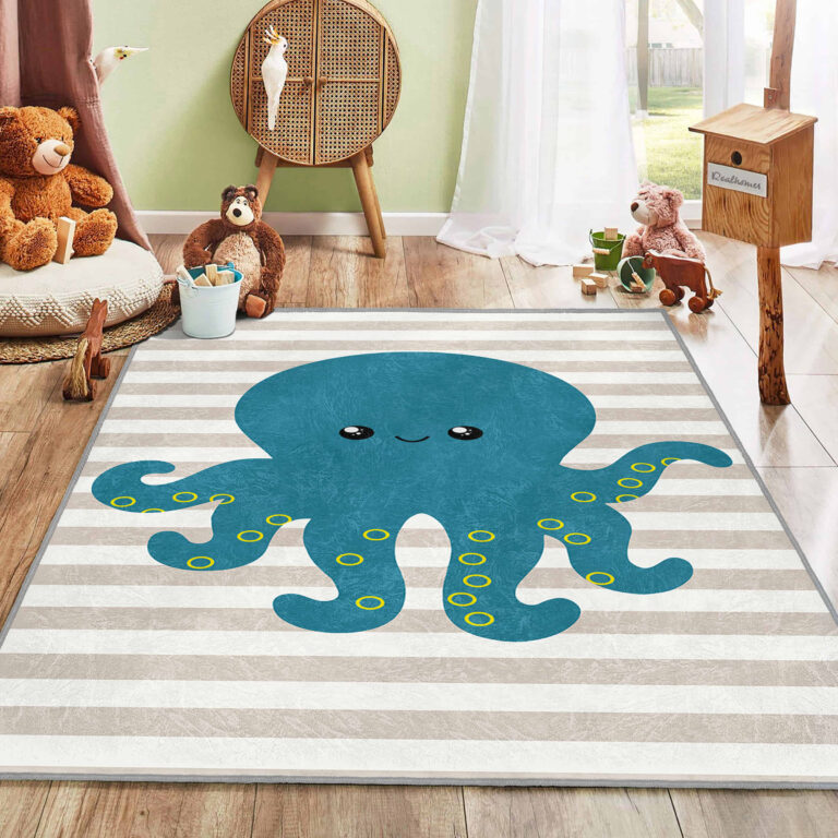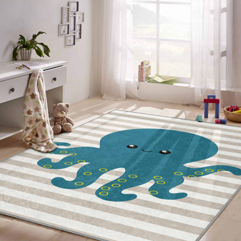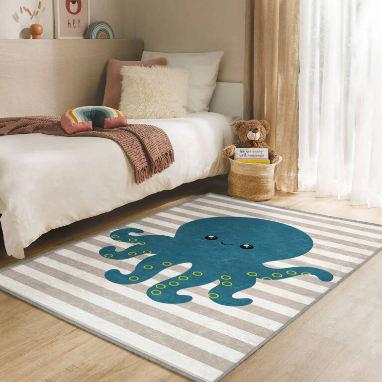 Mavi – Beyaz Çizgili Sevimli Ahtapot Desenli Yıkanabilir Kaymaz Taban Çocuk Halısı
