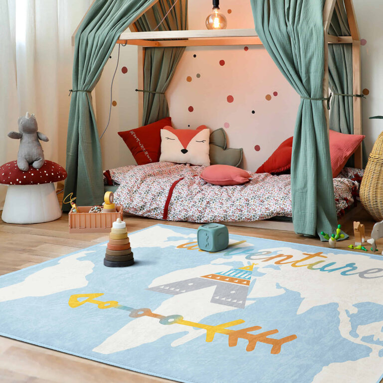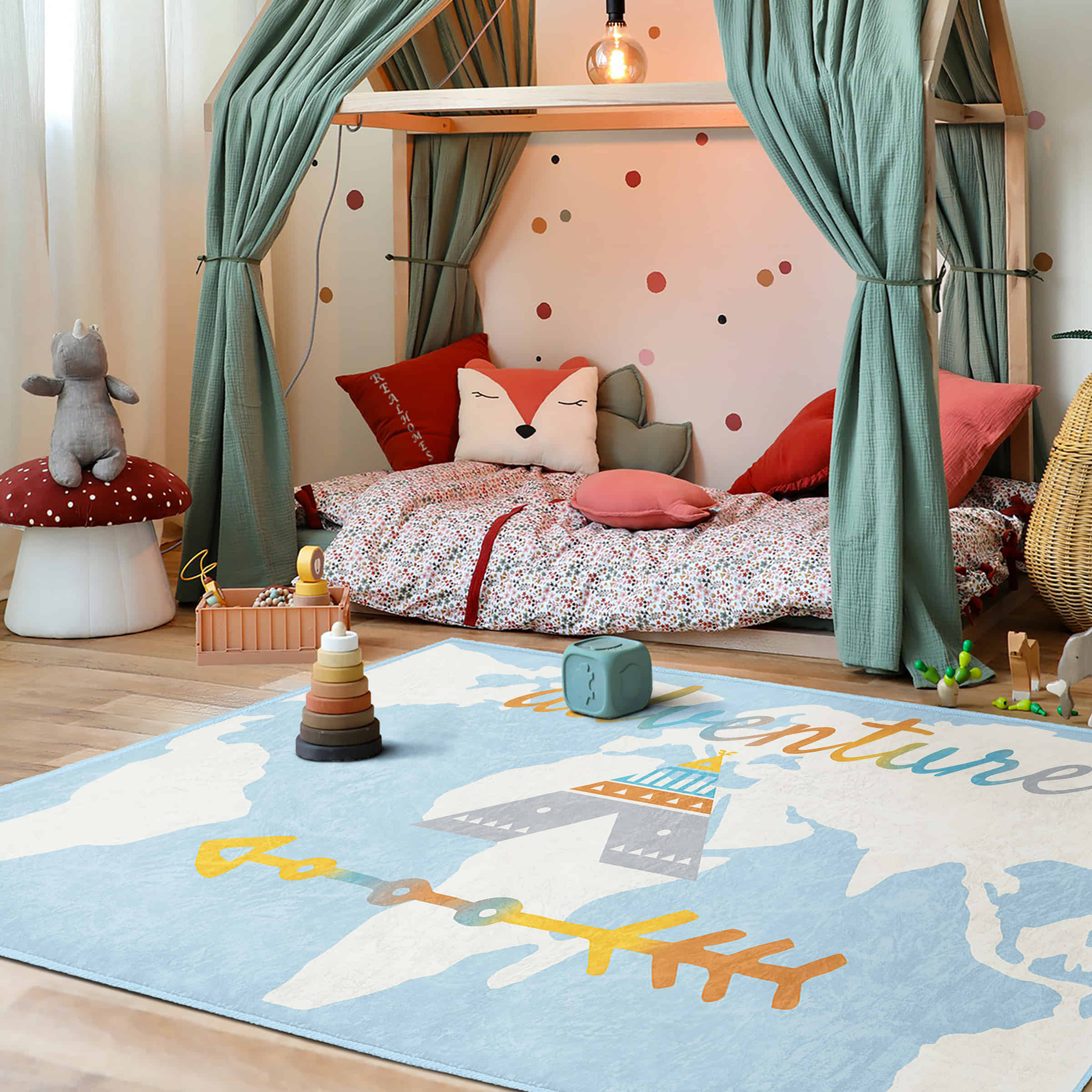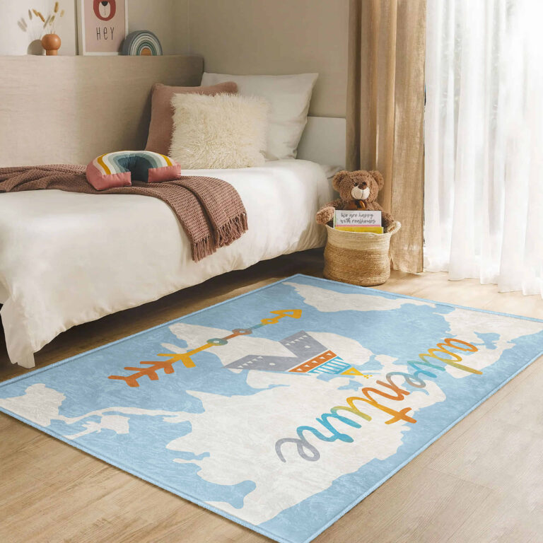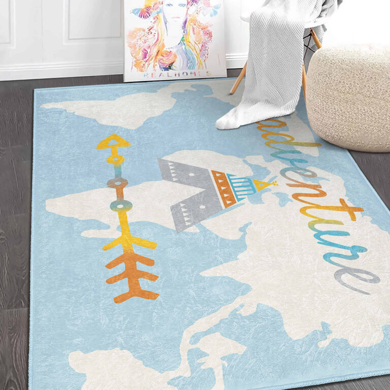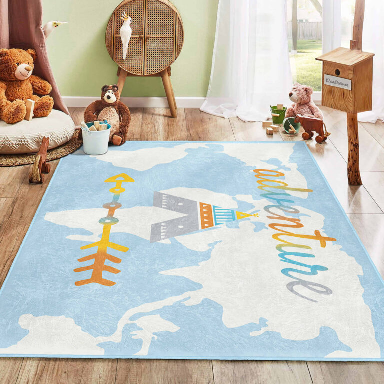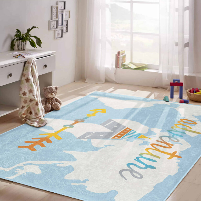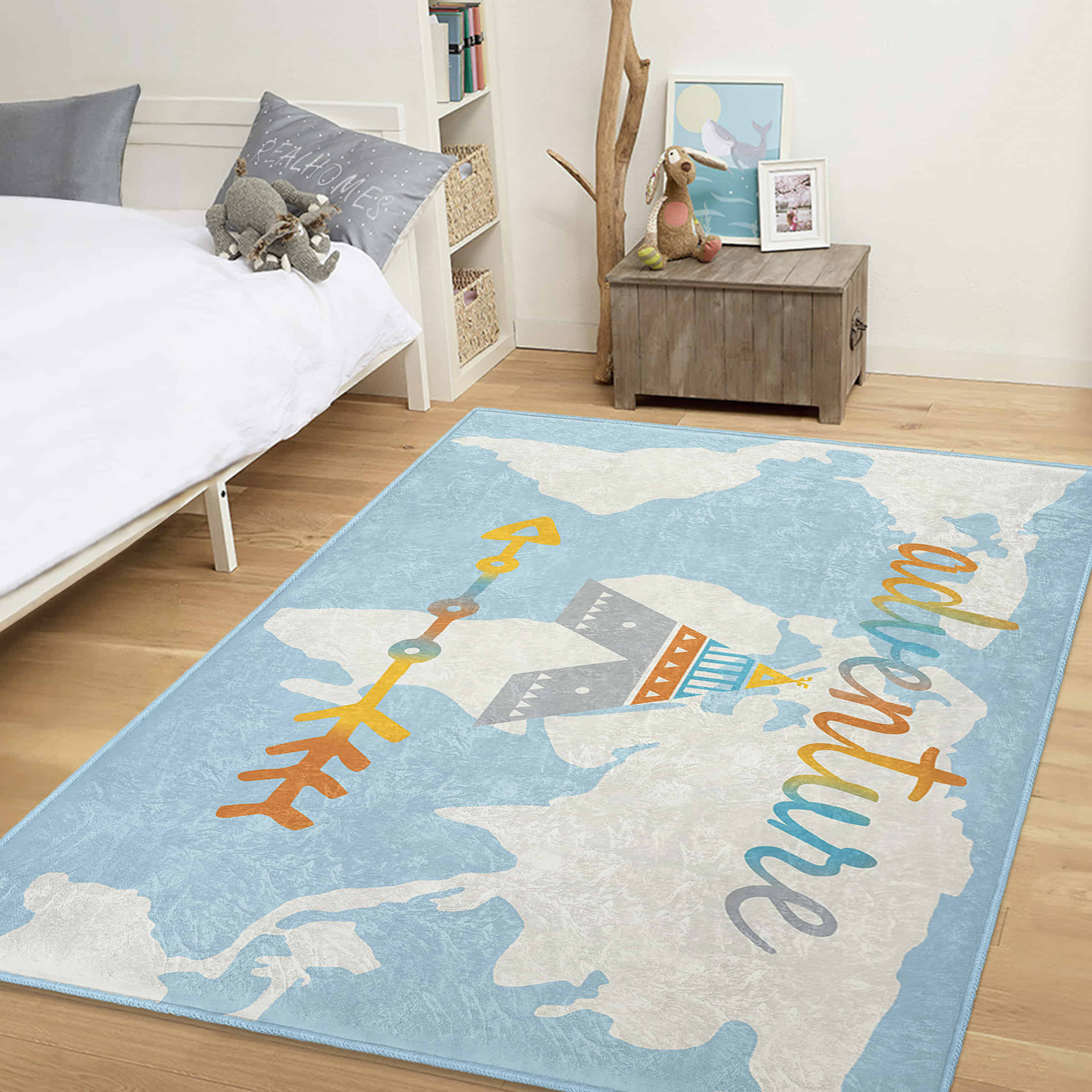 Mavi – Beyaz Zemin Üzerinde Macera Temalı Çocuk Halısı – Yıkanabilir Kaymaz Tabanlı Dikdörtgen Halı
