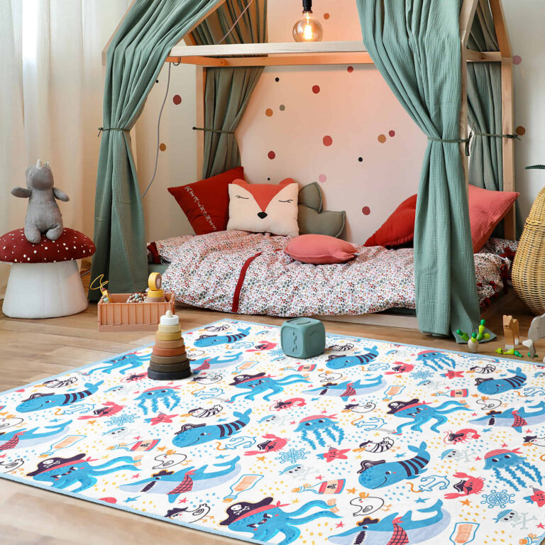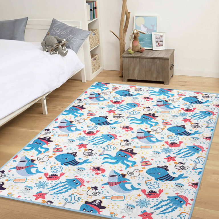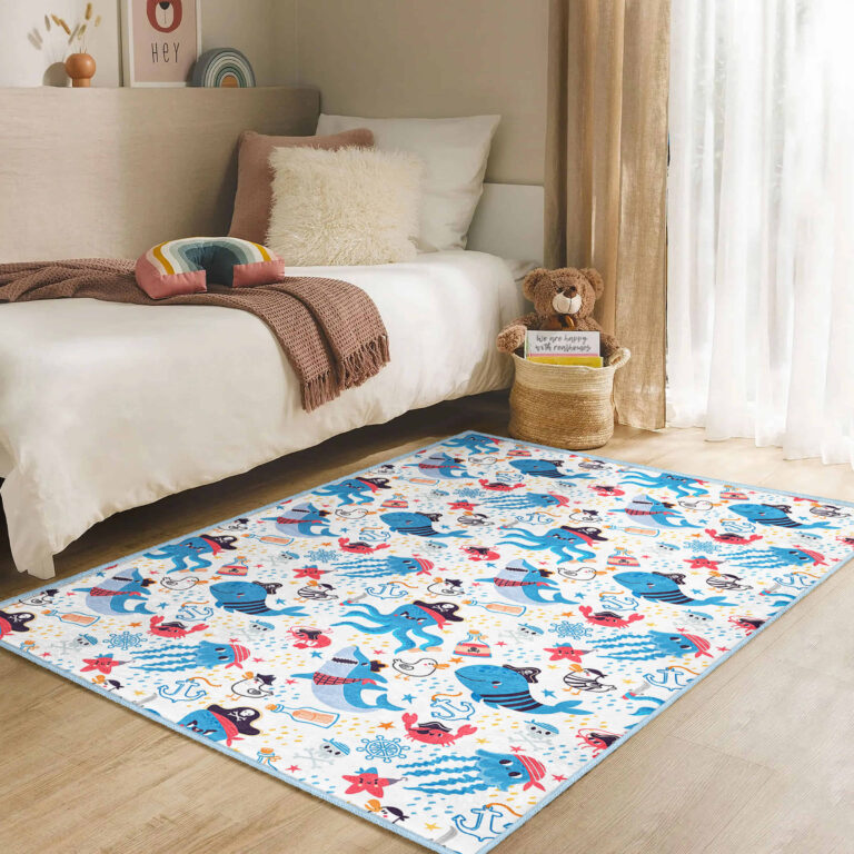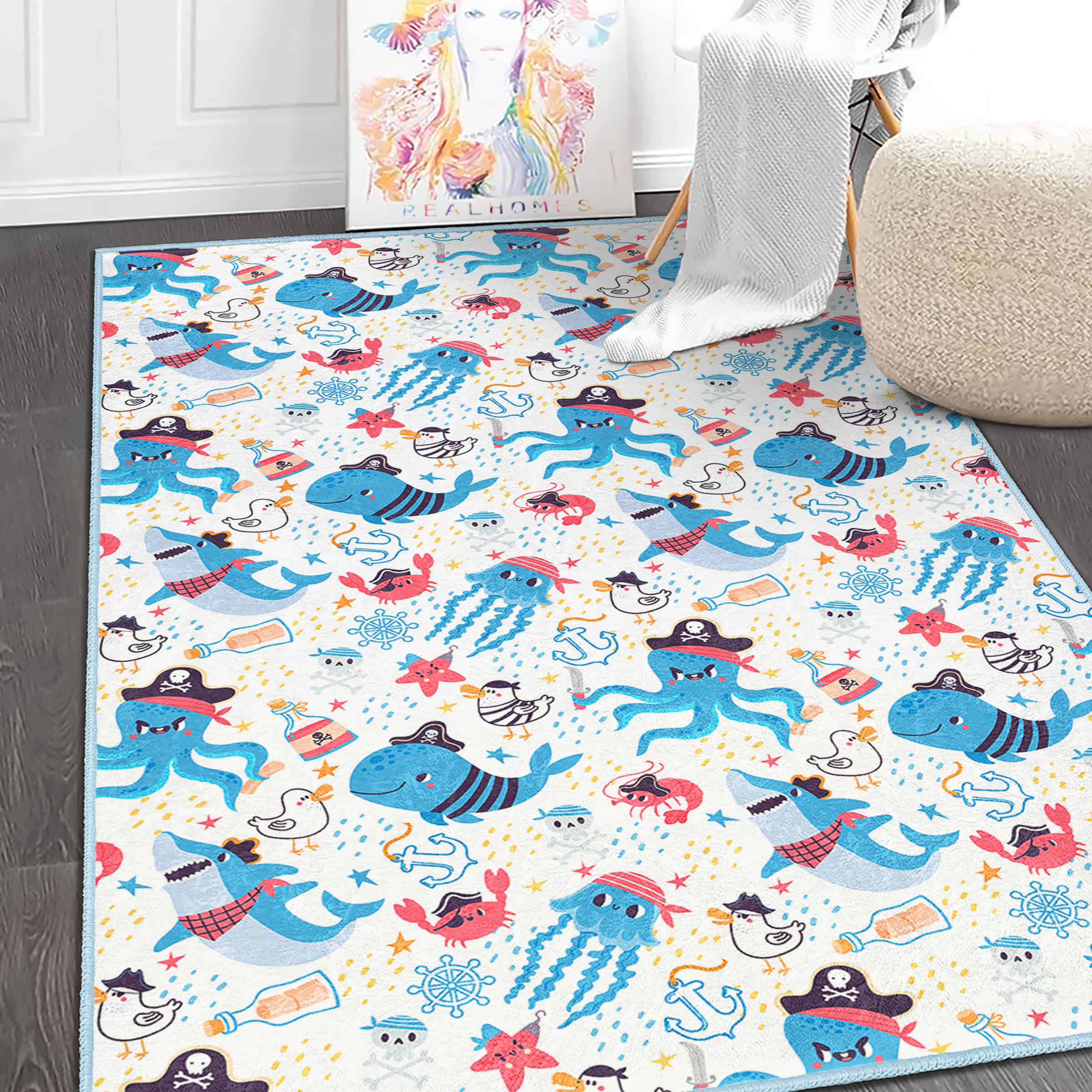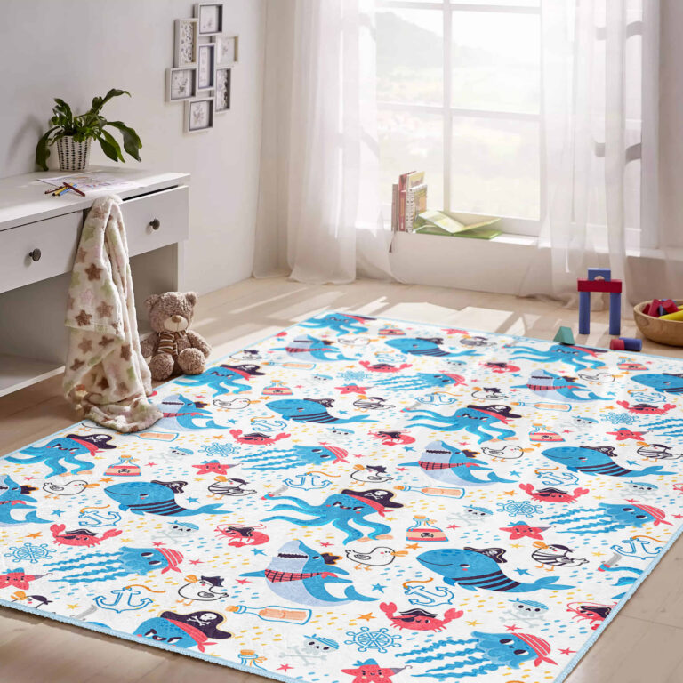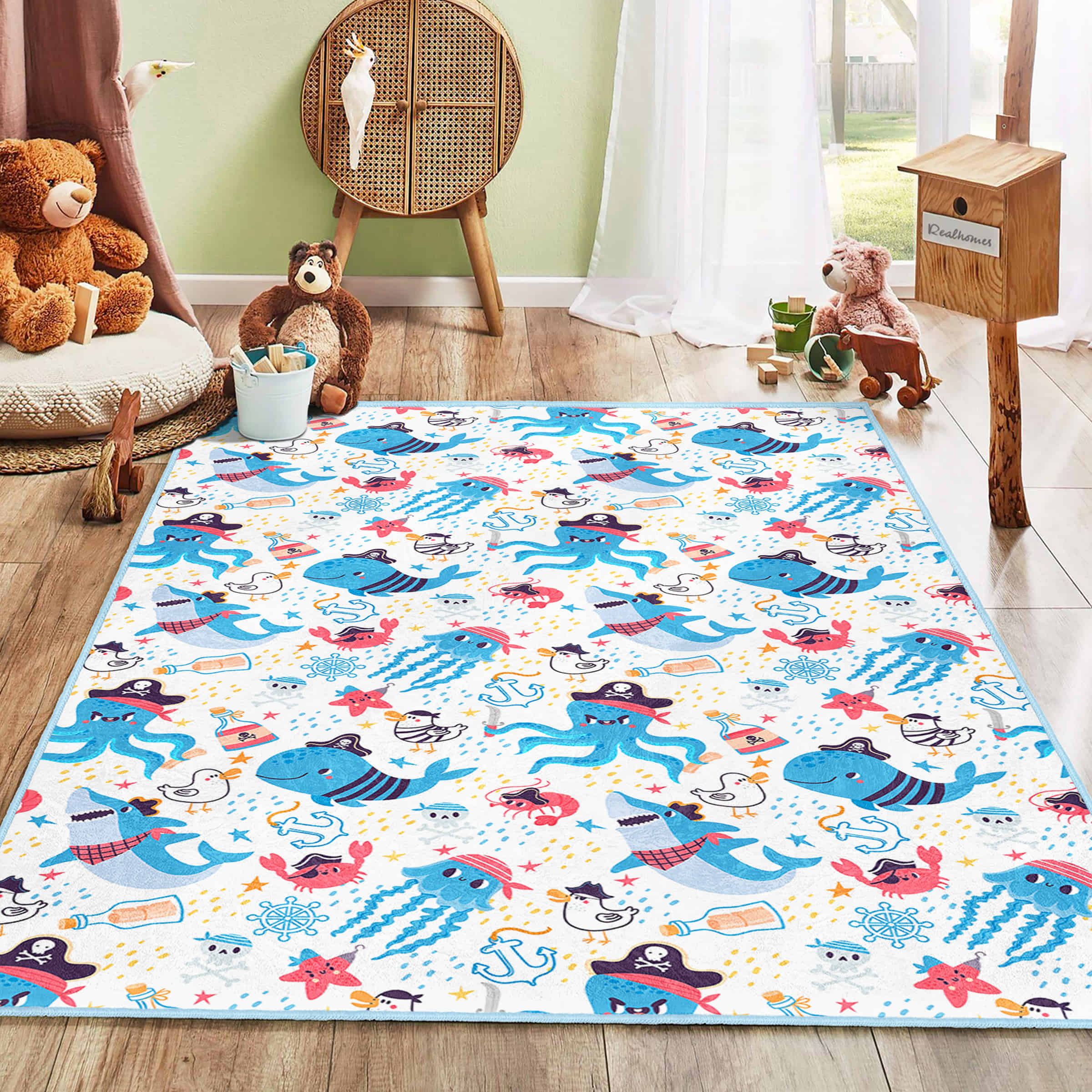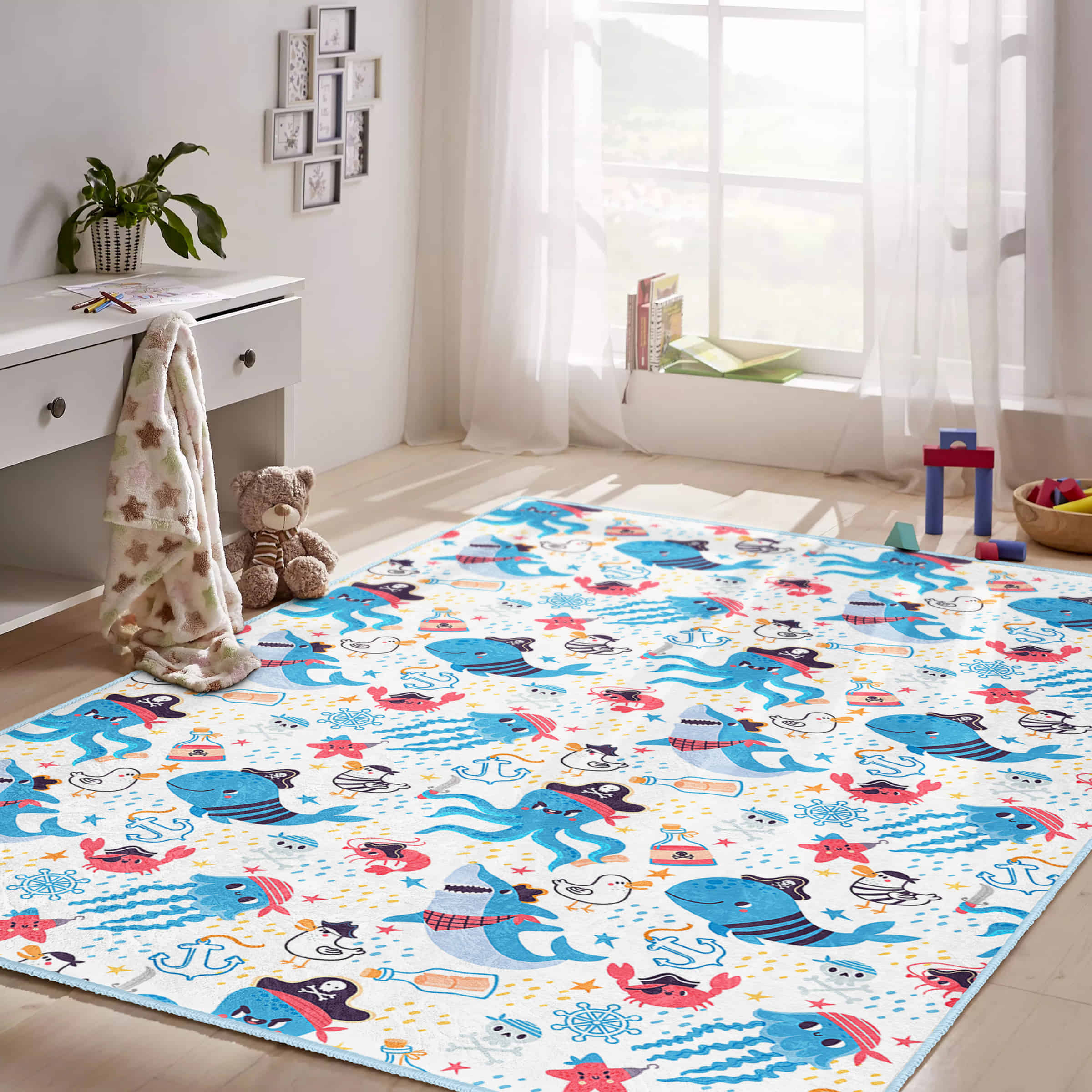 Mavi – Beyaz Zemin Üzerinde Sevimli Deniz Canlıları Desenli Dikdörtgen Çocuk Halısı