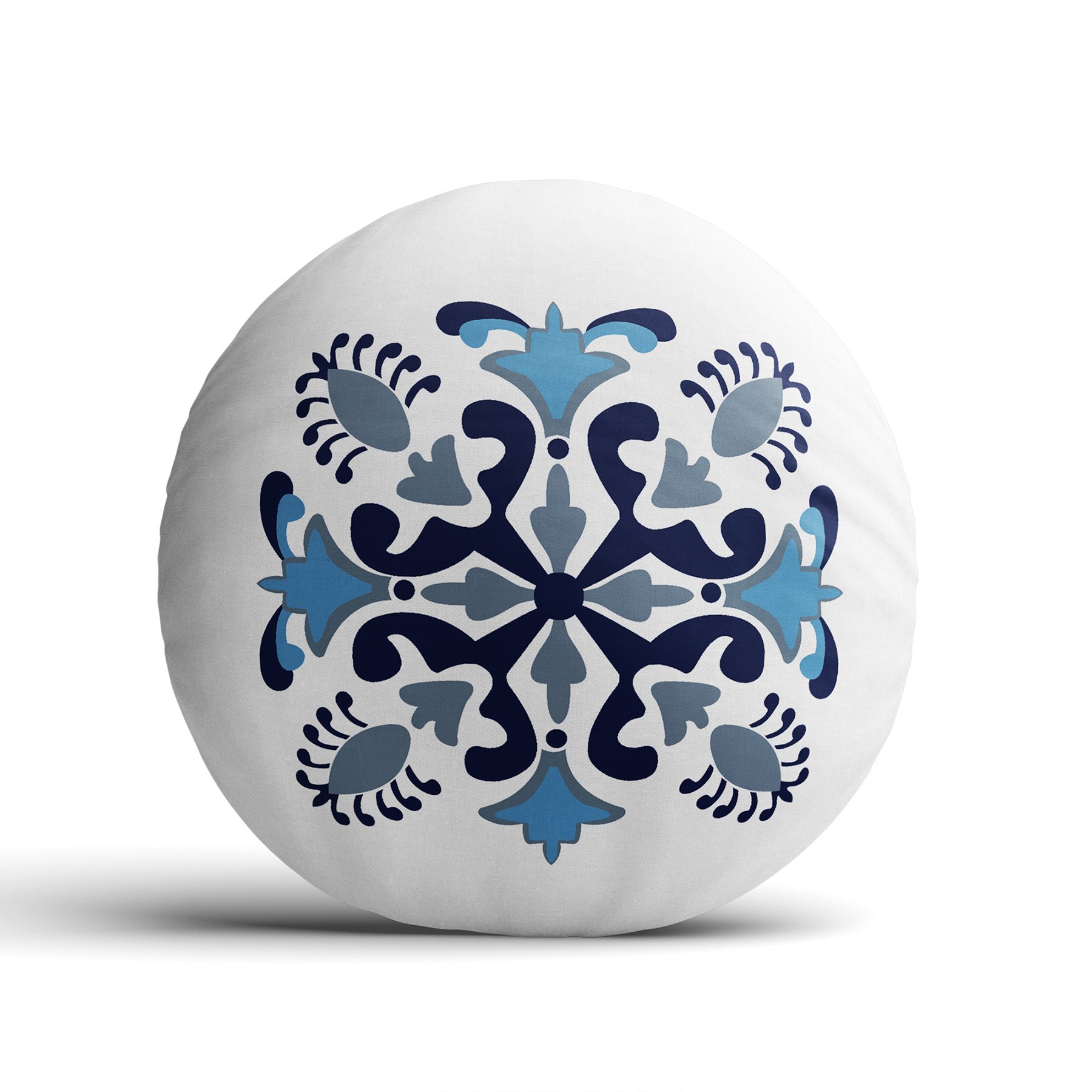 Mavi Çini Motifli Dijital Baskılı Yuvarlak Yastık Kırlent Kılıfı