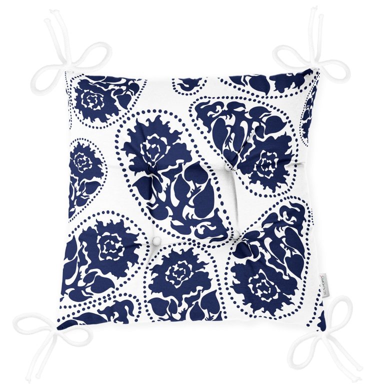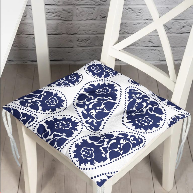 Mavi Çini Motifli Gül Tasarımlı Pofidik Sandalye Minderi