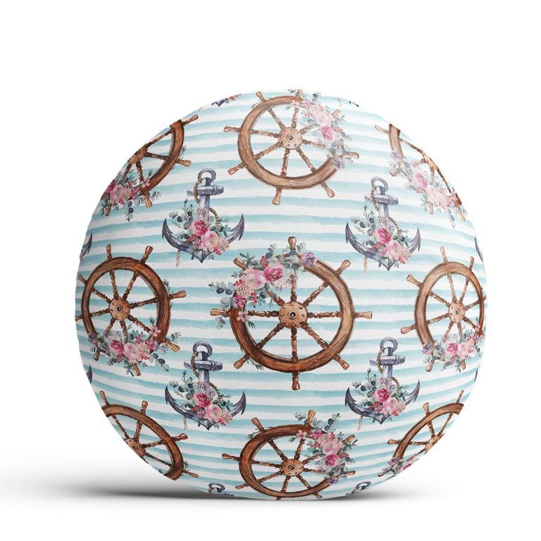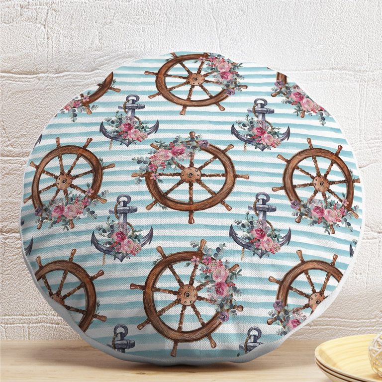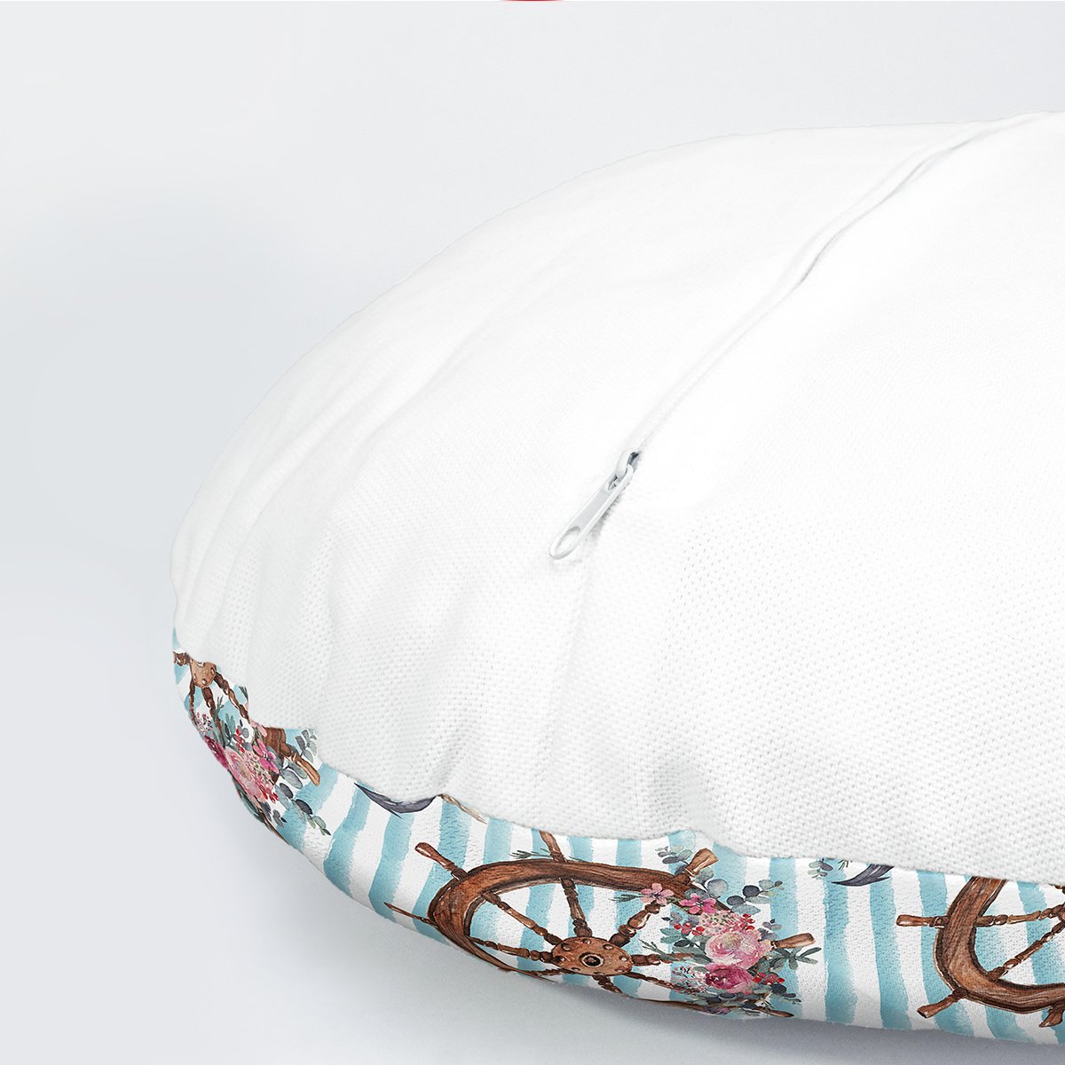 Mavi Çizgili Çapa & Dümen Motifli Dijital Baskılı Modern Yuvarlak Yastık Kırlent Kılıfı