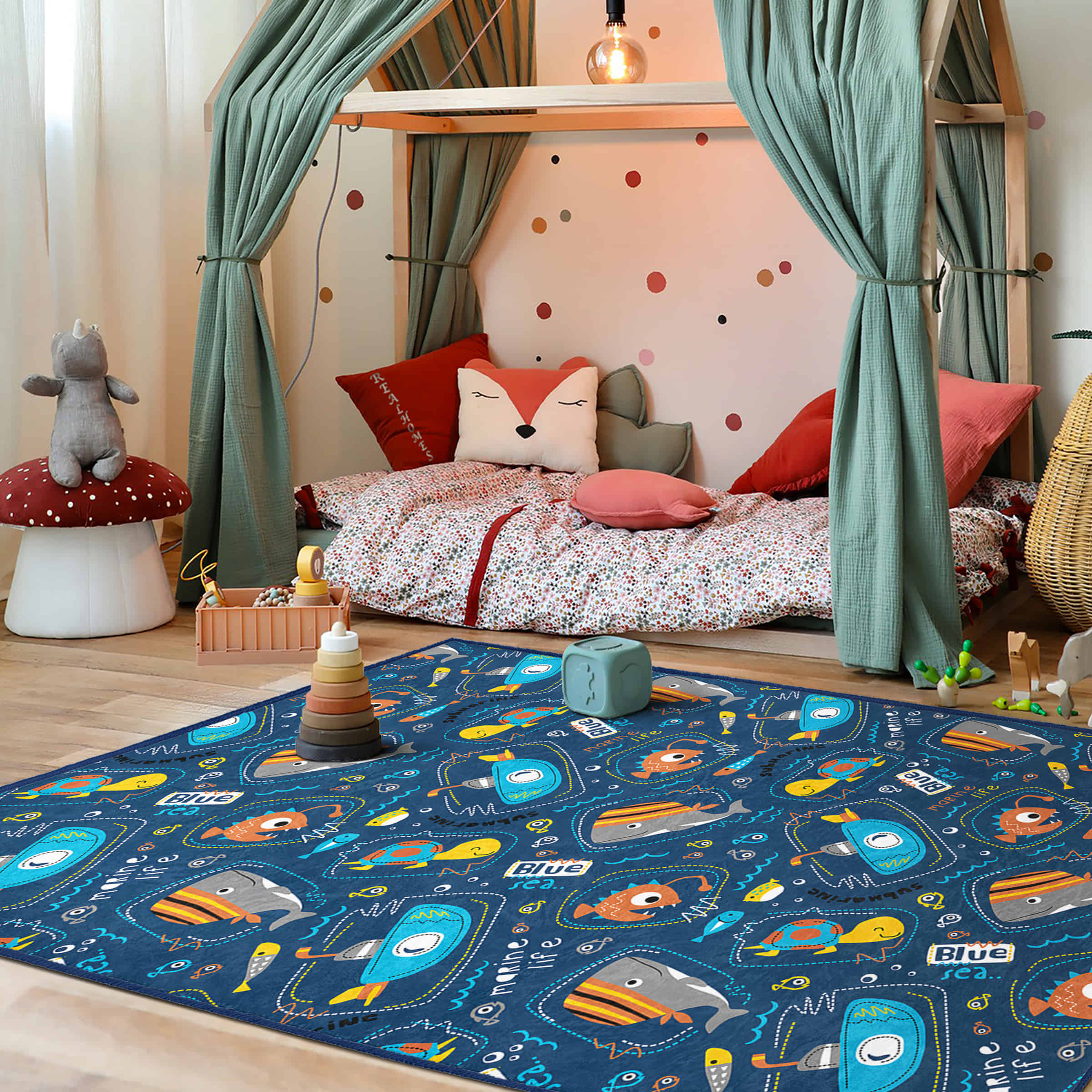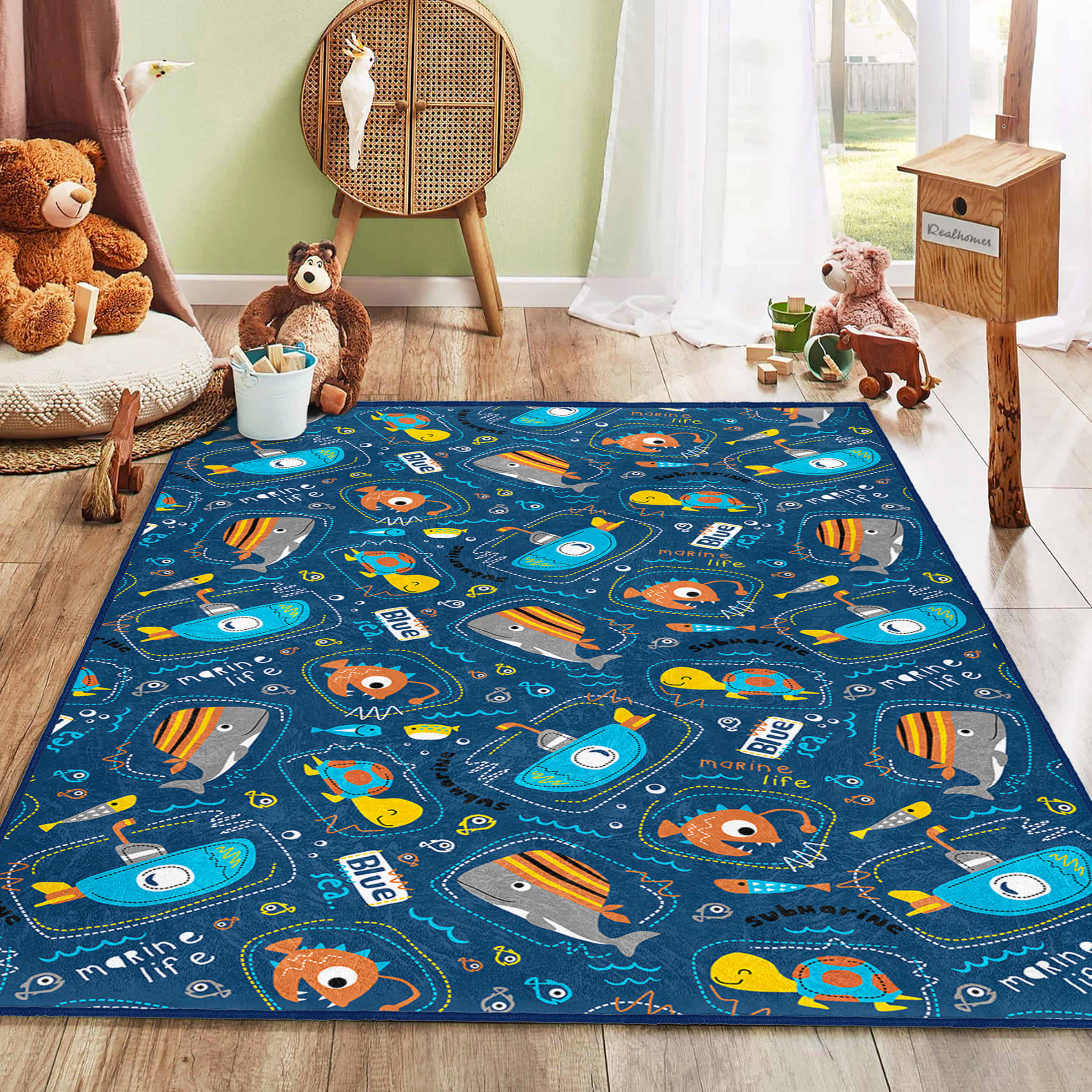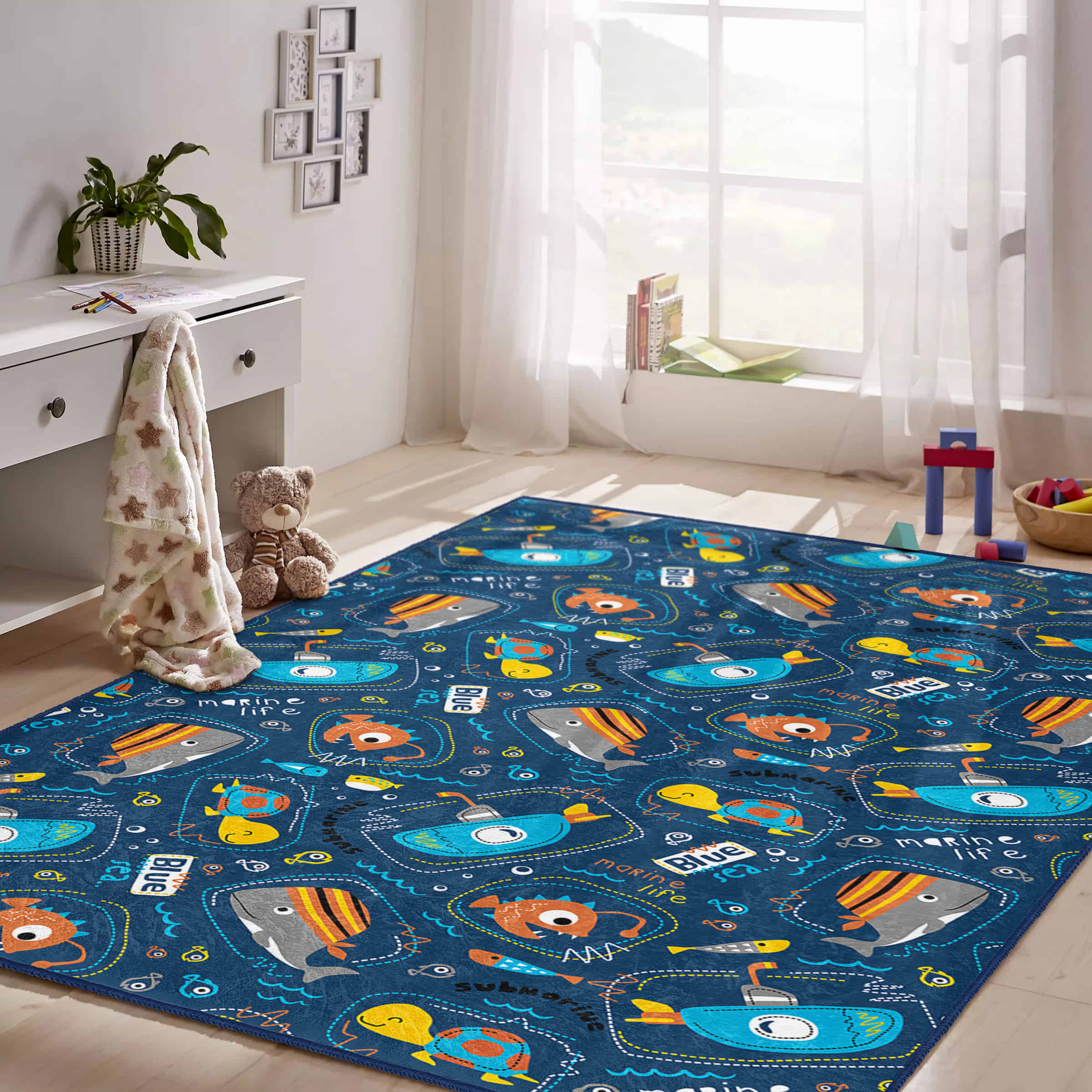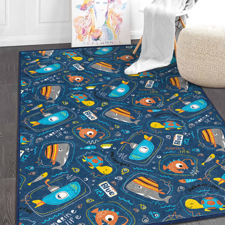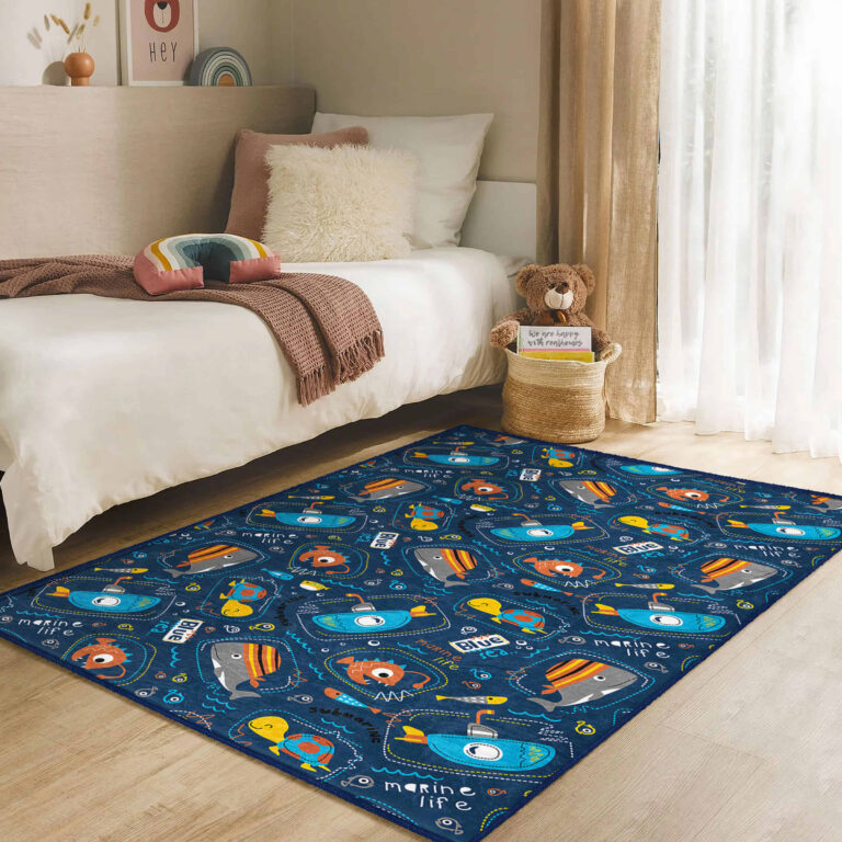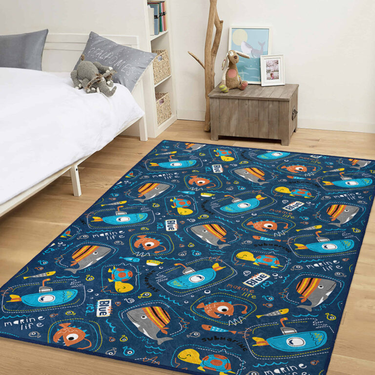 Mavi Deniz Temalı Eğlenceli Desenli Kaymaz Taban Çocuk Halısı – Dikdörtgen Şekilde