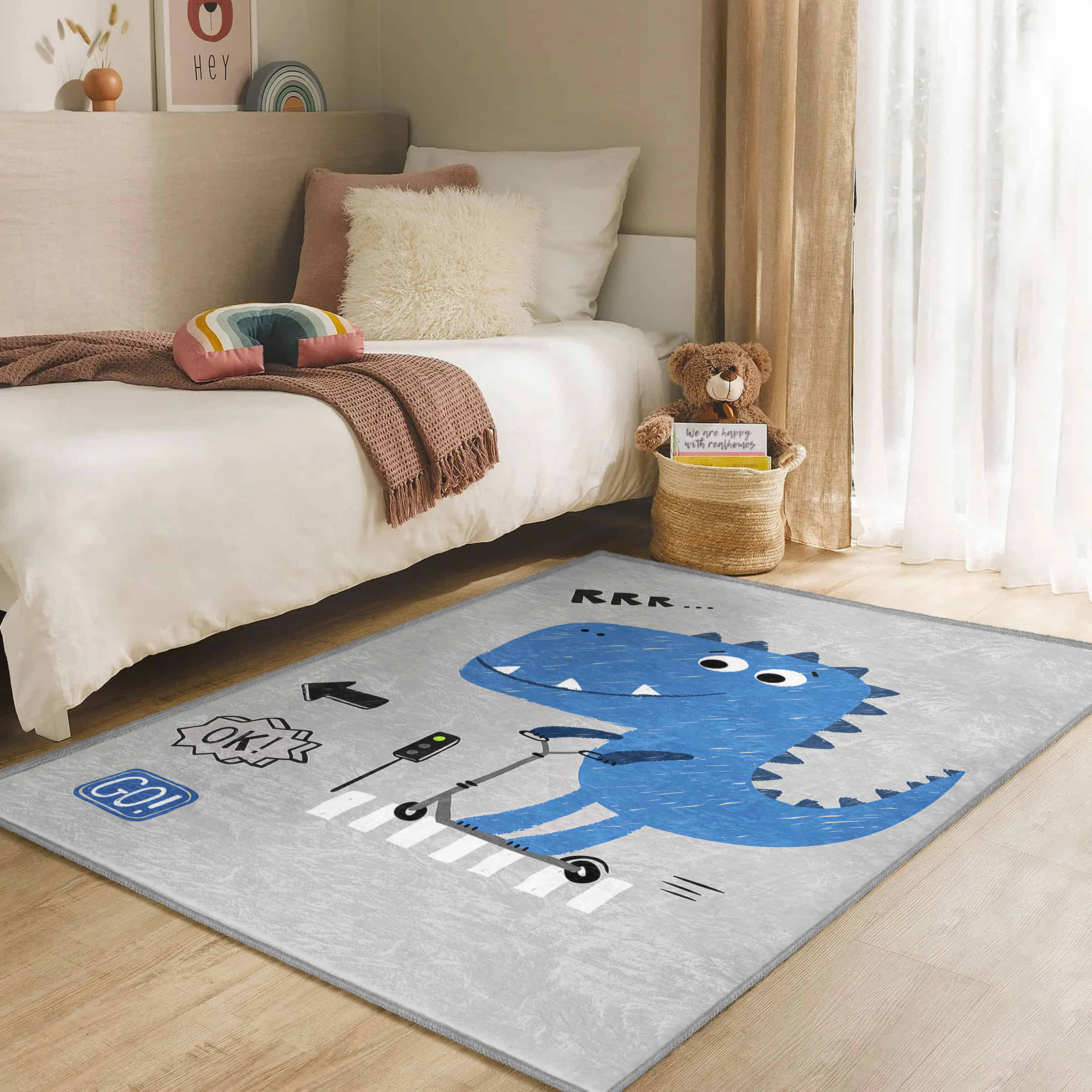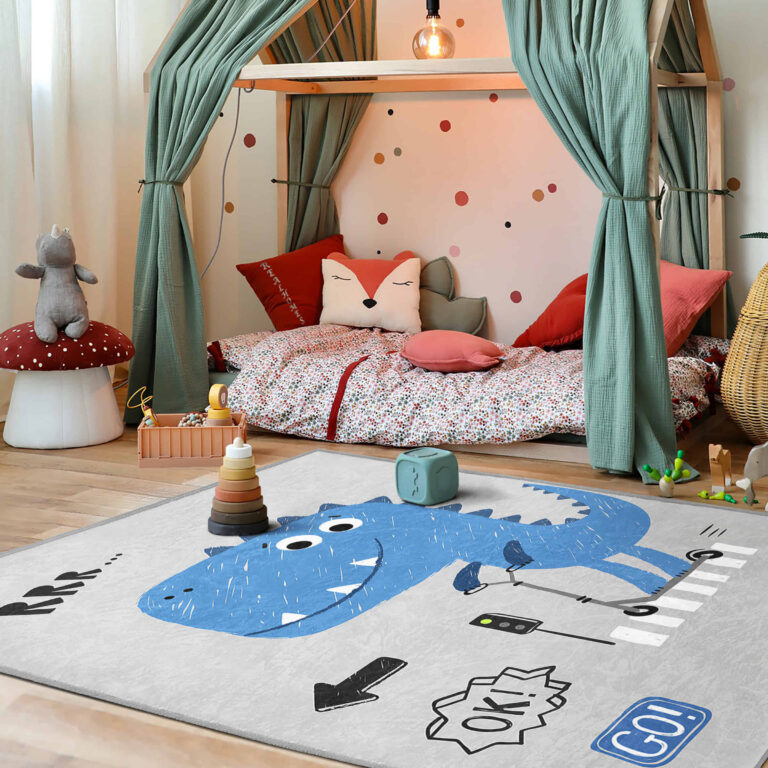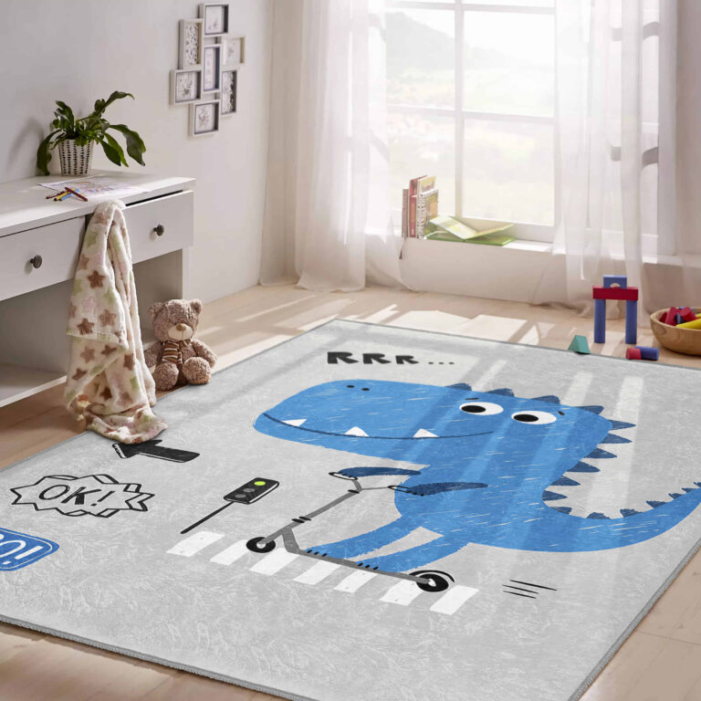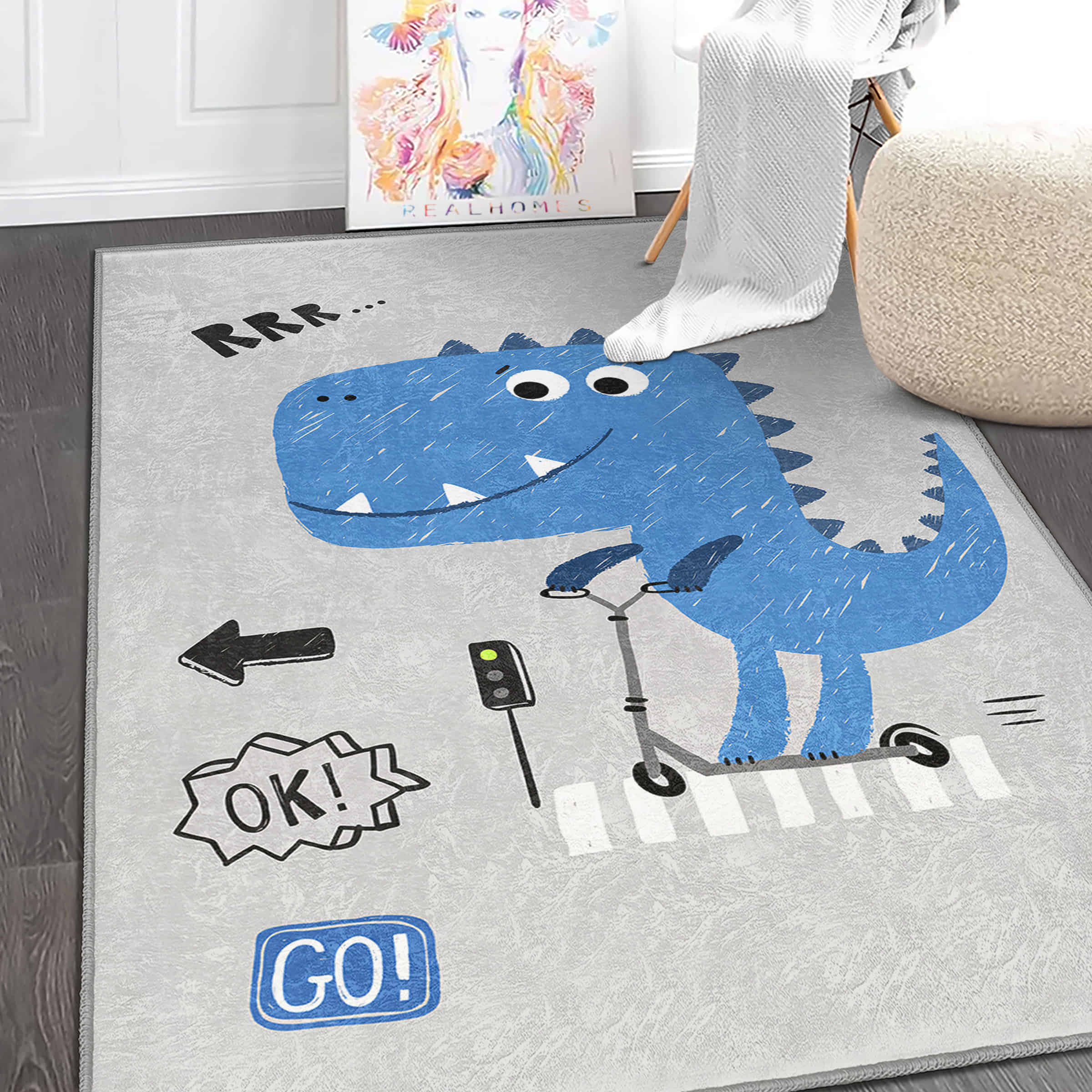 Mavi Dinozor Tasarımlı Renkli Çocuk Halısı – Makinede Yıkanabilir Kaymaz Tabanlı Dikdörtgen Halı