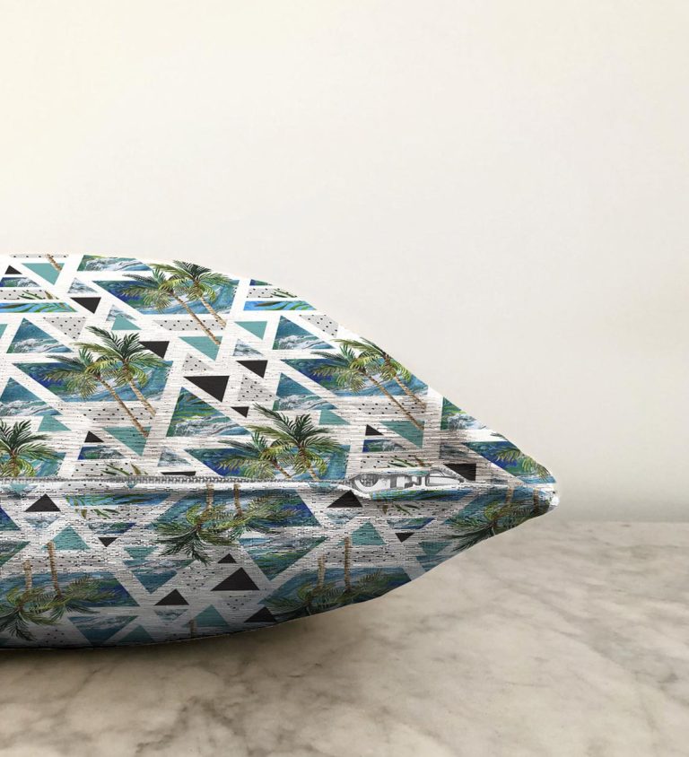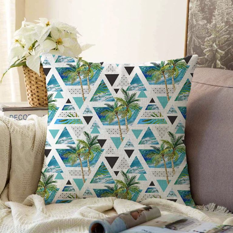 Mavi Geometrik Palmiye Desenleri Dekoratif Raşel Yastık Kılıfı