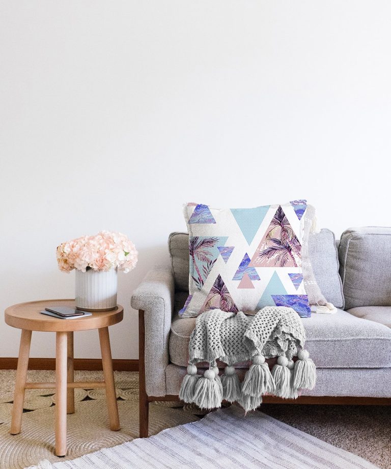 Mavi Geometrik Şekilli Palmiye Motifli Dijital Baskılı Raşel Yastık Kırlent Kılıfı