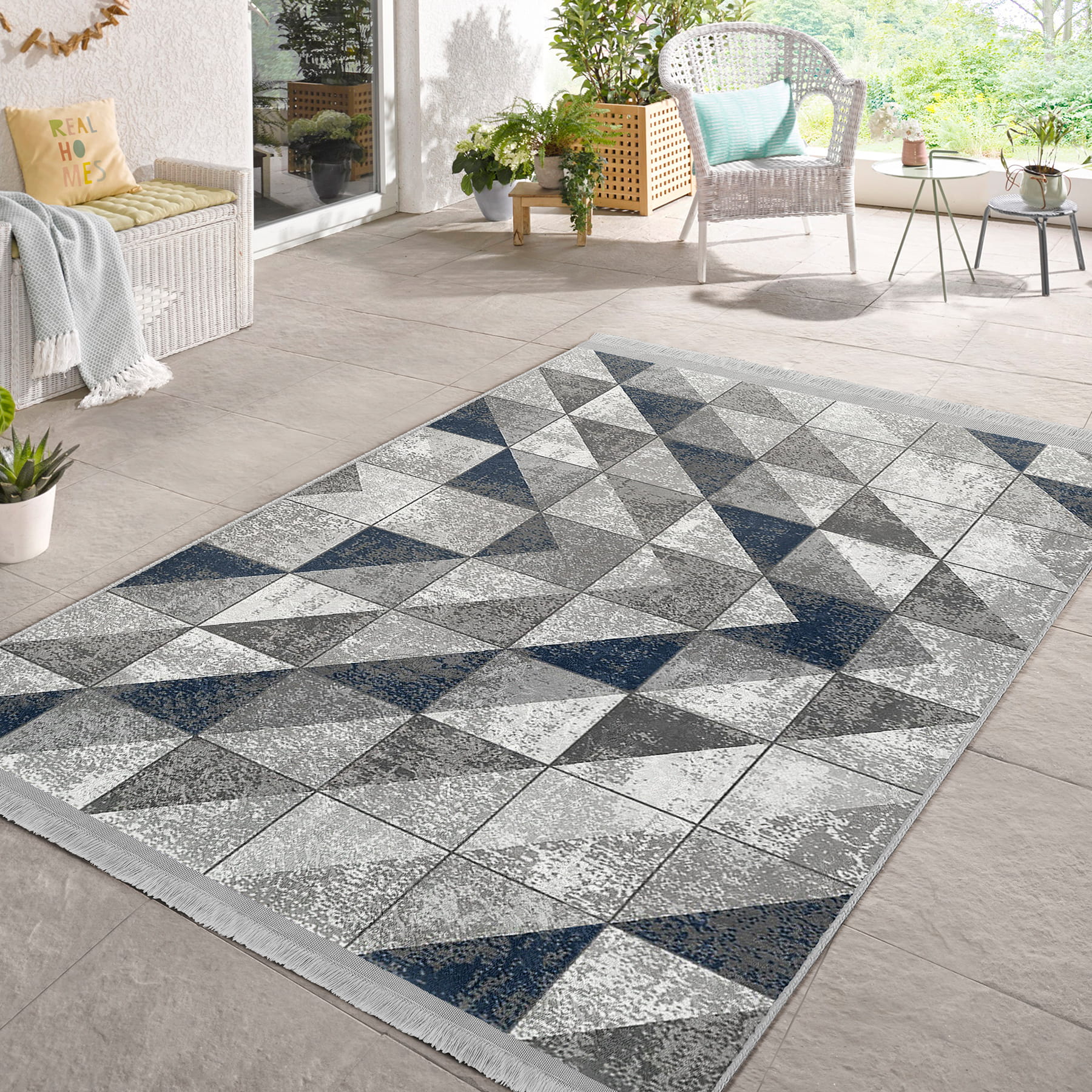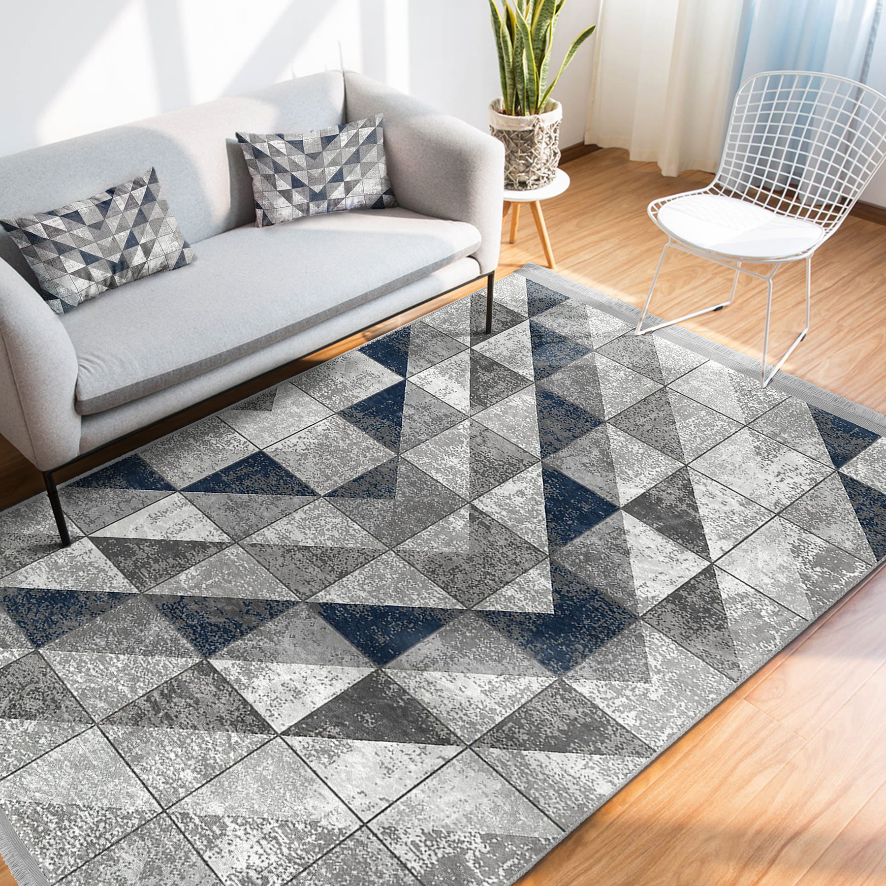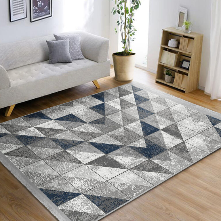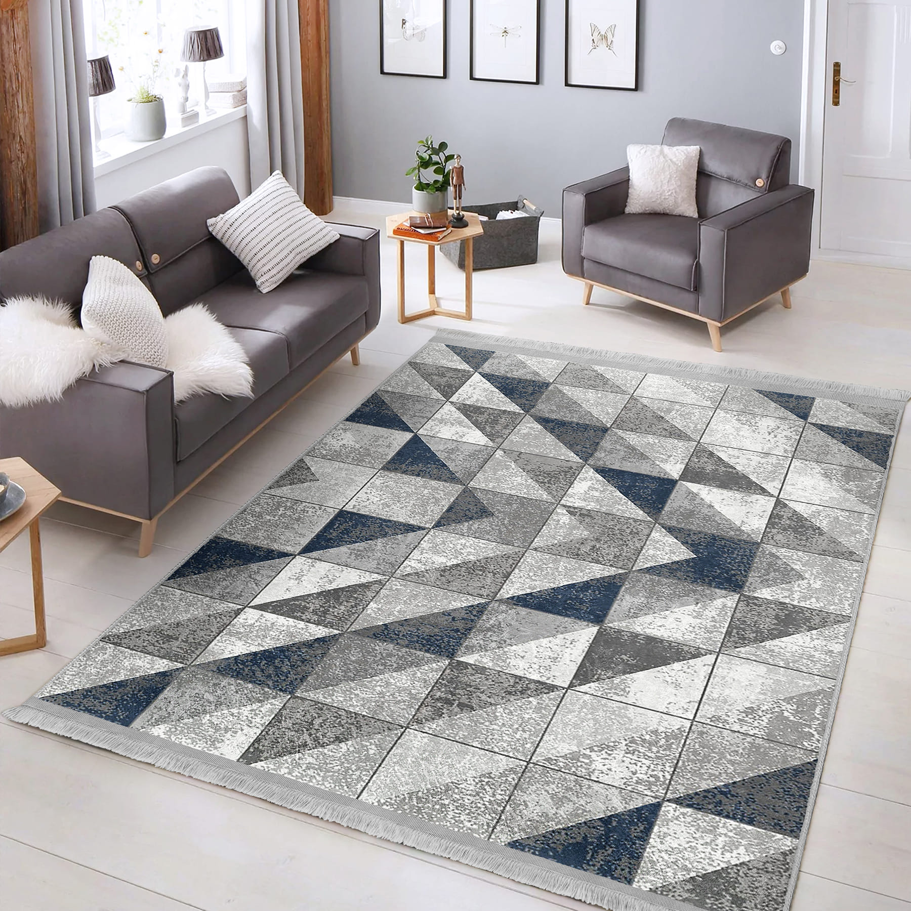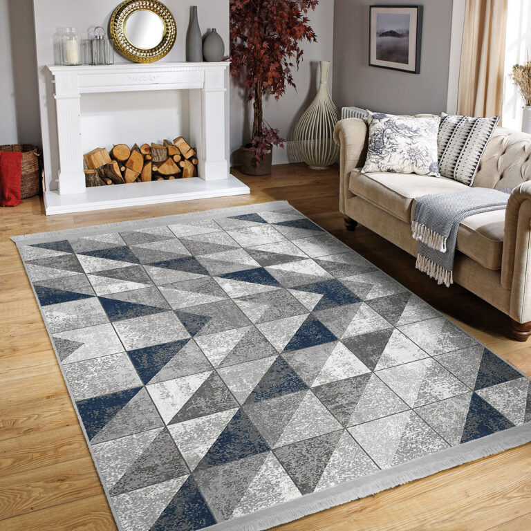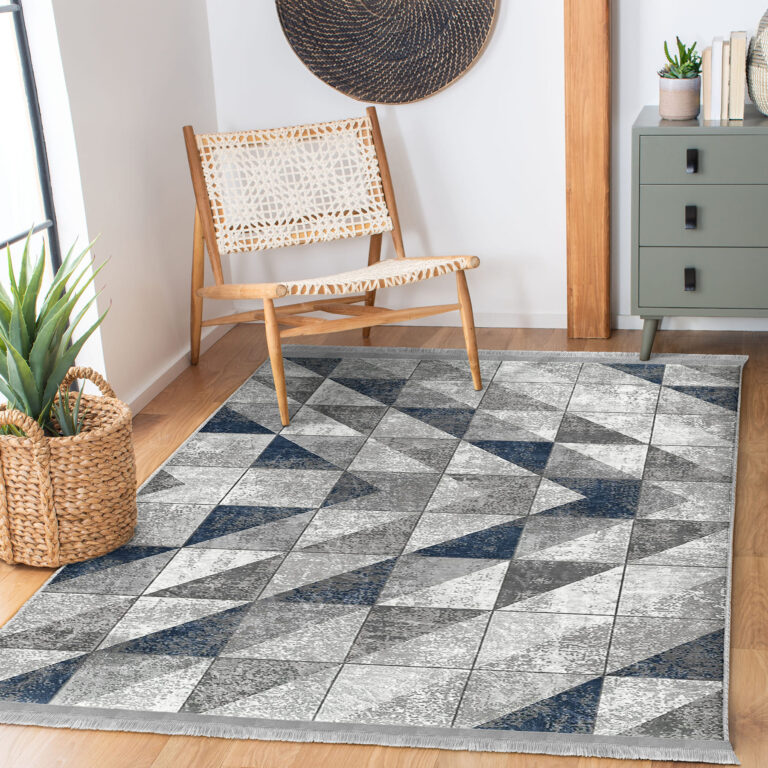 Mavi – Gri Zeminde Geometrik Motifli Antik Desenli Geometrik Eskitme Motifli Koridor & Antre Salon & Oturma Odası Dijital Baskılı Makinede Yıkanabilir Kaymaz Taban Saçaklı Halı