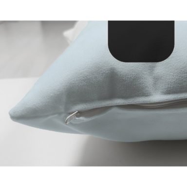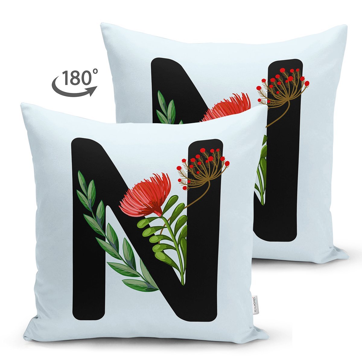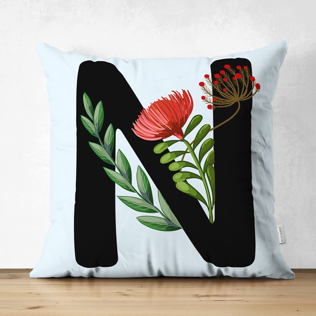 Mavi Zemin Çiçek Desenli Siyah N Harfi Özel Tasarım Modern Suet Yastık Kırlent Kılıfı