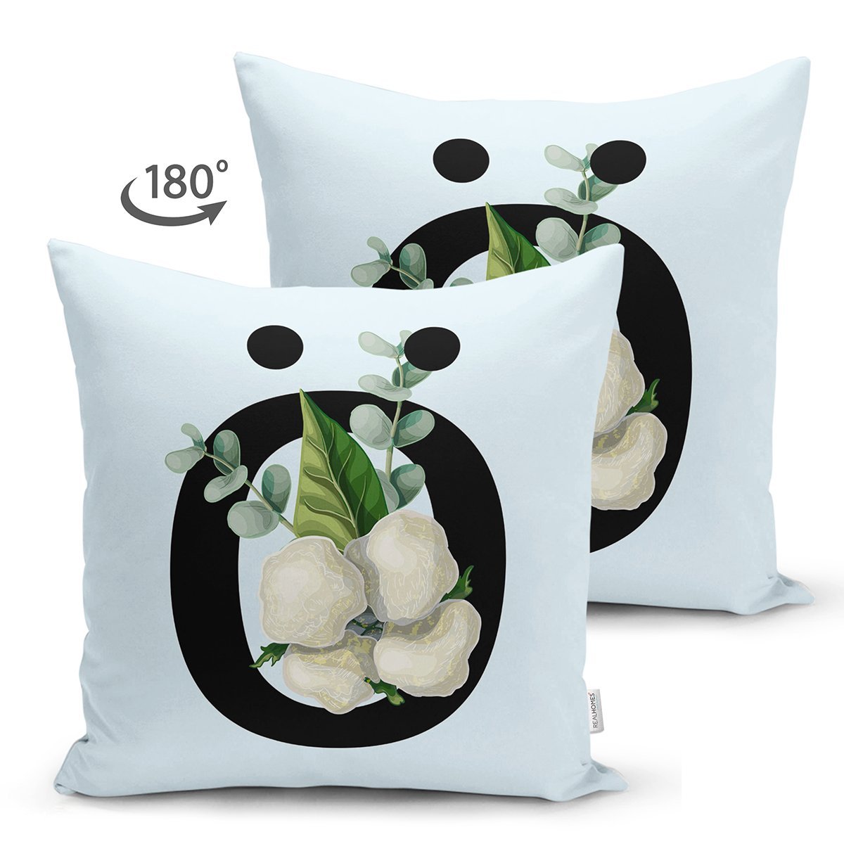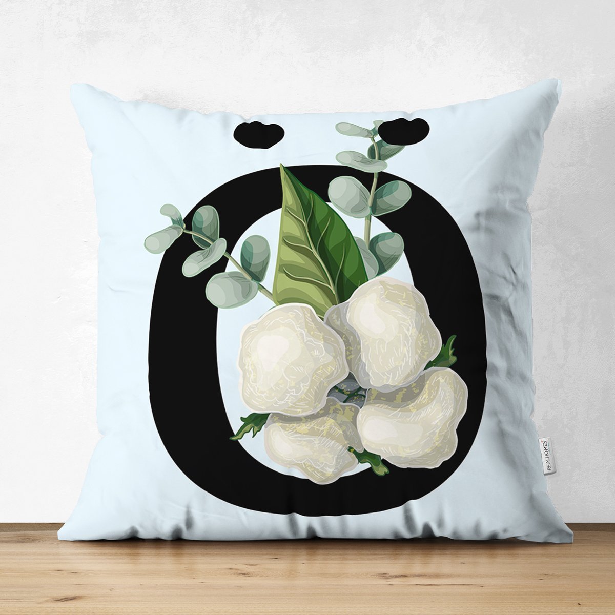 Mavi Zemin Çiçek Desenli Siyah Ö Harfi Özel Tasarım Modern Suet Yastık Kırlent Kılıfı