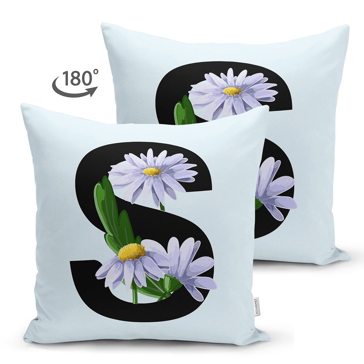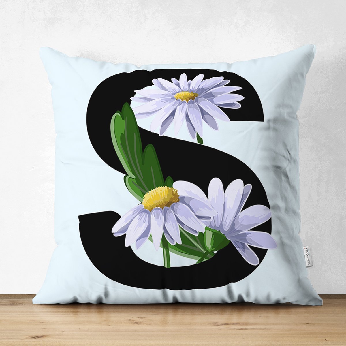 Mavi Zemin Çiçek Desenli Siyah S Harfi Özel Tasarım Modern Suet Yastık Kırlent Kılıfı