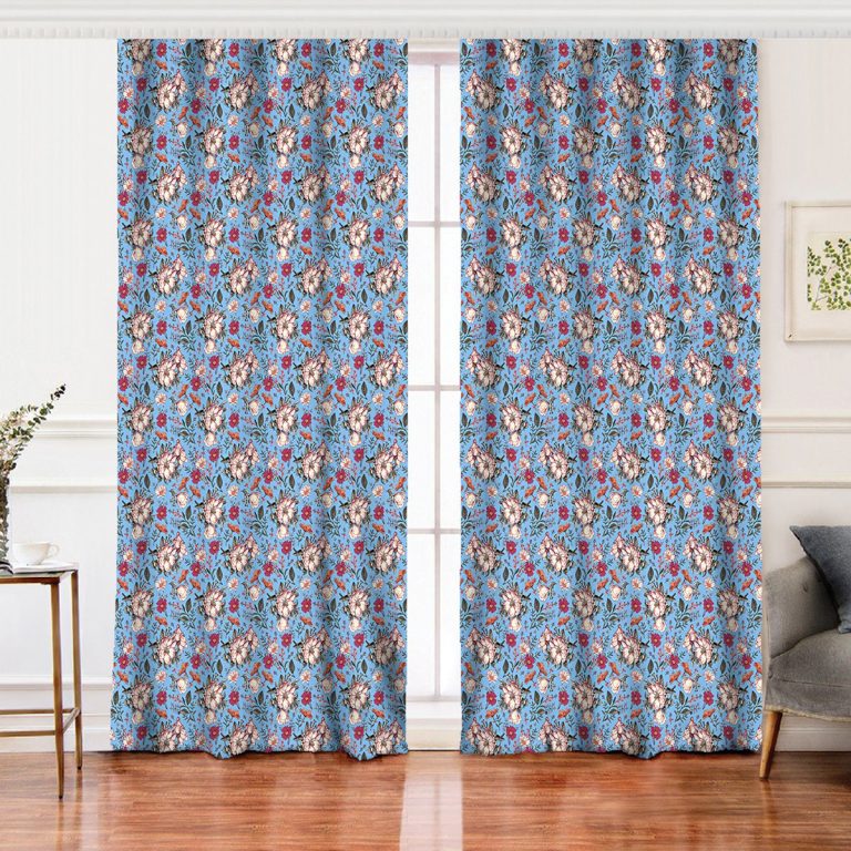 Mavi Zemin Papatya & Gül Tasarımlı Dijital Baskılı Modern Fon Perde