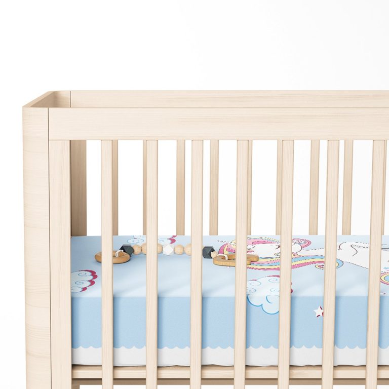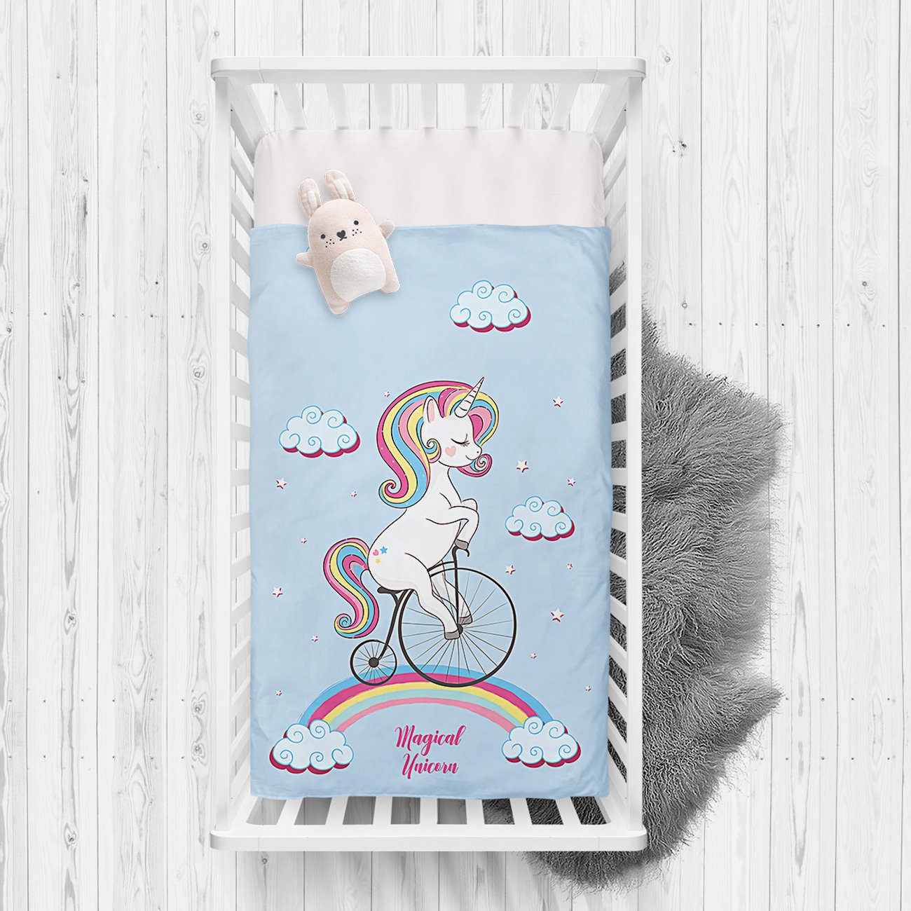 Mavi Zeminde Bisiklet ve Unicorn Tasarımlı Çocuk Odası Yatak Örtüsü