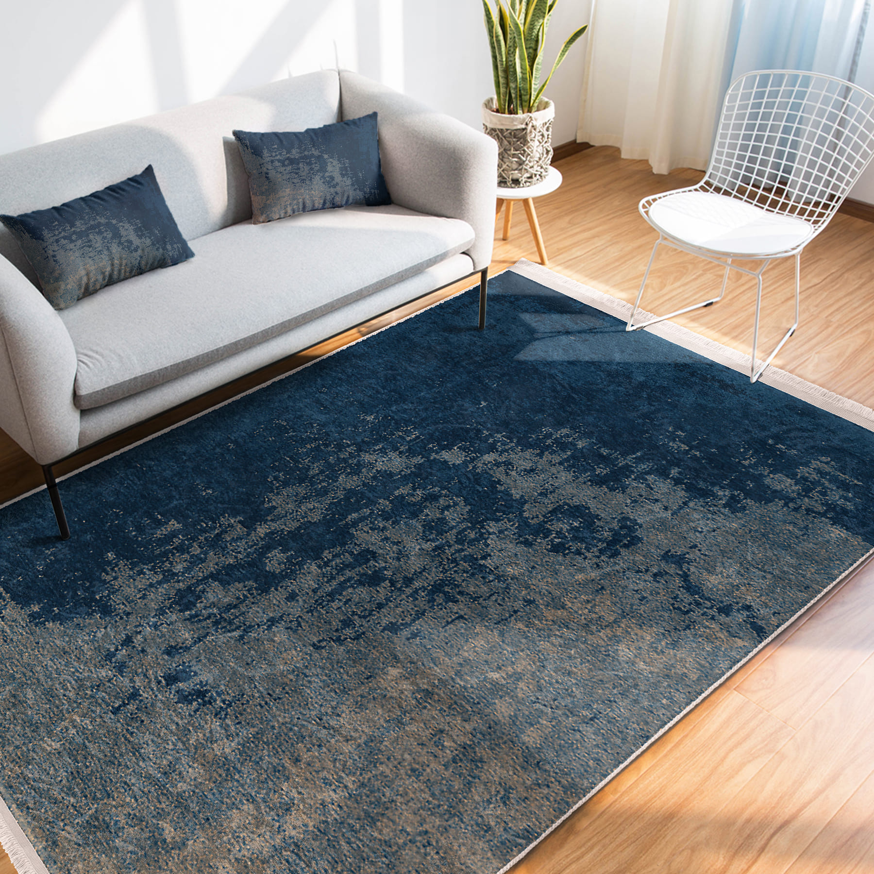 Mavi Zeminde Eskitme Motifli Antik Desenli Eskitme Motifli Vintage Salon & Oturma Odası Dış Mekan & Outdoor Dijital Baskılı Makinede Yıkanabilir Kaymaz Taban Saçaklı Halı