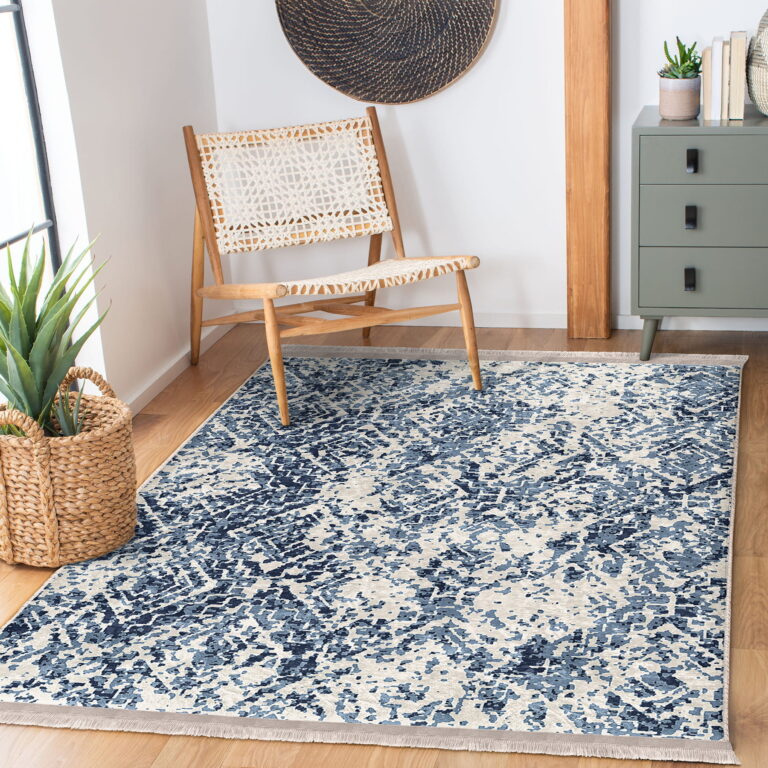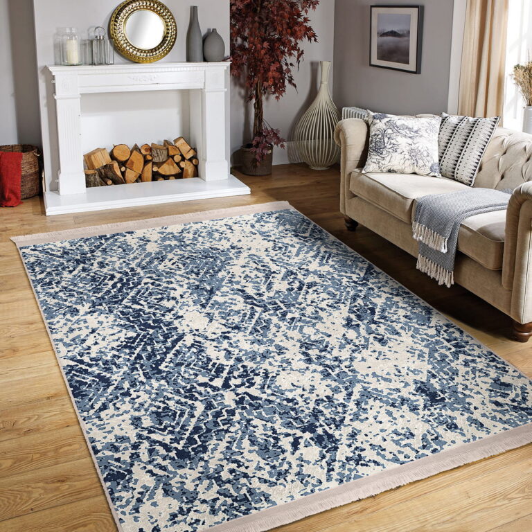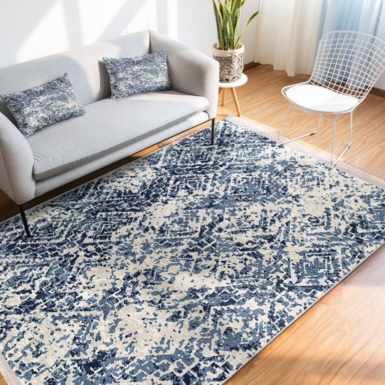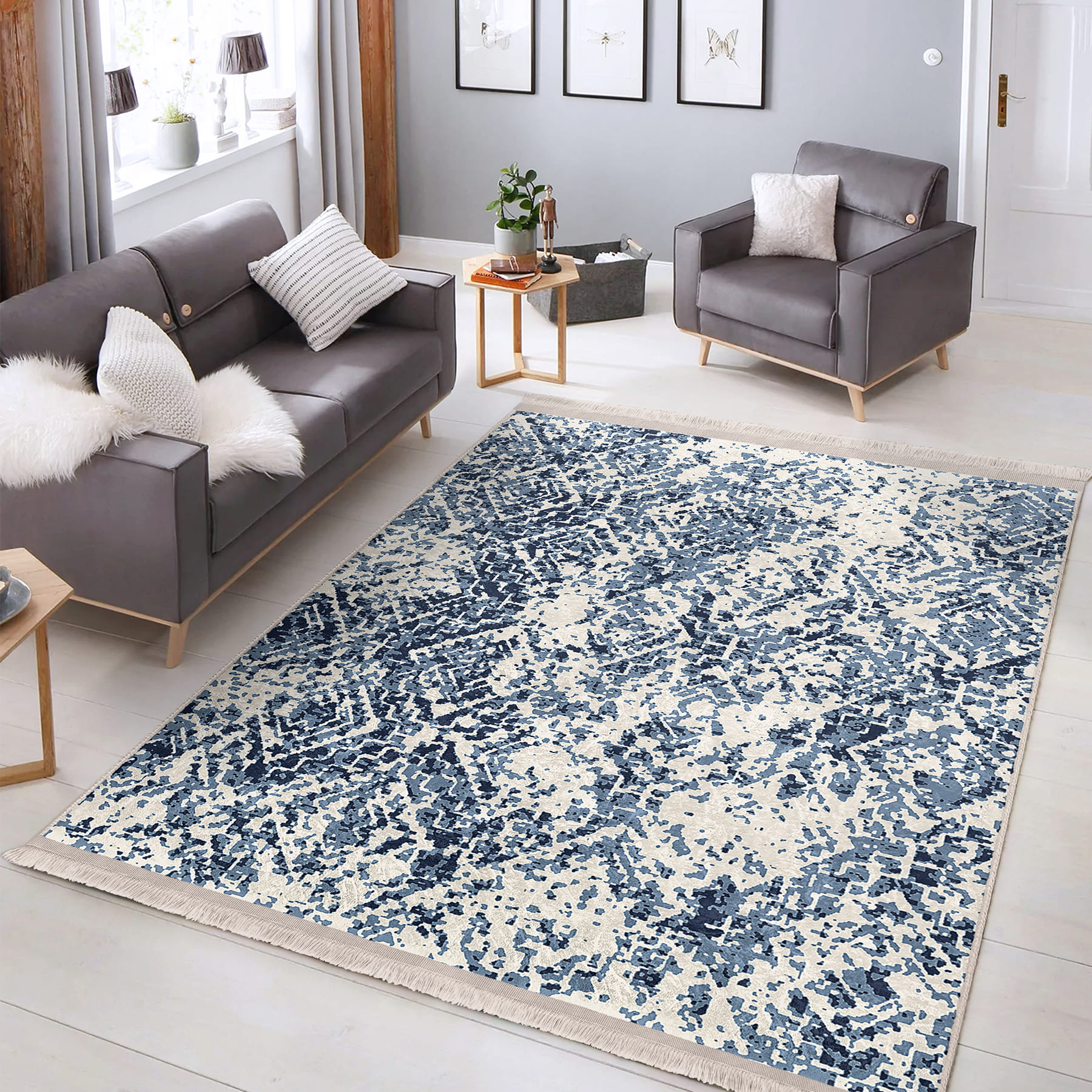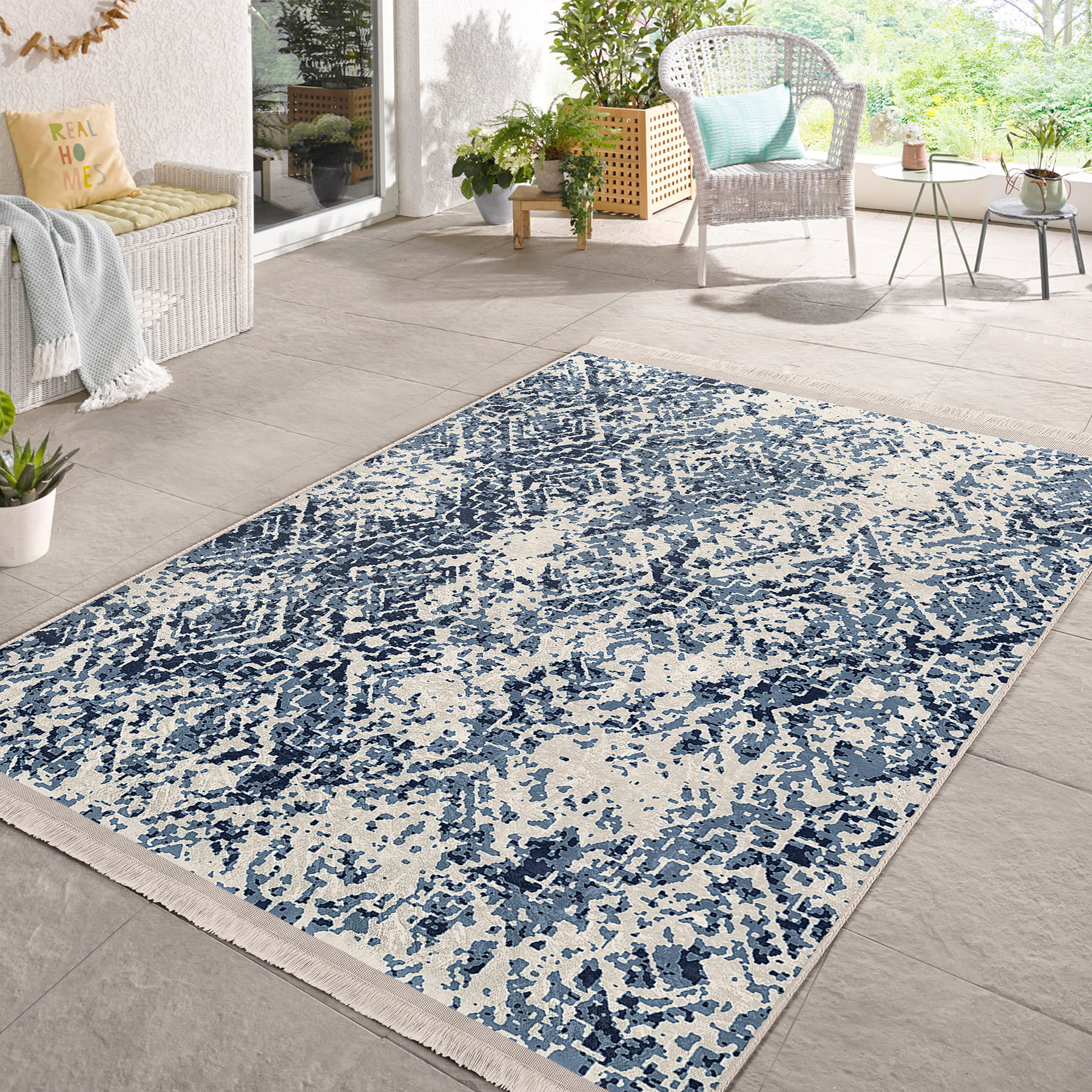 Mavi Zeminde Eskitme Motifli Geleneksel Desenli Geometrik Eskitme Motifli Koridor & Antre Banyo Dijital Baskılı Makinede Yıkanabilir Kaymaz Taban Saçaklı Halı