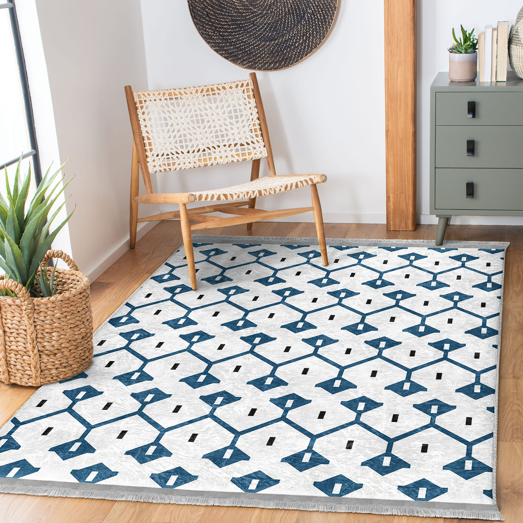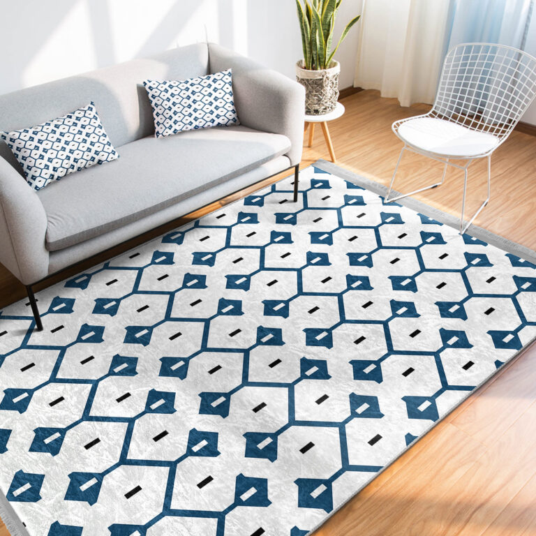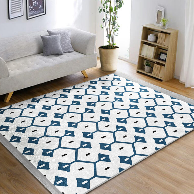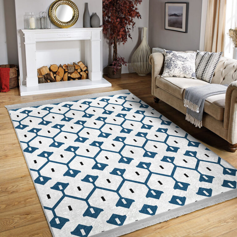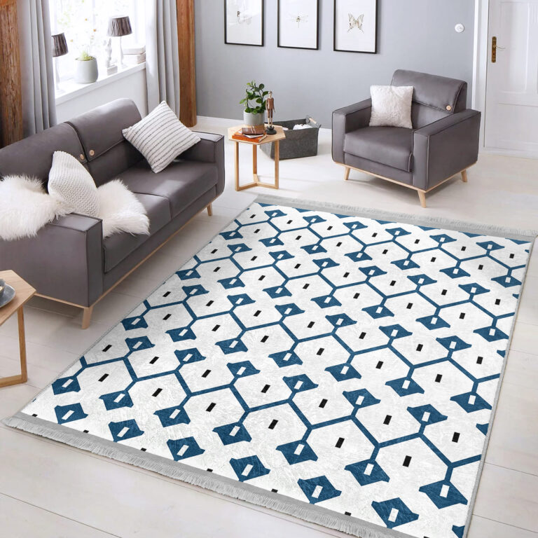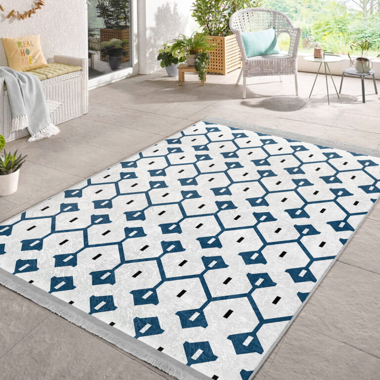 Mavi Zeminde Geometrik Motifli Çizgili Desenli Etnik Motifler Geometrik Koridor & Antre Salon & Oturma Odası Dijital Baskılı Makinede Yıkanabilir Kaymaz Taban Saçaklı Halı