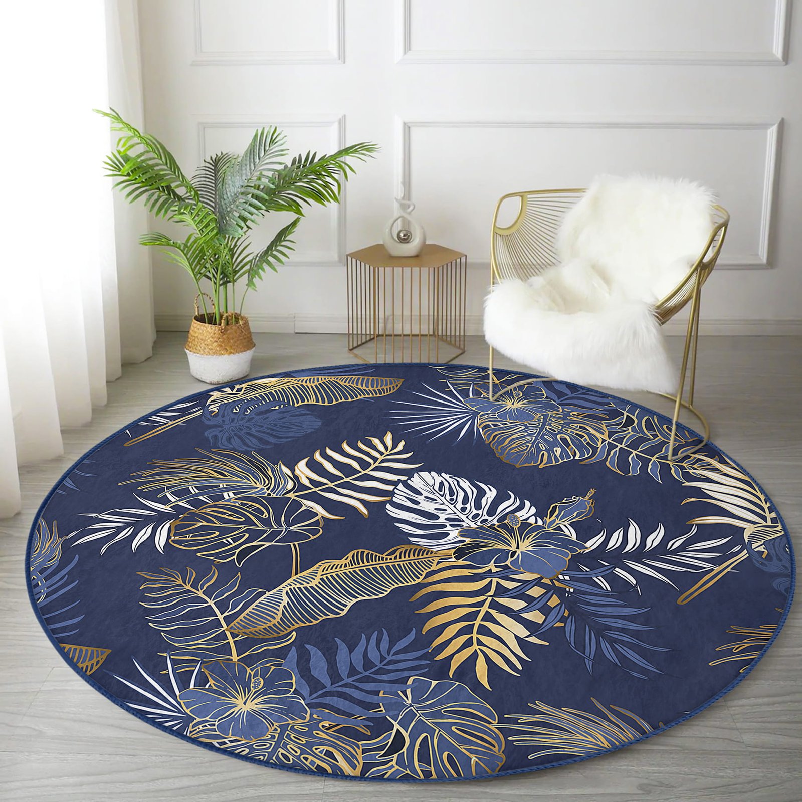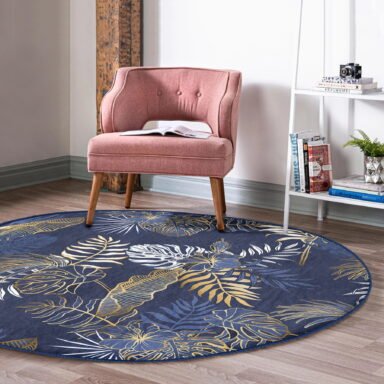 Mavi Zeminde Gold Detaylı Yaprak Desenli Lacivert Salon Ve Oturma Odası Kaymaz Tabanlı Yuvarlak Halı