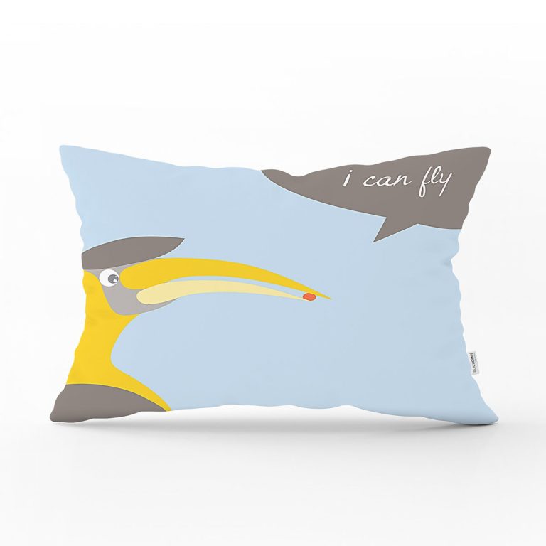 Mavi Zeminde I Can Fly Leylek Motifli Bebek Odası Dikdörtgen Yastık Kırlent Kılıfı
