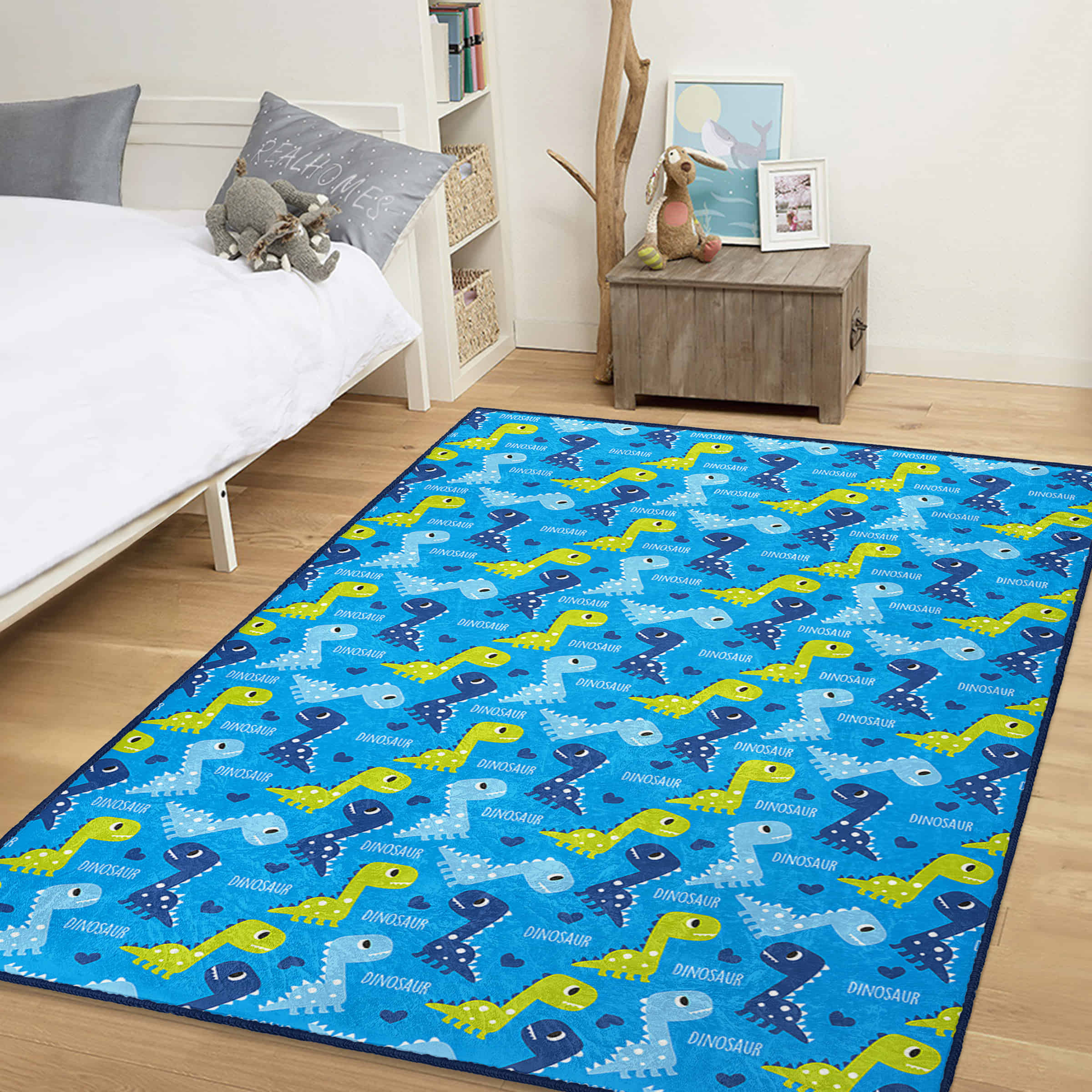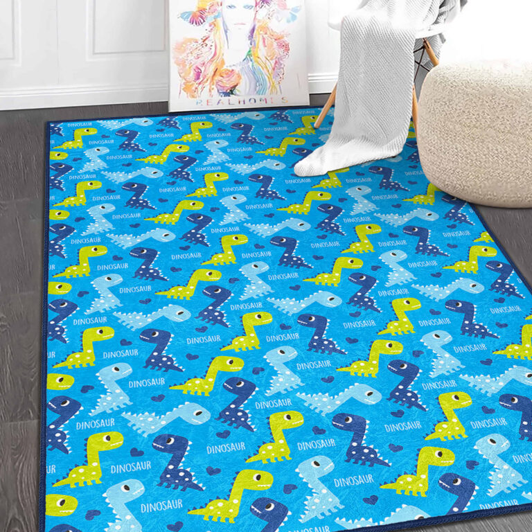 Mavi Zeminde Renkli Dinozor Desenli Makinede Yıkanabilir Kaymaz Taban Çocuk Halısı