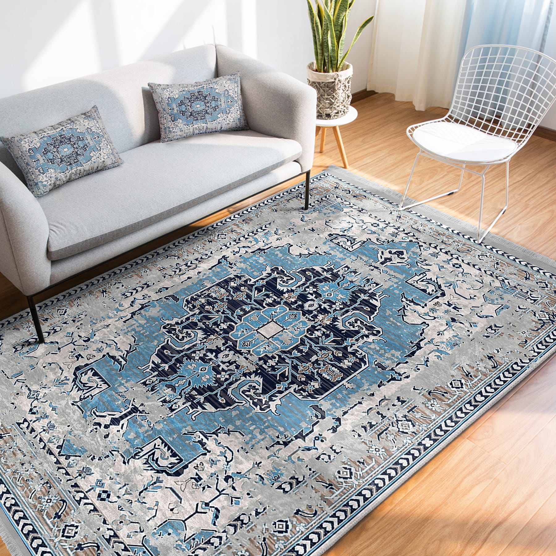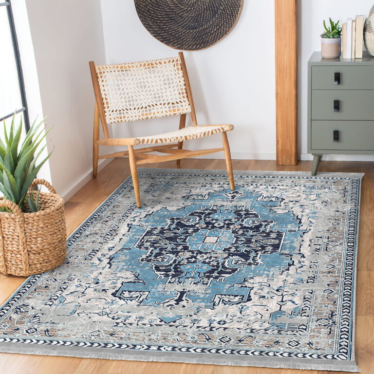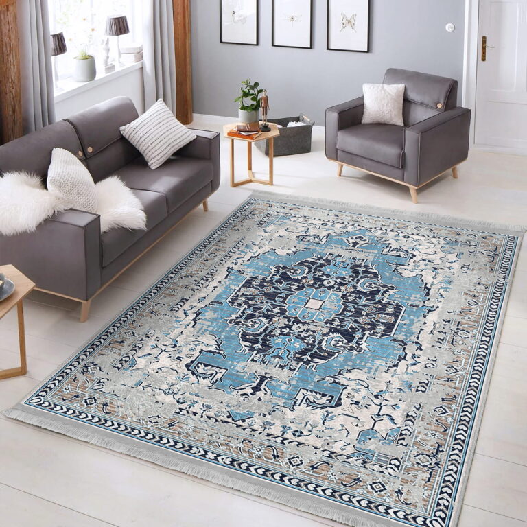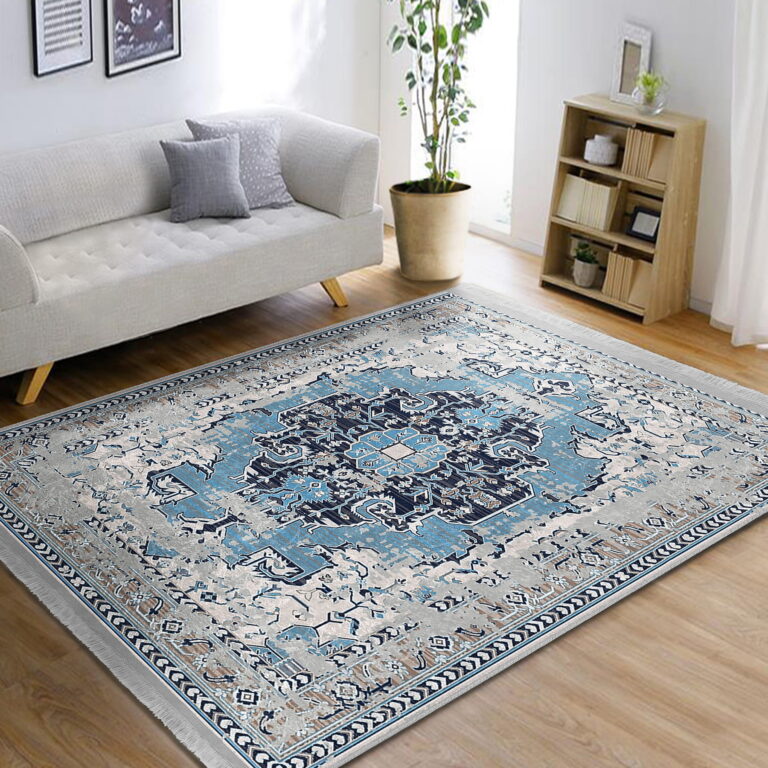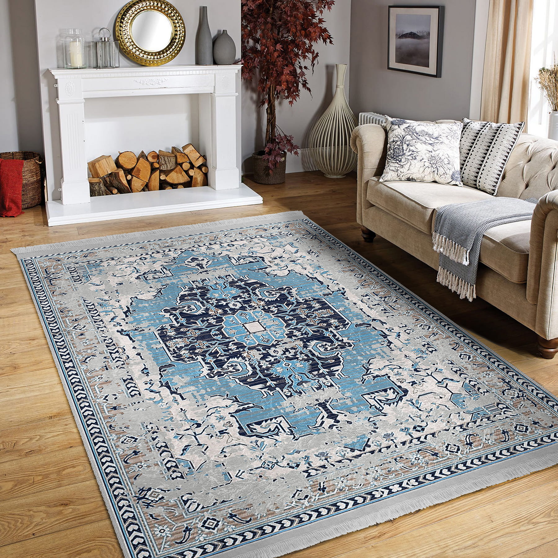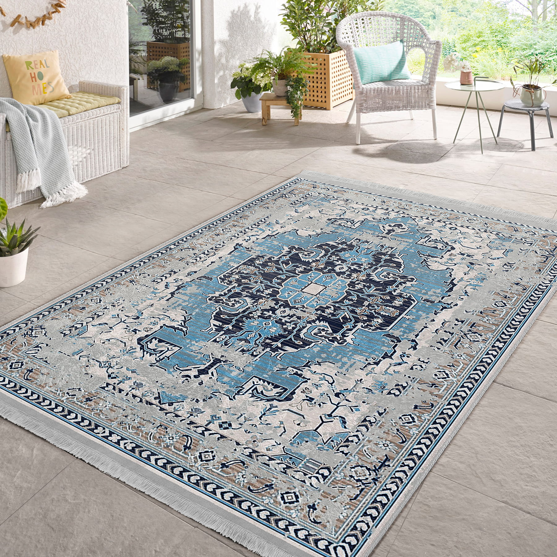 Mavi Zeminde Vintage Motifli Yöresel Desenli Eskitme Motifli Etnik Motifler Salon & Oturma Odası Yatak Odası Dijital Baskılı Makinede Yıkanabilir Kaymaz Taban Saçaklı Halı