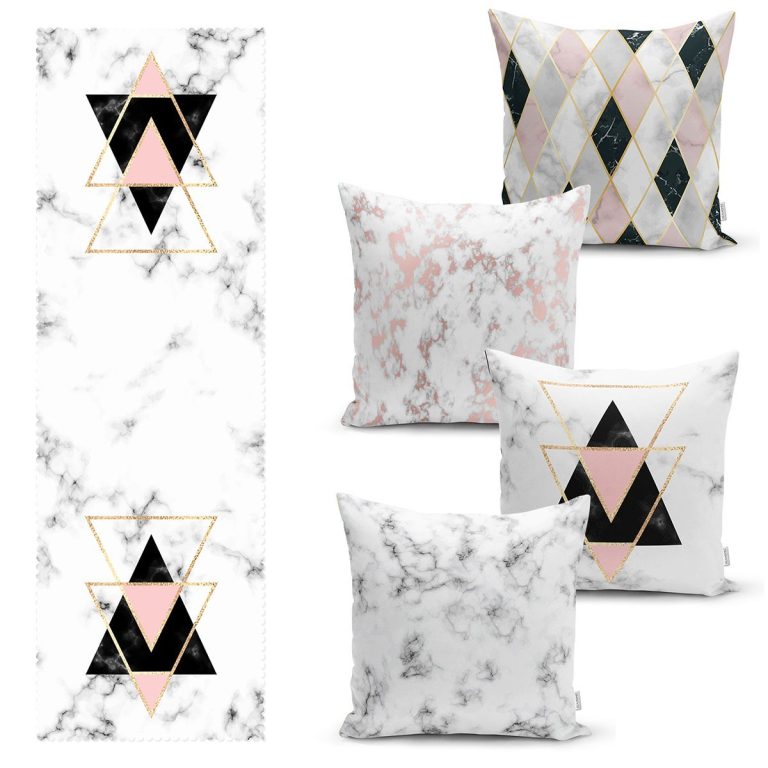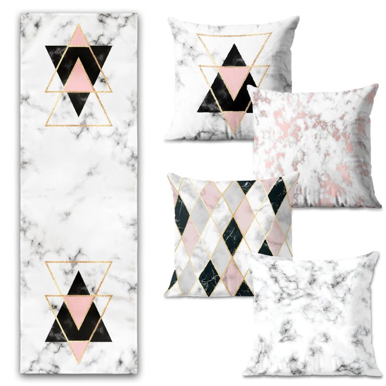 Mermer Zeminli Geometrik Çizimler 4 Kırlent Kılıfı ve 1 Runner Seti