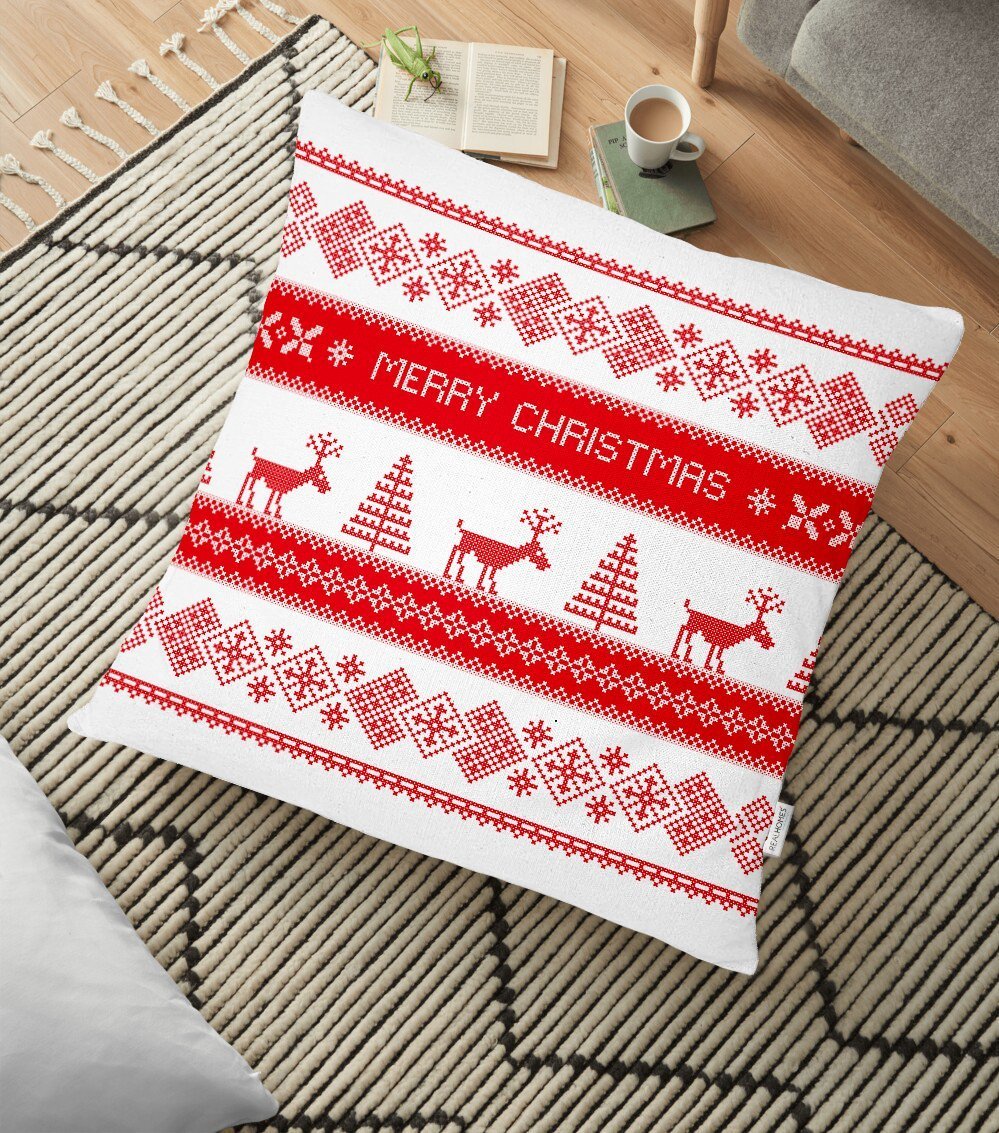 Merry Christmas Kanaviçe Görünümlü Geyikler Baskılı Yer Minderi – 70 x 70 cm