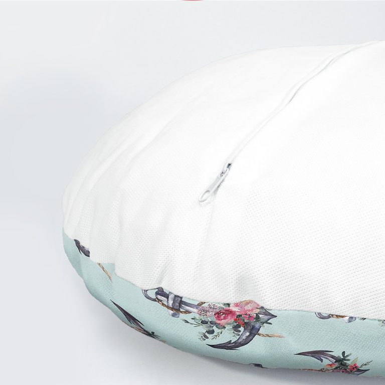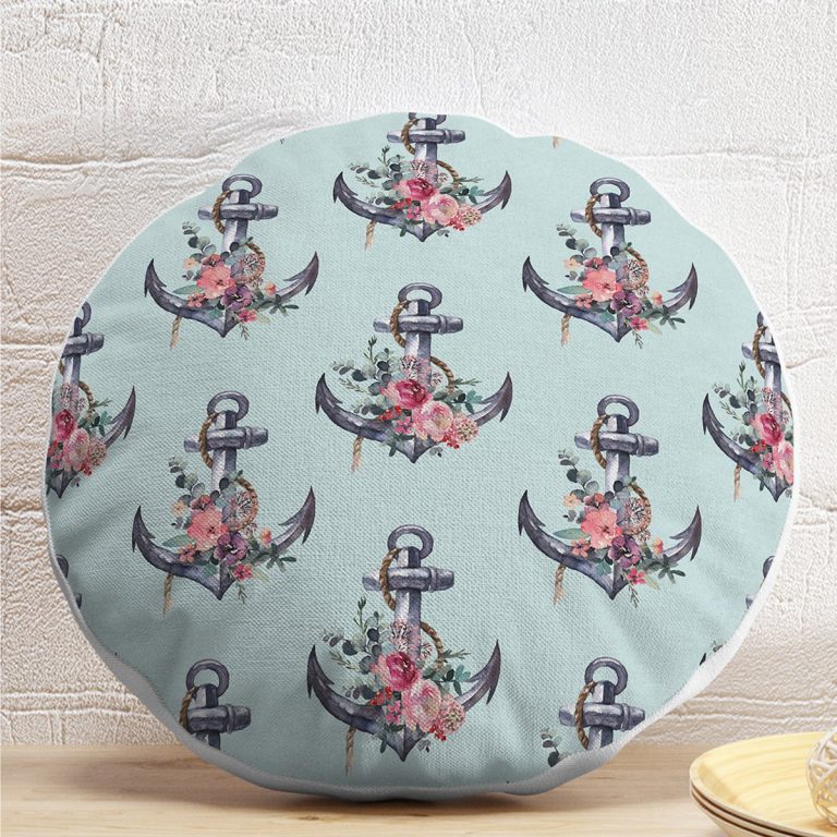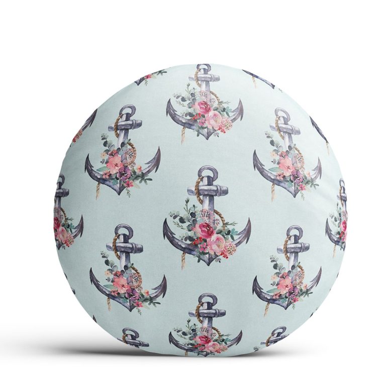 Mint Yeşili Zemin Çapa Tasarımlı Dijital Baskılı Dekoratif Yuvarlak Yastık Kırlent Kılıfı
