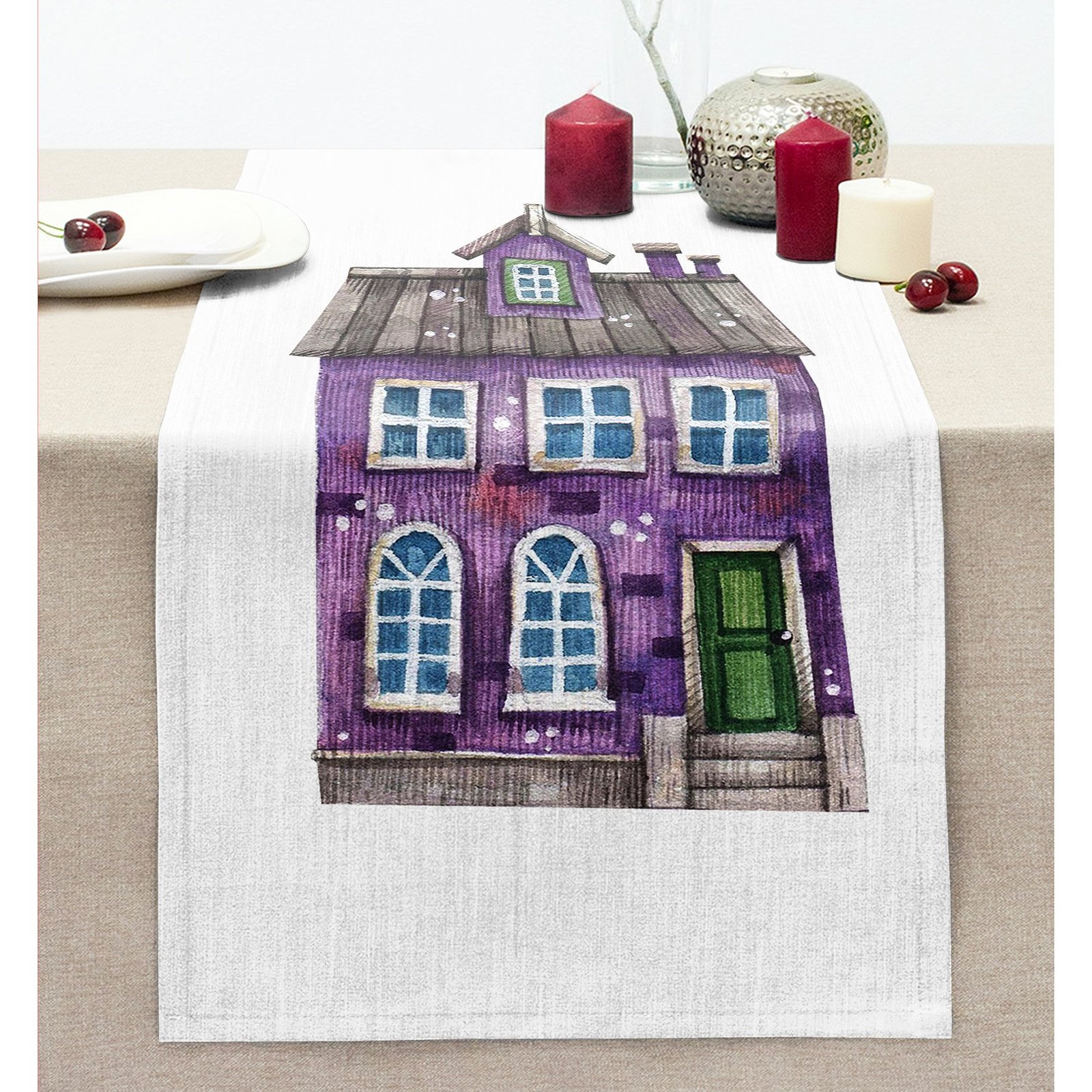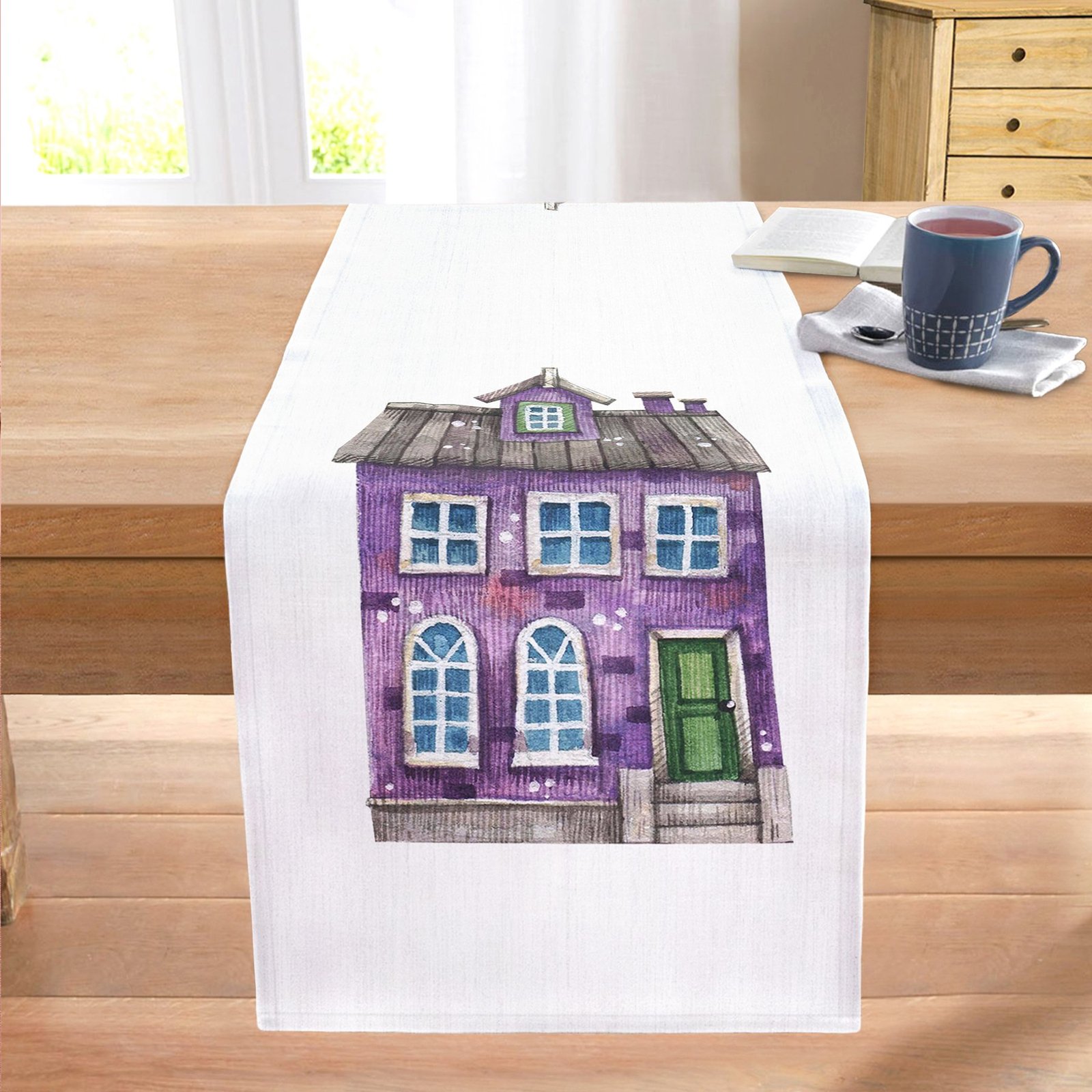 Minyatür Mor Ev Çizimli Dijital Baskılı Modern Dikişli Şönil Runner