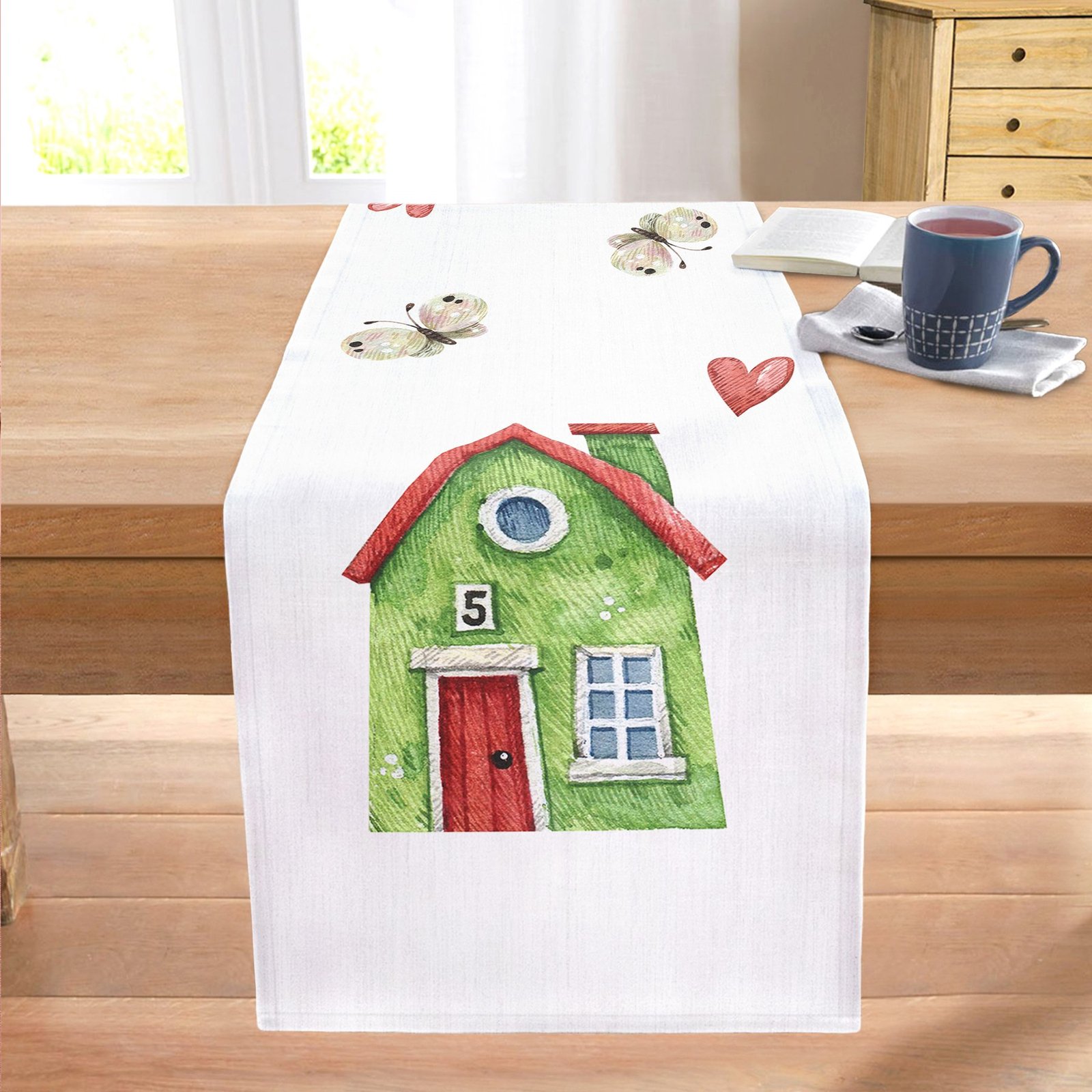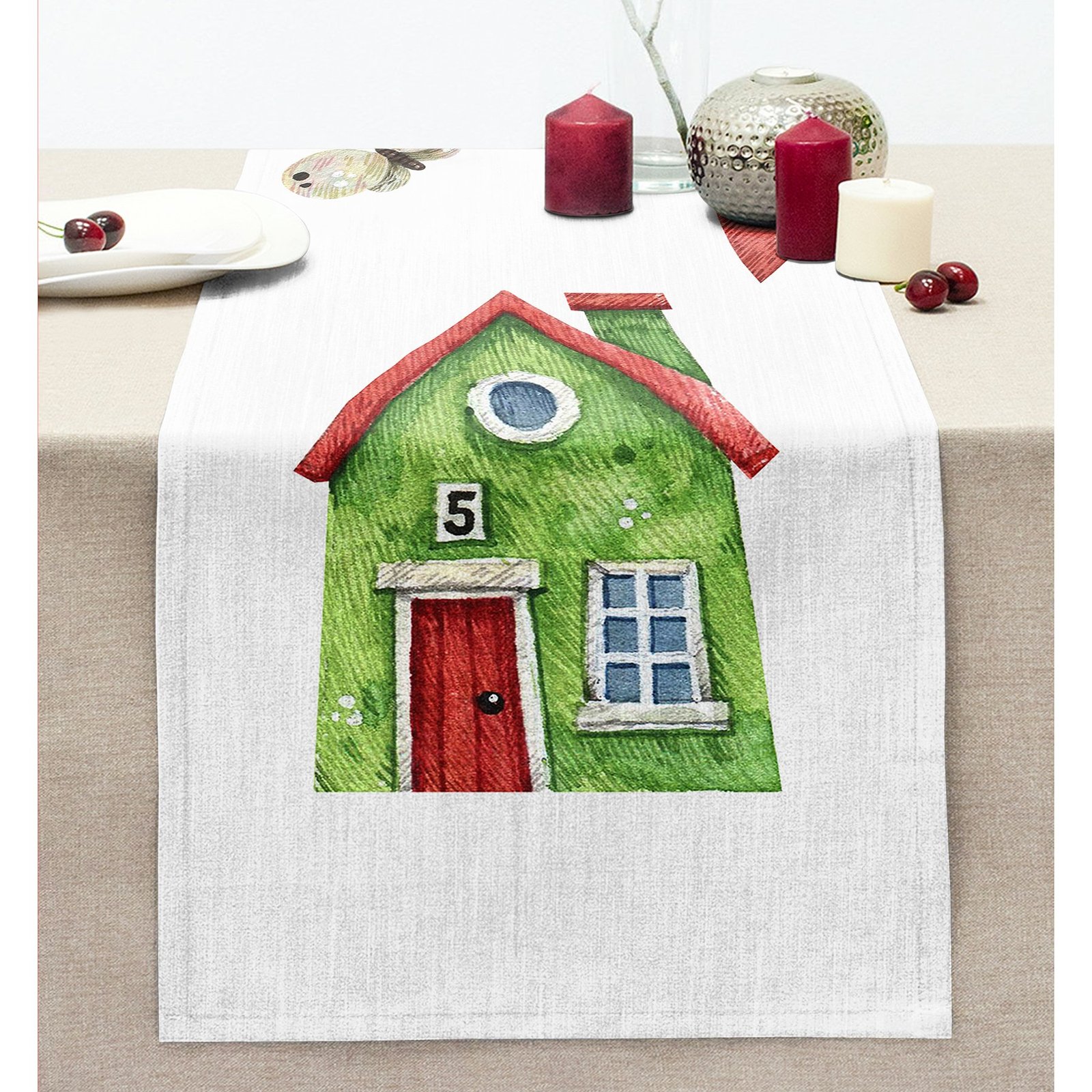 Minyatür Yeşil Ev Çizimli Dijital Baskılı Modern Dikişli Şönil Runner