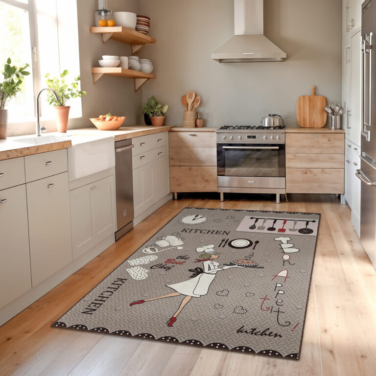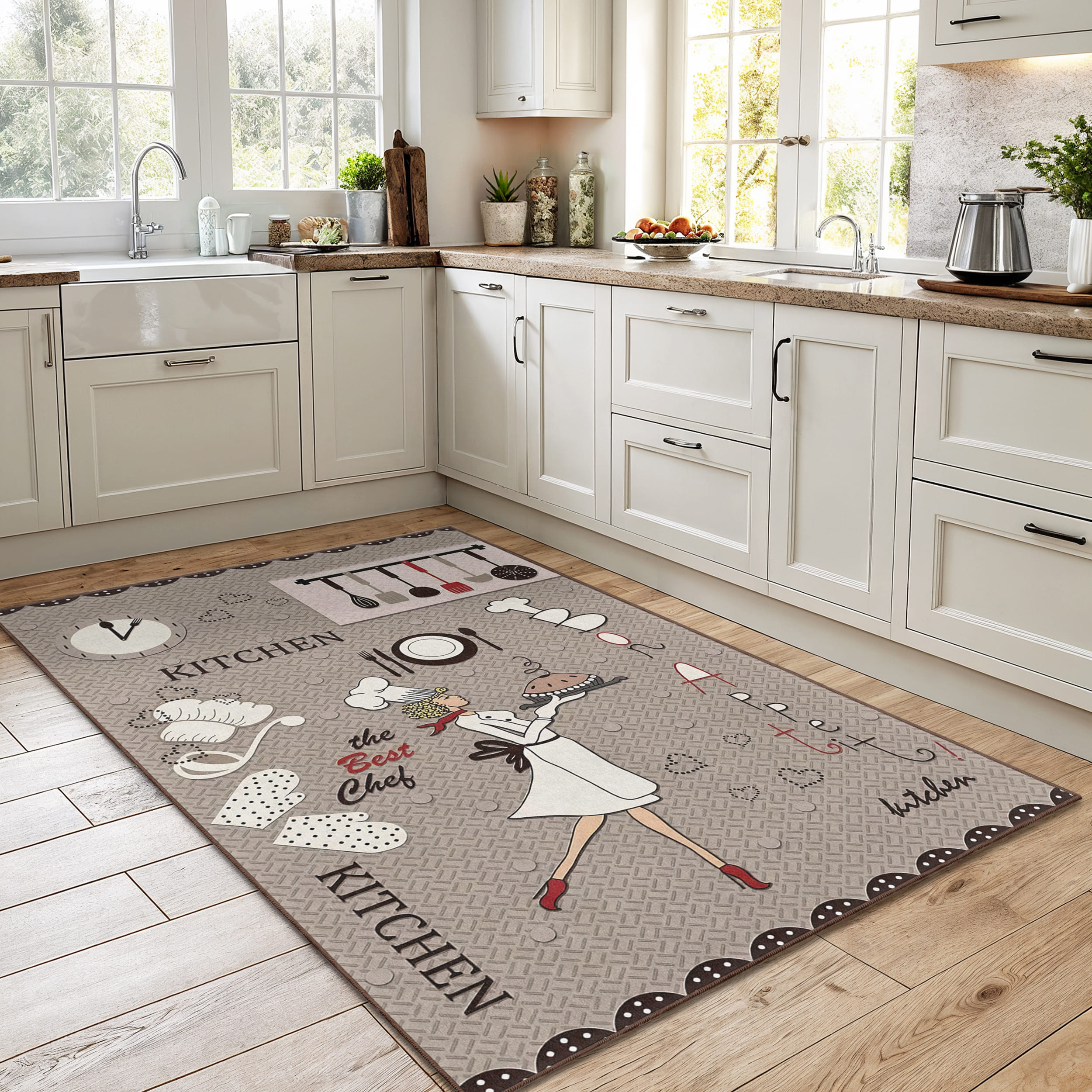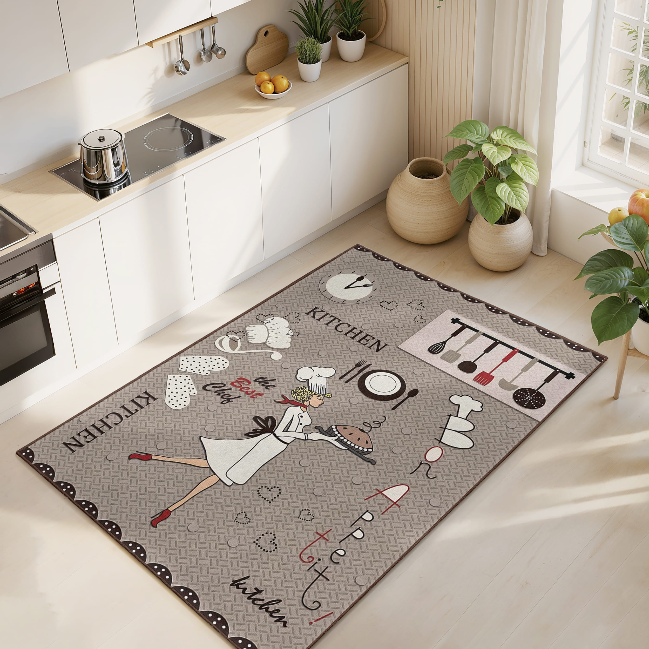 Mutfakta Kullanıma Uygun, Sevimli Aşçı Temalı Kaymaz Tabanlı Yıkanabilir Dikdörtgen Halı