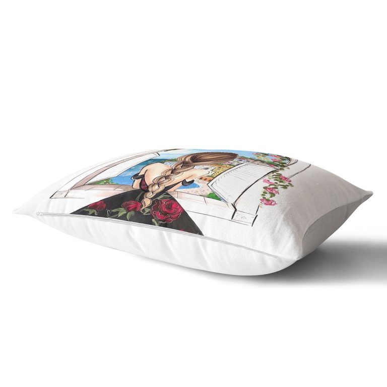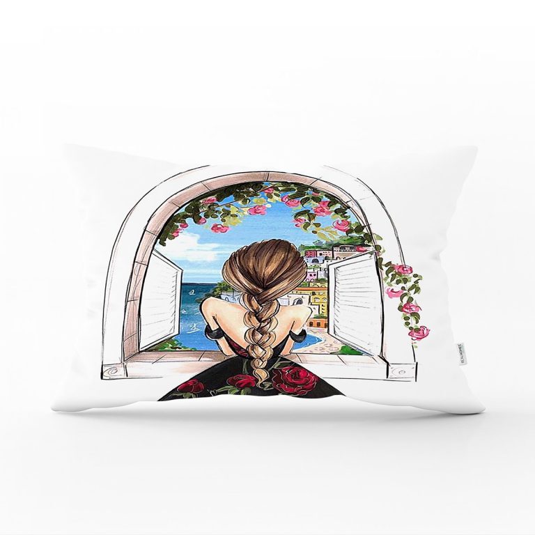 Mutluluk Manzarası Suluboya Çizimli Özel Tasarım Dekoratif Dikdörtgen Yastık Kırlent Kılıfı