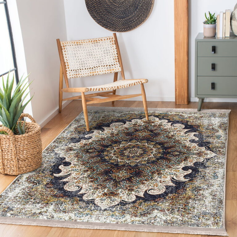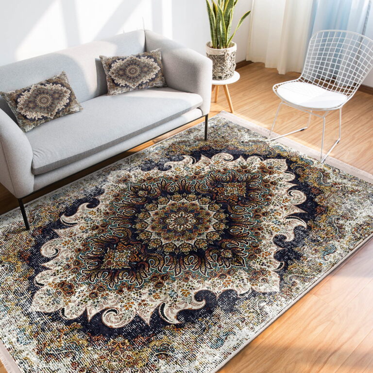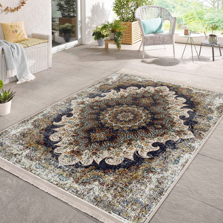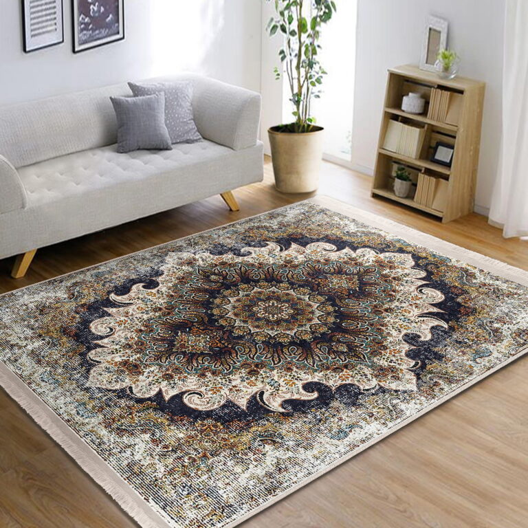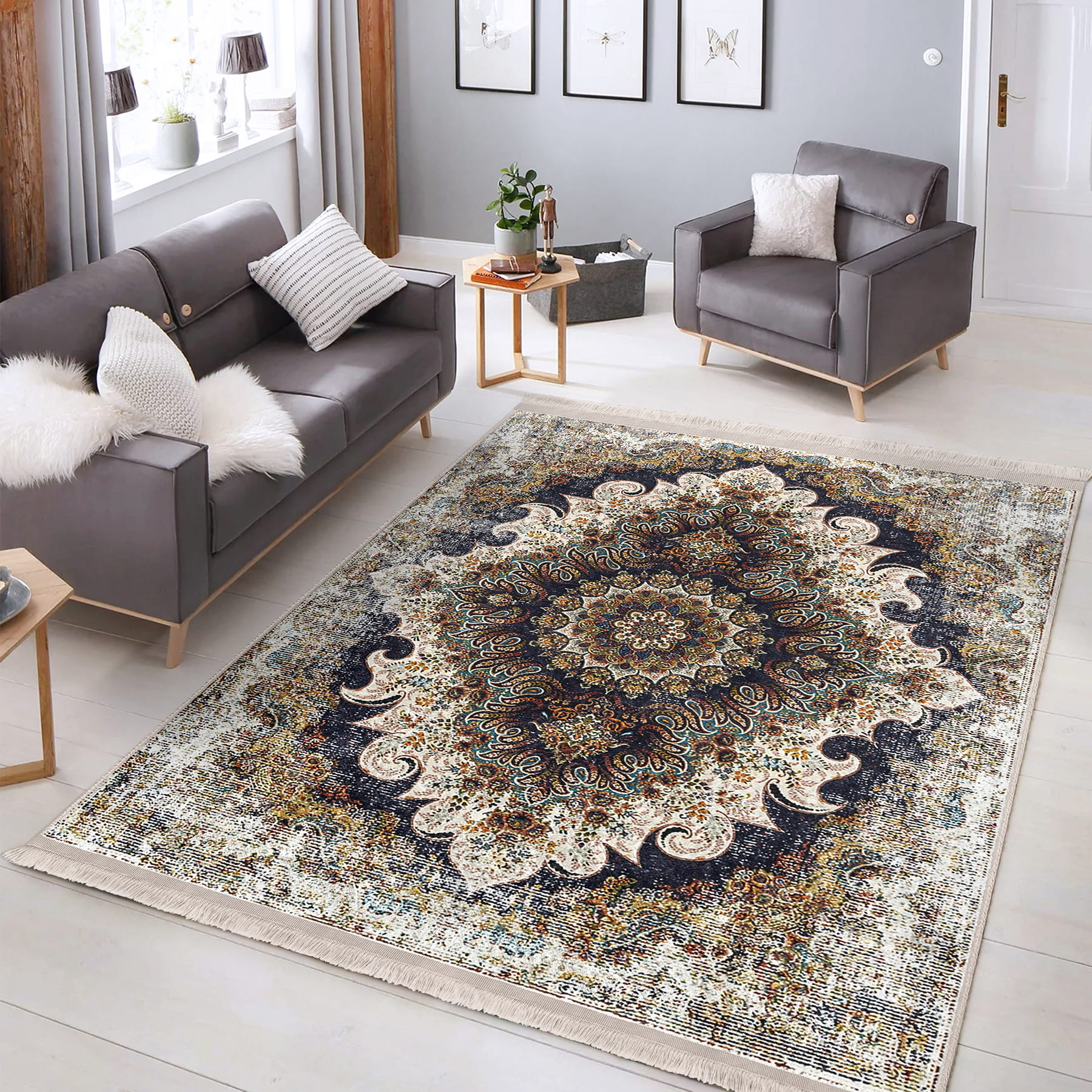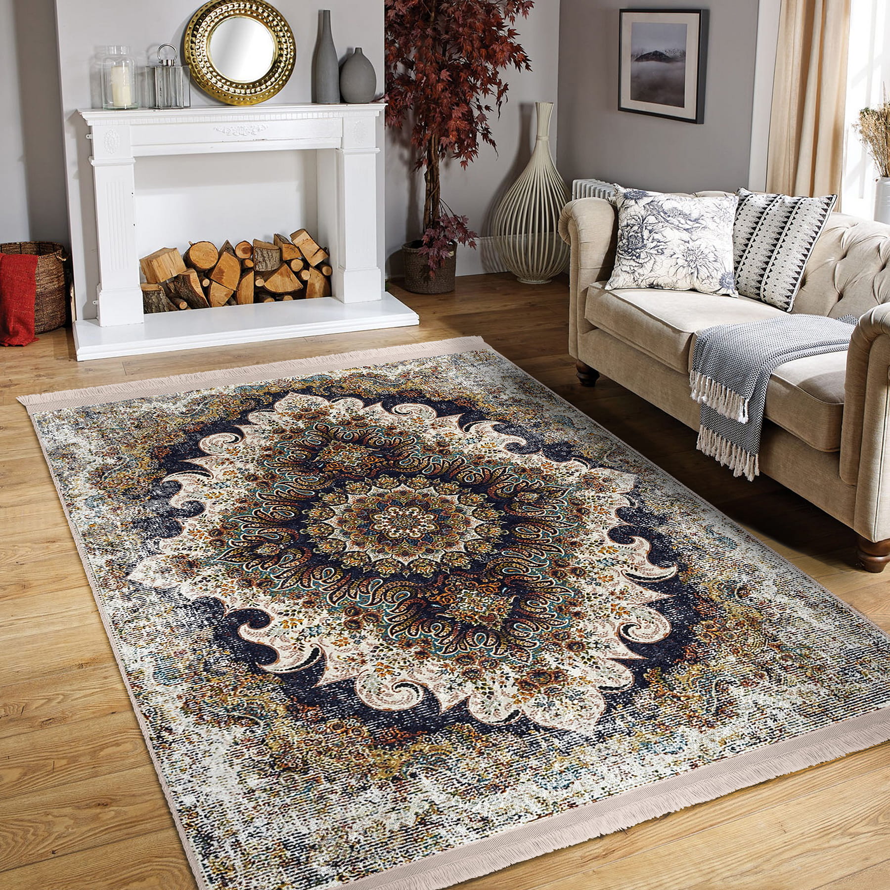 Otantik Zeminde Göbekli Halı Motifli Hereke Desenli Eskitme Motifli Vintage Salon & Oturma Odası Yatak Odası Dijital Baskılı Makinede Yıkanabilir Kaymaz Taban Saçaklı Halı