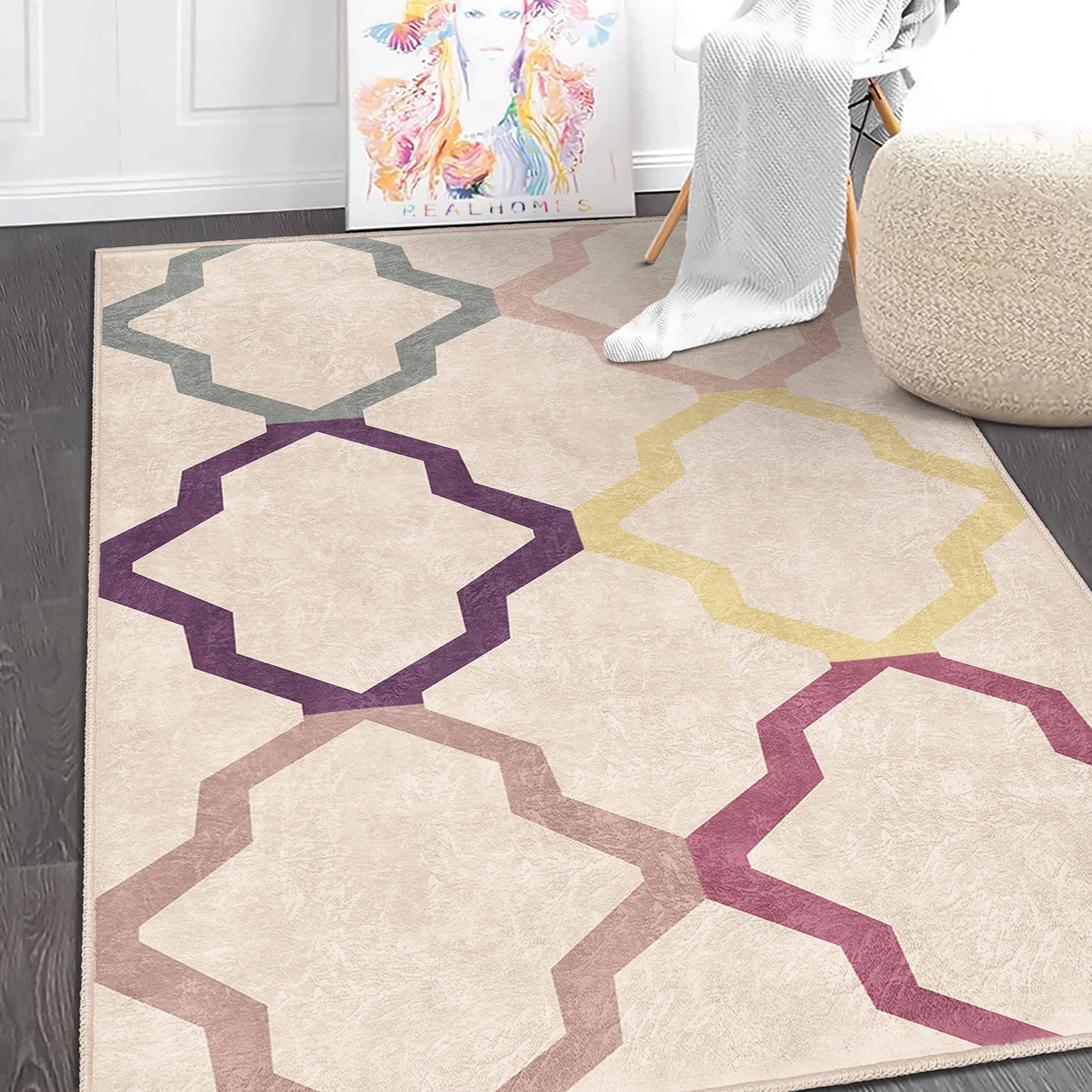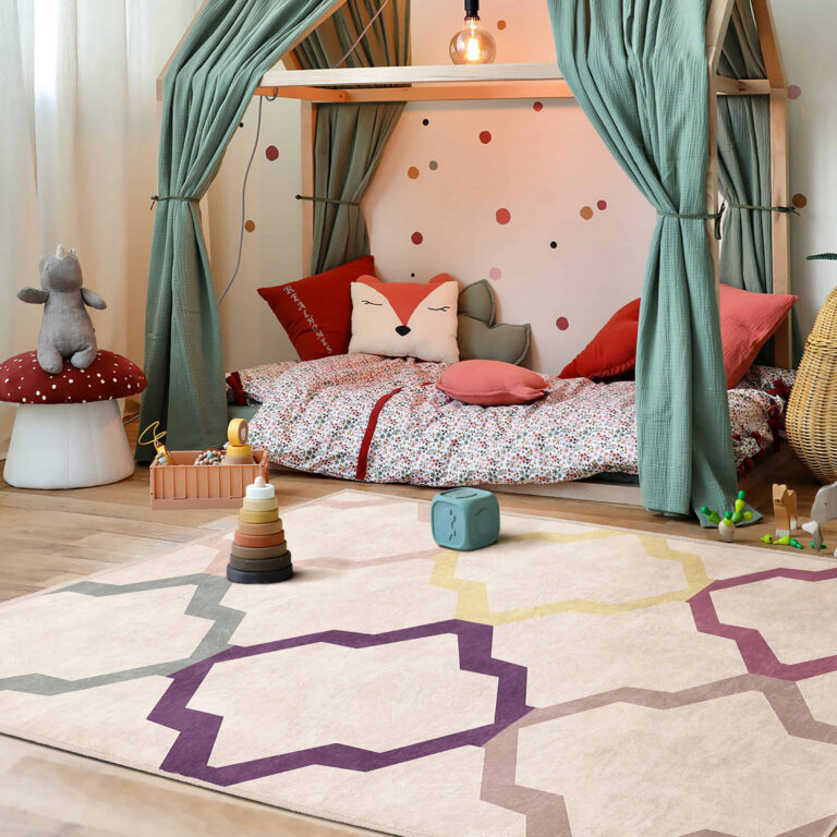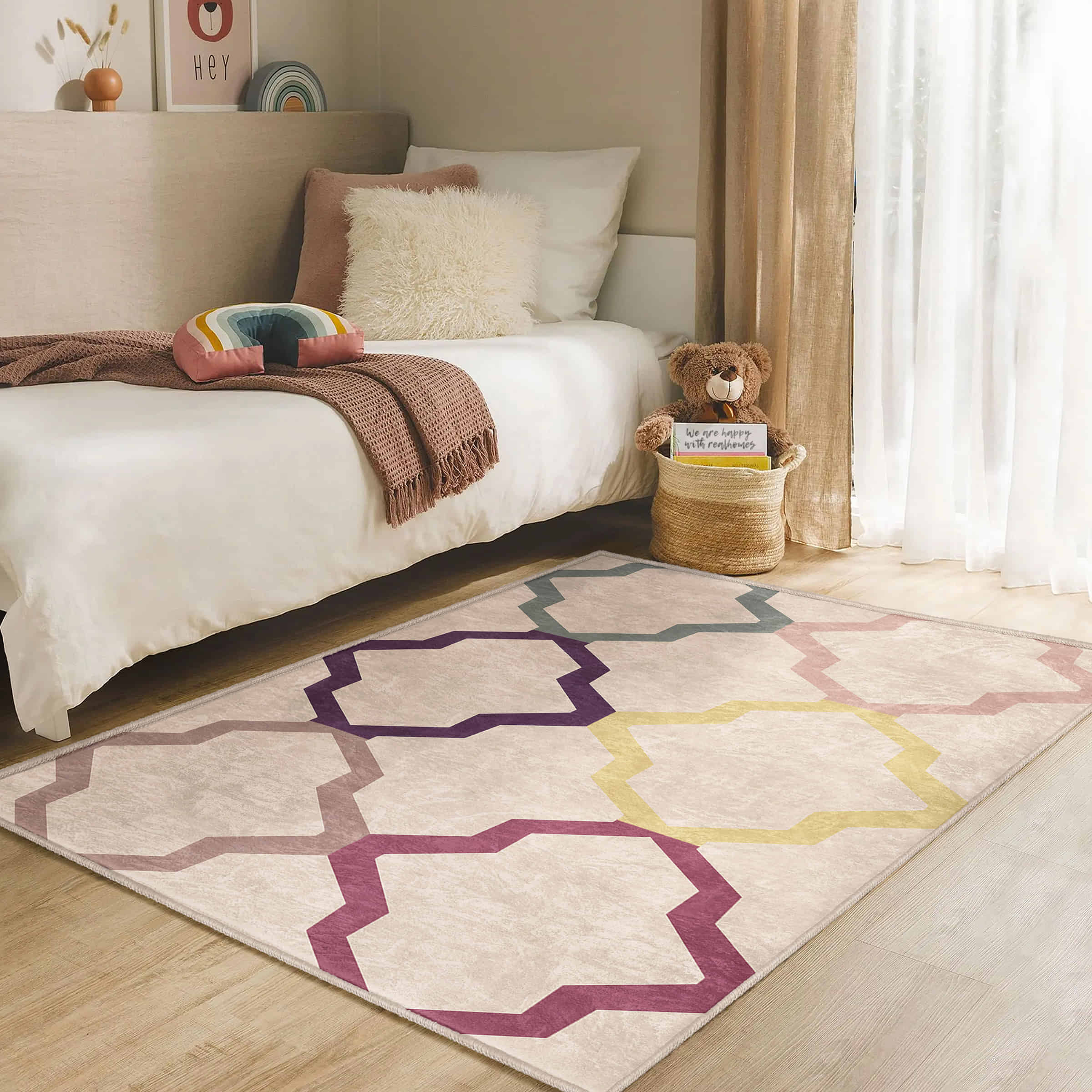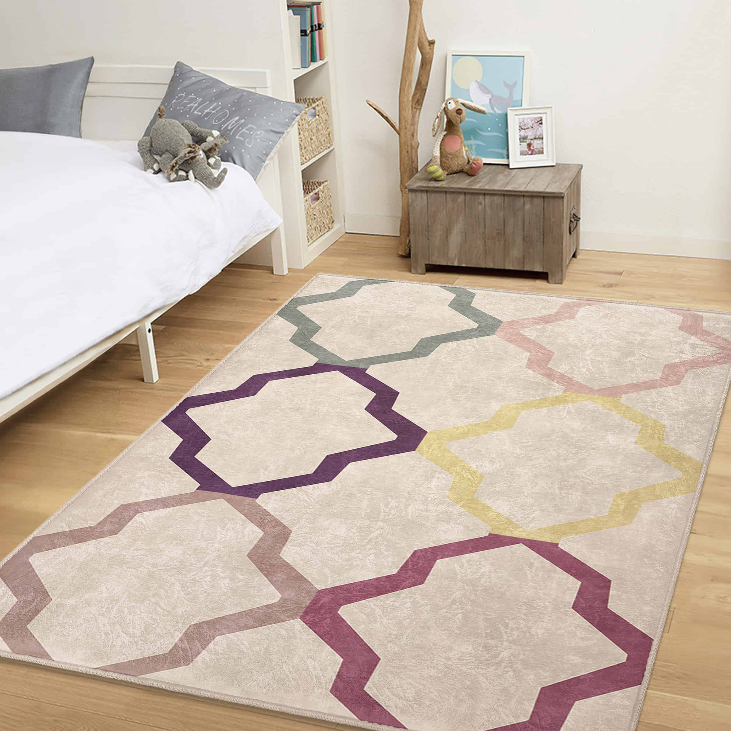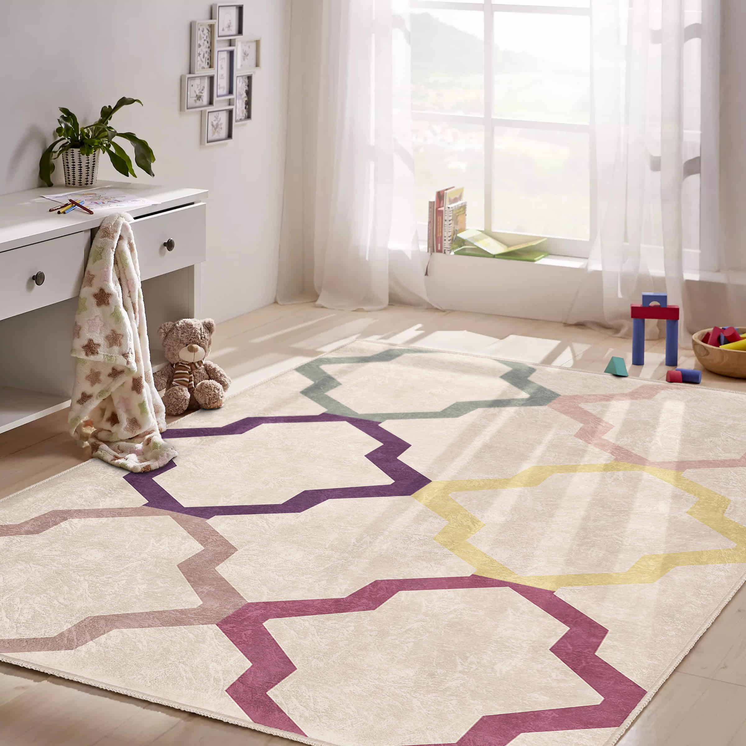 Pastel Renklerle Geometrik Desenli Çocuk Halısı – Kaymaz Tabanlı ve Yıkanabilir Dikdörtgen Tasarım