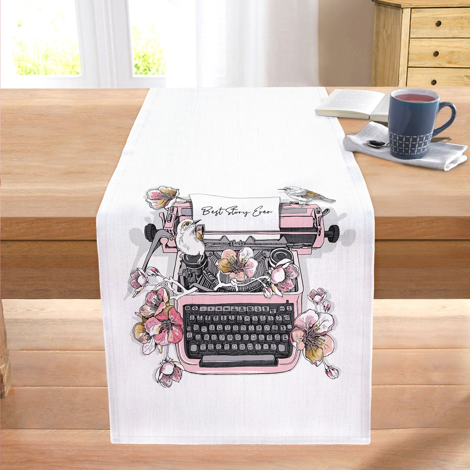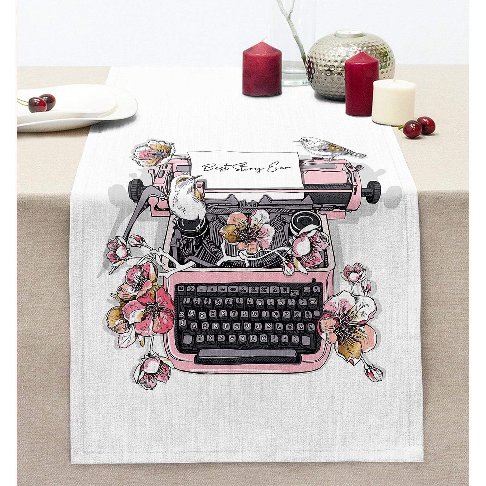 Pembe Antika Daktilo Çizimli Dijital Baskılı Dekoratif Dikişli Şönil Runner