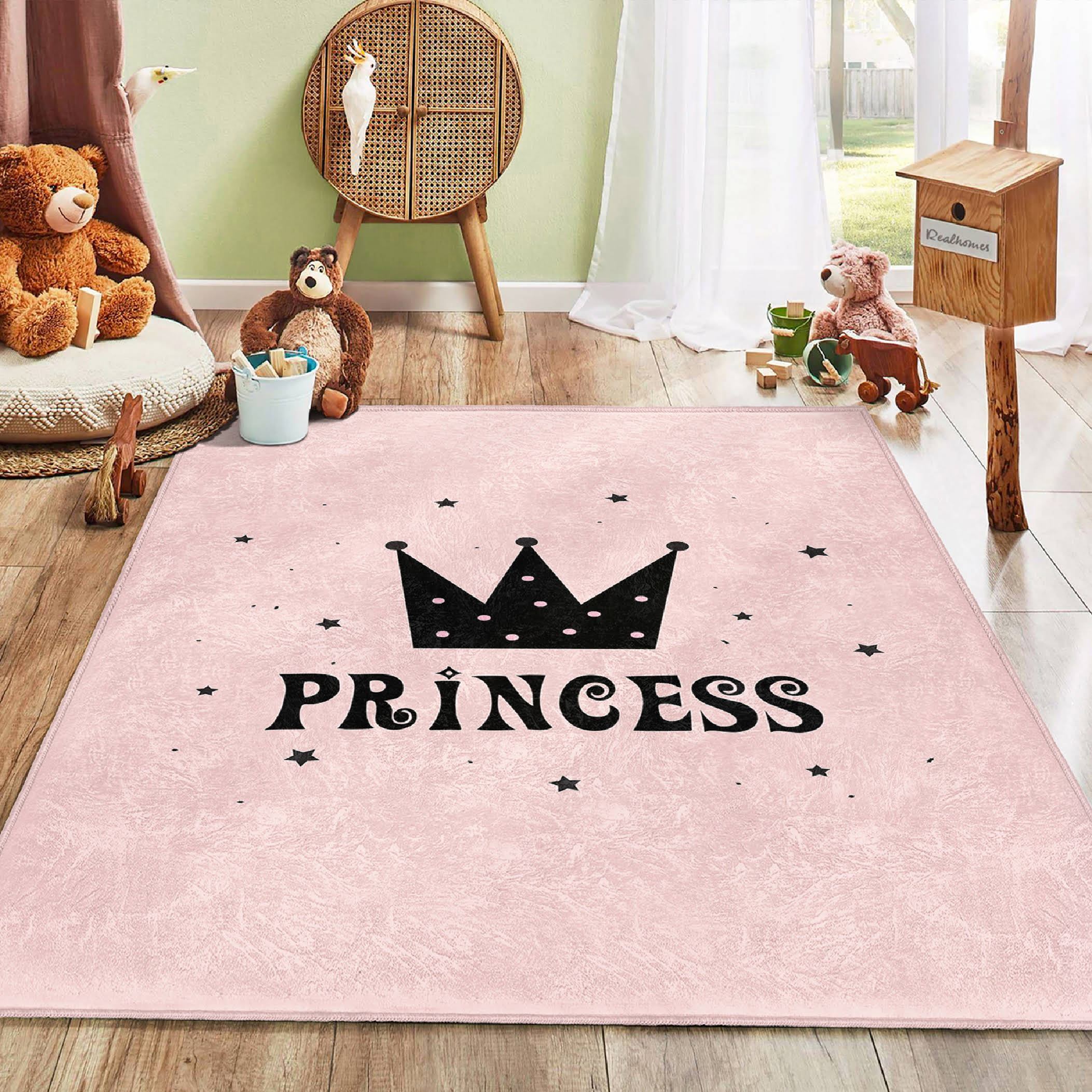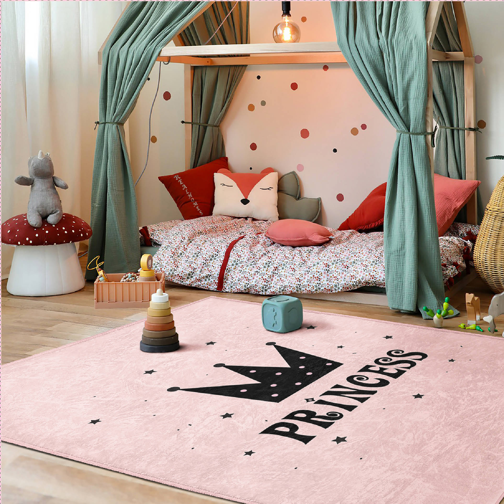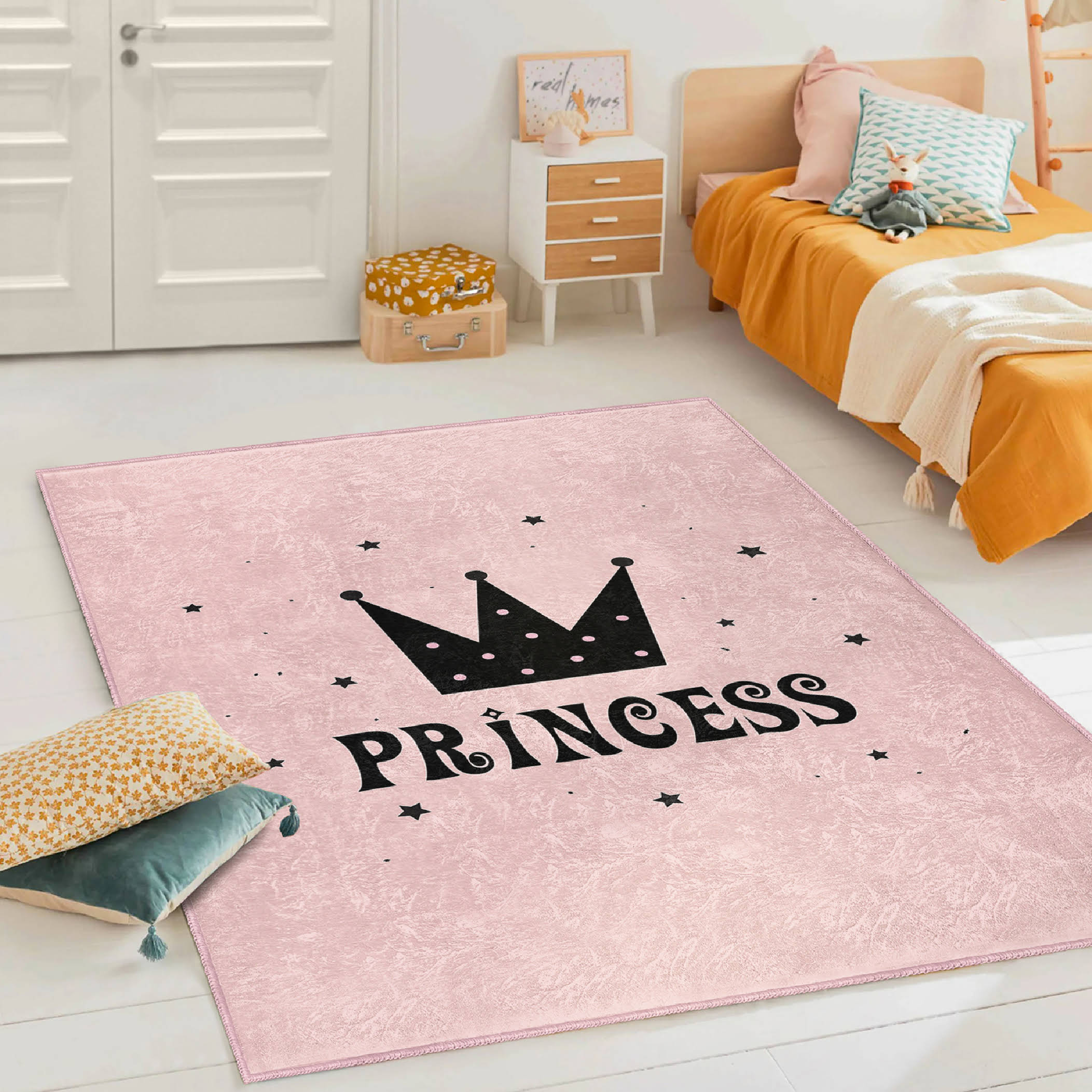 Pembe Arka Planda Siyah Prenses Taçlı Desenli Dikdörtgen Çocuk Halısı – Yıkanabilir Kaymaz Tabanlı